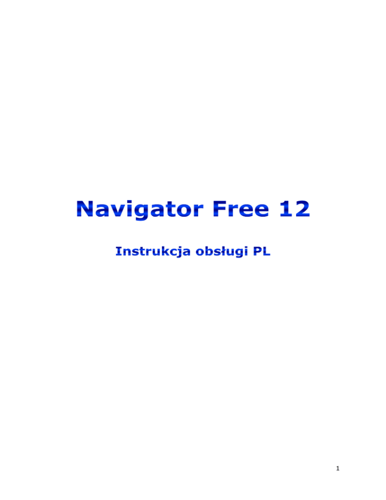 1 Spis treści Spis treści 1. Wstęp ......................................................................................................... 4 1.1. 2. Witaj ....................................................................................................... 4 Instalacja Navigator Free na urządzeniu Vordon ............................................... 6 2.1. Opis......................................................................................................... 6 2.1.1. Pobranie Navigator Free ....................................................................... 6 2.1.2. Instalowanie Navigator Free ................................................................. 7 3. Używanie programu Navigator ......................................................................33 3.1. Konfiguracja ustawień odbiornika GPS w nawigacji. ......................................33 3.2. Ustawianie miejsca docelowego..................................................................37 4. 3.2.1. Z mapy .............................................................................................37 3.2.2. Z menu wyszukiwania .........................................................................37 3.2.3. Wyszukiwanie po adresie ....................................................................38 3.2.4. POI ..................................................................................................40 3.2.5. Ulubione ...........................................................................................41 3.2.6. Wyszukiwanie w Internecie..................................................................42 Nawigacja ..................................................................................................42 4.1. 5. Najważniejsze przyciski ..........................................................................43 Menu Navigator ...........................................................................................45 5.1. Licznik .................................................................................................45 5.2. Tryb nocny ...........................................................................................46 5.3. Ustawienia ...........................................................................................46 5.3.1 GPS .....................................................................................................47 5.3.2 Nawigacja ............................................................................................47 5.3.3. TMC.....................................................................................................48 5.3.4. Śledzenie .............................................................................................48 5.3.5. Ostrzeżenia o fotoradarach .....................................................................48 5.3.6. Aplikacja ..............................................................................................49 5.3.6.1. Schematy kolorów ...........................................................................49 5.3.6.2. Klawiatura ......................................................................................49 5.3.6.3. Jednostki metryczne i imperialne.......................................................50 5.3.6.4. Język .............................................................................................50 5.3.6.5. Klucz produktu................................................................................50 2 Część I 3 1. Wstęp 1.1. Witaj Dziękujemy za wybranie Navigator Free 12. Ten program jest zaprojektowany, aby ułatwić Twoje życie. Nawigacja działa w większości państw europejskich, USA, Kanadzie i wielu innych krajach. Navigator Free 12 obsługuje dwie platformy: - Pocket Navigator przeznaczona jest do komputera z uruchomionym PDA Pocket 2003, Windows Mobile 5/6 lub WindowsCE.NET 4,2 / 5. - Nawigator PC jest dla komputerów z systemem Windows XP / Vista (laptopy, TabletPC, CarPC, UMPC podobny) i Windows 7. Instrukcja obsługi WAŻNE „Niniejsze instrukcja Navigator Free 12 która jest dostępna na wiele rodzaju zastosowana, dlatego część opisów nie część dostępna jest po wykupieni licencji nie opisuje wszystkich funkcji mapy, urządzeń w których może być ona dotyczy użytkowania GPS VORDON a komercyjnej.” 4 Część II 5 2. Instalacja Navigator Free na urządzeniu Vordon 2.1. Opis 2.1.1. Pobranie Navigator Free Navigator 12 dostępny http://navigatorfree.mapfactor.com/en/ jest pod adresem Aby rozpocząć instalację oprogramowania Navigator Free wraz z mapami należy pobrać program ze strony producenta. Wybierz „Download Navigator”. Następnie kliknij „Download Setup Utility”. Po pobraniu na komputer programu NavigatorFree_install.exe uruchamiamy instalator. 6 2.1.2. Instalowanie Navigator Free Jeżeli pobierałeś Navigator Free z Internetu, otwórz pobranego instalatora (NavigatorFree_install.exe). Po uruchomieniu instalatora kliknij „Uruchom” a następnie „TAK”. Wybierz język instalacji. 7 Uruchomi się instalacja Navigator 12 Kliknij „Dalej”. Wybierz folder instalacji i kliknij „Dalej”. 8 Kliknij „Dalej”. Kliknij „Dalej”. 9 Kliknij „Instaluj”. Poczekaj, aż instalator zainstaluje Navigator Free na twoim komputerze. 10 Następnie automatycznie wyskoczy okienko: Kliknij „Use free key” Następnie kliknij „Ok”. Po prawidłowej instalacji zostanie wyświetlony komunikat. Kliknij „Ok”. Następnie wybieramy folder do którego będą pobierane mapy. I klikamy „Ok”. Automatycznie powinno wyskoczyć okno. 11 12 Przed rozpoczęciem instalacji map uruchom GPS i wybierz opcję USB W następnym oknie zaznaczamy „MASS STORAGE „ Teraz możemy podłączyć nawigację kablem USB dostępnym w komplecie. Przechodzimy do instalacji map na urządzeniu VORDON. 13 Wybierz Przycisk „Zainstaluj aplikację”. 14 W tym punkcie wybieramy rodzaj instalowanego oprogramowania. Interesuje nas 