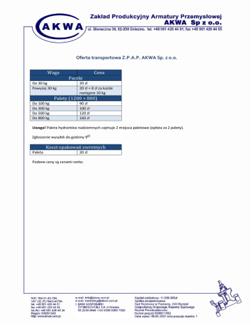 Oferta transportowa Z.P.A.P. AKWA Sp. z o.o. Waga Cena Paczki Do 30 kg Powyżej 30 kg 20 zł 20 zł + 8 zł za każde następne 10 kg Palety (1200 × 800) Do 100 kg Do 300 kg Do 500 kg Do 800 kg 90 zł 100 zł 120 zł 160 zł Uwaga! Paleta hydrantów nadziemnych zajmuje 2 miejsca paletowe (opłata za 2 palety). Zgłoszenie wysyłek do godziny 900 Koszt opakowań zwrotnych Paleta 20 zł Podane ceny są cenami netto.