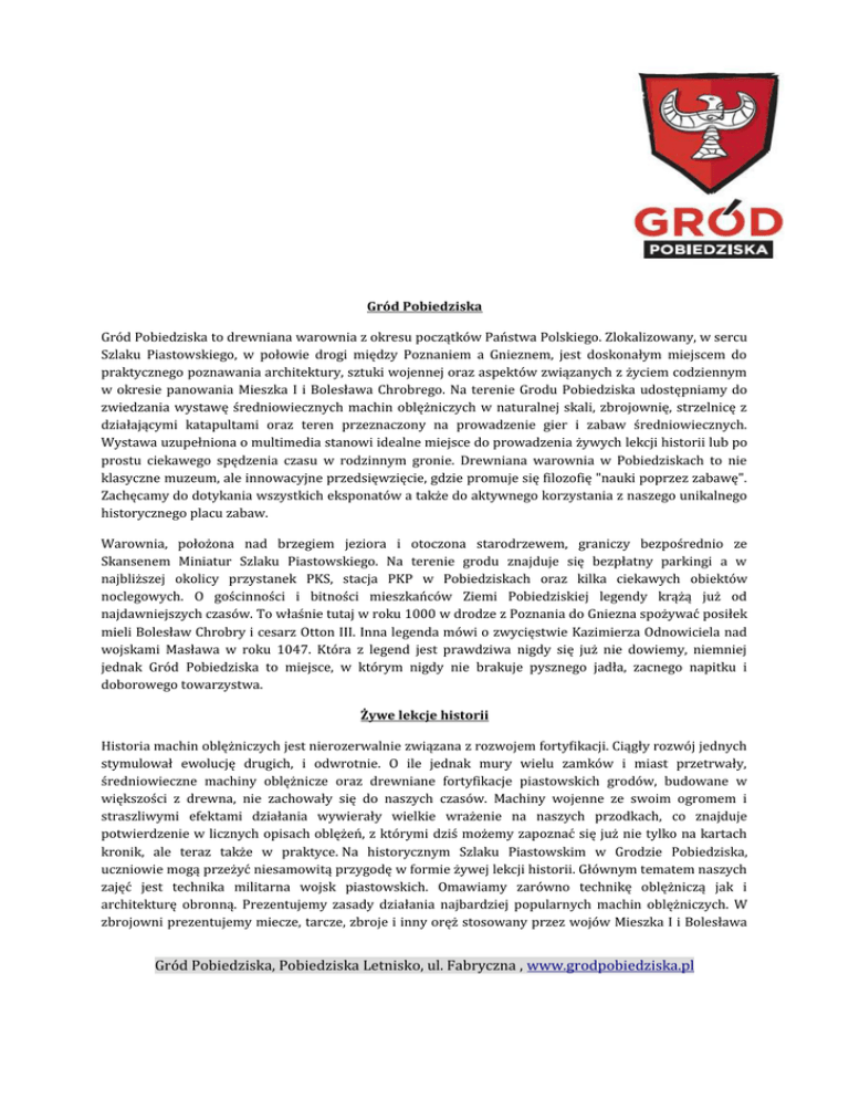 Gród Pobiedziska Gród Pobiedziska to drewniana warownia z okresu początków Państwa Polskiego. Zlokalizowany, w sercu Szlaku Piastowskiego, w połowie drogi między Poznaniem a Gnieznem, jest doskonałym miejscem do praktycznego poznawania architektury, sztuki wojennej oraz aspektów związanych z życiem codziennym w okresie panowania Mieszka I i Bolesława Chrobrego. Na terenie Grodu Pobiedziska udostępniamy do zwiedzania wystawę średniowiecznych machin oblężniczych w naturalnej skali, zbrojownię, strzelnicę z działającymi katapultami oraz teren przeznaczony na prowadzenie gier i zabaw średniowiecznych. Wystawa uzupełniona o multimedia stanowi idealne miejsce do prowadzenia żywych lekcji historii lub po prostu ciekawego spędzenia czasu w rodzinnym gronie. Drewniana warownia w Pobiedziskach to nie klasyczne muzeum, ale innowacyjne przedsięwzięcie, gdzie promuje się filozofię "nauki poprzez zabawę". Zachęcamy do dotykania wszystkich eksponatów a także do aktywnego korzystania z naszego unikalnego historycznego placu zabaw. Warownia, położona nad brzegiem jeziora i otoczona starodrzewem, graniczy bezpośrednio ze Skansenem Miniatur Szlaku Piastowskiego. Na terenie grodu znajduje się bezpłatny parkingi a w najbliższej okolicy przystanek PKS, stacja PKP w Pobiedziskach oraz kilka ciekawych obiektów noclegowych. O gościnności i bitności mieszkańców Ziemi Pobiedziskiej legendy krążą już od najdawniejszych czasów. To właśnie tutaj w roku 1000 w drodze z Poznania do Gniezna spożywać posiłek mieli Bolesław Chrobry i cesarz Otton III. Inna legenda mówi o zwycięstwie Kazimierza Odnowiciela nad wojskami Masława w roku 1047. Która z legend jest prawdziwa nigdy się już nie dowiemy, niemniej jednak Gród Pobiedziska to miejsce, w którym nigdy nie brakuje pysznego jadła, zacnego napitku i doborowego towarzystwa. Żywe lekcje historii Historia machin oblężniczych jest nierozerwalnie związana z rozwojem fortyfikacji. Ciągły rozwój jednych stymulował ewolucję drugich, i odwrotnie. O ile jednak mury wielu zamków i miast przetrwały, średniowieczne machiny oblężnicze oraz drewniane fortyfikacje piastowskich grodów, budowane w większości z drewna, nie zachowały się do naszych czasów. Machiny wojenne ze swoim ogromem i straszliwymi efektami działania wywierały wielkie wrażenie na naszych przodkach, co znajduje potwierdzenie w licznych opisach oblężeń, z którymi dziś możemy zapoznać się już nie tylko na kartach kronik, ale teraz także w praktyce. Na historycznym Szlaku Piastowskim w Grodzie Pobiedziska, uczniowie mogą przeżyć niesamowitą przygodę w formie żywej lekcji historii. Głównym tematem naszych zajęć jest technika militarna wojsk piastowskich. Omawiamy zarówno technikę oblężniczą jak i architekturę obronną. Prezentujemy zasady działania najbardziej popularnych machin oblężniczych. W zbrojowni prezentujemy miecze, tarcze, zbroje i inny oręż stosowany przez wojów Mieszka I i Bolesława Gród Pobiedziska, Pobiedziska Letnisko, ul. Fabryczna , www.grodpobiedziska.pl Chrobrego. Największą jednak estymą naszych gości cieszą się zawsze pokazy działania średniowiecznych katapult z Gigantycznym Trebuszem na czele. Nasi najmłodsi goście dużo czasu spędzają na unikalnym historycznym placu zabaw. Nagrody Gród Pobiedziska to inicjatywa stosunkowo nowa, wartościowa i ciekawa. Ideą jego powstania było prowadzenie żywych lekcji historii zgodnie z najnowszym trendem w turystyce edukacyjnej i kulturowej, czyli 3 x E (education, entertainment, excitement). Polega on na dostarczaniu zwiedzającym zarówno rozrywki, edukacji jak i silnego dreszczyku emocji. Od początku naszej działalności idea interaktywnej wystawy spotkała się z bardzo pozytywnym przyjęciem środowiska turystycznego. W roku 2012 Gród Pobiedziska wyróżniony został w Gnieźnie statuetką „Promotor Turystyki”. W roku 2013 komes Grodu Pobiedziska, Pan Bartosz Styszyński za swoje osiągnięcia powołany został przez Marszałka Województwa Wielkopolskiego pana Marka Woźniaka w skład Rady Naukowo-Programowej ds. Szlaku Piastowskiego. W tym samym roku 2013 Gród Pobiedziska został wyróżniony na gali Wielkopolskiej Organizacji Turystycznej. W roku 2014 na tej samej gali Gród Pobiedziska otrzymał nagrodę dla Najlepszego Produktu Turystycznego i został tym samym nominowany do reprezentowania Wielkopolski na gali Polskiej Organizacji Turystycznej w Warszawie. Wszystkie te nagrody i wyróżnienia mobilizują nas do jeszcze bardziej wytężonej pracy… Infrastruktura Do dyspozycji naszych gości oddajemy średniowieczny gród wybudowany na planie koła o średnicy 50 metrów. Pole piknikowe, otaczające naszą warownię ma około 1,5 hektara powierzchni. Teren uzbrojony jest w energię elektryczną (siła) oraz wodę. Poza tym dysponujemy ubikacją z umywalką, bezpłatnym parkingiem dla 100 samochodów, dwoma namiotami cateringowymi o łącznej powierzchni 75 m2 oraz unikalną średniowieczną strzelnicą z machinami oblężniczymi w naturalnej skali. Dla najmłodszych gości przygotowaliśmy unikalny historyczny plac zabaw. Lokalna tabela odległości: Przystanek PKS – 700 metrów Stacja PKP – 2 kilometry Poznań – 25 kilometrów Gniezno – 24 kilometry Września – 37 kilometrów Swarzędz – 16 kilometrów Wągrowiec – 50 kilometrów Szamotuły – 60 kilometrów Śrem – 70 kilometrów Tarnowo Podgórne – 42 kilometry Środa WLKP – 35 kilometrów Gród Pobiedziska, Pobiedziska Letnisko, ul. Fabryczna , www.grodpobiedziska.pl Kostrzyn - 14 kilometrów Pakiety: Pakiet Grodowy Cena: 5 PLN/osoba + Przewodnik 50 PLN W skład Pakietu Grodowego wchodzi: - zwiedzanie Grodu Pobiedziska - zwiedzanie wystawy machin oblężniczych - pokaz uzbrojenia - historyczny plac zabaw - usługa przewodnika Szacunkowy czas trwania żywej lekcji historii w Pakiecie Grodowym wynosi 45 minut. Pakiet Komesa Cena: 8 PLN/osoba 