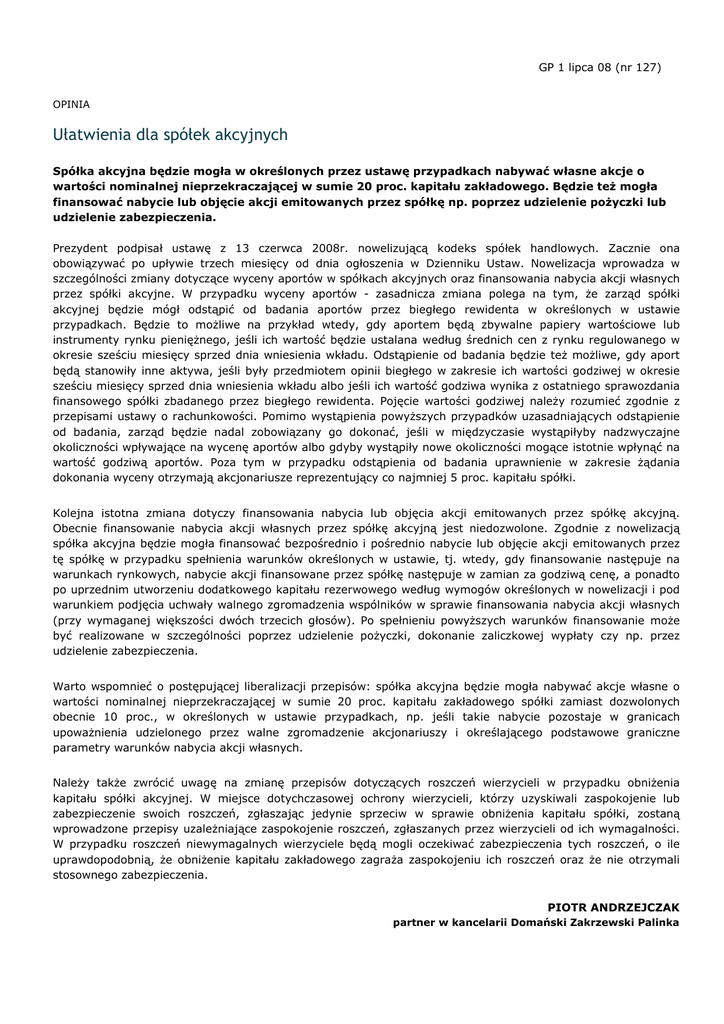 GP 1 lipca 08 (nr 127) OPINIA Ułatwienia dla spółek akcyjnych Spółka akcyjna będzie mogła w określonych przez ustawę przypadkach nabywać własne akcje o wartości nominalnej nieprzekraczającej w sumie 20 proc. kapitału zakładowego. Będzie teŜ mogła finansować nabycie lub objęcie akcji emitowanych przez spółkę np. poprzez udzielenie poŜyczki lub udzielenie zabezpieczenia. Prezydent podpisał ustawę z 13 czerwca 2008r. nowelizującą kodeks spółek handlowych. Zacznie ona obowiązywać po upływie trzech miesięcy od dnia ogłoszenia w Dzienniku Ustaw. Nowelizacja wprowadza w szczególności zmiany dotyczące wyceny aportów w spółkach akcyjnych oraz finansowania nabycia akcji własnych przez spółki akcyjne. W przypadku wyceny aportów - zasadnicza zmiana polega na tym, Ŝe zarząd spółki akcyjnej będzie mógł odstąpić od badania aportów przez biegłego rewidenta w określonych w ustawie przypadkach. Będzie to moŜliwe na przykład wtedy, gdy aportem będą zbywalne papiery wartościowe lub instrumenty rynku pienięŜnego, jeśli ich wartość będzie ustalana według średnich cen z rynku regulowanego w okresie sześciu miesięcy sprzed dnia wniesienia wkładu. Odstąpienie od badania będzie teŜ moŜliwe, gdy aport będą stanowiły inne aktywa, jeśli były przedmiotem opinii biegłego w zakresie ich wartości godziwej w okresie sześciu miesięcy sprzed dnia wniesienia wkładu albo jeśli ich wartość godziwa wynika z ostatniego sprawozdania finansowego spółki zbadanego przez biegłego rewidenta. Pojęcie wartości godziwej naleŜy rozumieć zgodnie z przepisami ustawy o rachunkowości. Pomimo wystąpienia powyŜszych przypadków uzasadniających odstąpienie od badania, zarząd będzie nadal zobowiązany go dokonać, jeśli w międzyczasie wystąpiłyby nadzwyczajne okoliczności wpływające na wycenę aportów albo gdyby wystąpiły nowe okoliczności mogące istotnie wpłynąć na wartość godziwą aportów. Poza tym w przypadku odstąpienia od badania uprawnienie w zakresie Ŝądania dokonania wyceny otrzymają akcjonariusze reprezentujący co najmniej 5 proc. kapitału spółki. Kolejna istotna zmiana dotyczy finansowania nabycia lub objęcia akcji emitowanych przez spółkę akcyjną. Obecnie finansowanie nabycia akcji własnych przez spółkę akcyjną jest niedozwolone. Zgodnie z nowelizacją spółka akcyjna będzie mogła finansować bezpośrednio i pośrednio nabycie lub objęcie akcji emitowanych przez tę spółkę w przypadku spełnienia warunków określonych w ustawie, tj. wtedy, gdy finansowanie następuje na warunkach rynkowych, nabycie akcji finansowane przez spółkę następuje w zamian za godziwą cenę, a ponadto po uprzednim utworzeniu dodatkowego kapitału rezerwowego według wymogów określonych w nowelizacji i pod warunkiem podjęcia uchwały walnego zgromadzenia wspólników w sprawie finansowania nabycia akcji własnych (przy wymaganej większości dwóch trzecich głosów). Po spełnieniu powyŜszych warunków finansowanie moŜe być realizowane w szczególności poprzez udzielenie poŜyczki, dokonanie zaliczkowej wypłaty czy np. przez udzielenie zabezpieczenia. Warto wspomnieć o postępującej liberalizacji przepisów: spółka akcyjna będzie mogła nabywać akcje własne o wartości nominalnej nieprzekraczającej w sumie 20 proc. kapitału zakładowego spółki zamiast dozwolonych obecnie 10 proc., w określonych w ustawie przypadkach, np. jeśli takie nabycie pozostaje w granicach upowaŜnienia udzielonego przez walne zgromadzenie akcjonariuszy i określającego podstawowe graniczne parametry warunków nabycia akcji własnych. NaleŜy takŜe zwrócić uwagę na zmianę przepisów dotyczących roszczeń wierzycieli w przypadku obniŜenia kapitału spółki akcyjnej. W miejsce dotychczasowej ochrony wierzycieli, którzy uzyskiwali zaspokojenie lub zabezpieczenie swoich roszczeń, zgłaszając jedynie sprzeciw w sprawie obniŜenia kapitału spółki, zostaną wprowadzone przepisy uzaleŜniające zaspokojenie roszczeń, zgłaszanych przez wierzycieli od ich wymagalności. W przypadku roszczeń niewymagalnych wierzyciele będą mogli oczekiwać zabezpieczenia tych roszczeń, o ile uprawdopodobnią, Ŝe obniŜenie kapitału zakładowego zagraŜa zaspokojeniu ich roszczeń oraz Ŝe nie otrzymali stosownego zabezpieczenia. PIOTR ANDRZEJCZAK partner w kancelarii Domański Zakrzewski Palinka