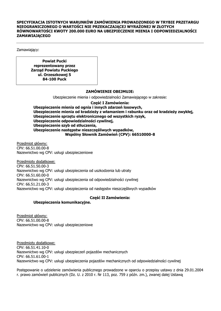 SPECYFIKACJA ISTOTNYCH WARUNK€W ZAM€WIENIA PROWADZONEGO W TRYBIE PRZETARGU NIEOGRANICZONEGO O WARTOŚCI NIE PRZEKACZAJĄCEJ WYRAŻONEJ W ZŁOTYCH R€WNOWARTOŚCI KWOTY 200.000 EURO NA UBEZPIECZENIE MIENIA I ODPOWIEDZIALNOŚCI ZAMAWIAJĄCEGO Zamawiający: Powiat Pucki reprezentowany przez Zarząd Powiatu Puckiego ul. Orzeszkowej 5 84-100 Puck ZAM€WIENIE OBEJMUJE: Ubezpieczenie mienia i odpowiedzialności Zamawiającego w zakresie: Część I Zam‰wienia: Ubezpieczenie mienia od ognia i innych zdarzeń losowych, Ubezpieczenie mienia od kradzieży z włamaniem i rabunku oraz od kradzieży zwykłej, Ubezpieczenie sprzętu elektronicznego od wszystkich ryzyk, Ubezpieczenie odpowiedzialności cywilnej, Ubezpieczenie szyb od stłuczenia, Ubezpieczenie następstw nieszczęśliwych wypadk‰w, Wsp‰lny Słownik Zam‰wień (CPV): 66510000-8 Przedmiot głƒwny: CPV: 66.51.00.00-8 Nazewnictwo wg CPV: usługi ubezpieczeniowe Przedmioty dodatkowe: CPV: 66.51.50.00-3 Nazewnictwo wg CPV: usługi ubezpieczenia od uszkodzenia lub utraty CPV: 66.51.60.00-0 Nazewnictwo wg CPV: usługi ubezpieczenia od odpowiedzialności cywilnej CPV: 66.51.21.00-3 Nazewnictwo wg CPV: usługi ubezpieczenia od następstw nieszczęśliwych wypadkƒw Część II Zam‰wienia: Ubezpieczenia komunikacyjne. Przedmiot głƒwny: CPV: 66.51.00.00-8 Nazewnictwo wg CPV: usługi ubezpieczeniowe Przedmioty dodatkowe: CPV: 66.51.41.10-0 Nazewnictwo wg CPV: usługi ubezpieczeń pojazdƒw mechanicznych CPV: 66.51.61.00-1 Nazewnictwo wg CPV: usługi ubezpieczenia pojazdƒw mechanicznych od odpowiedzialności cywilnej Postępowanie o udzielenie zamƒwienia publicznego prowadzone w oparciu o przepisy ustawy z dnia 29.01.2004 r. prawo zamƒwień publicznych (Dz. U. z 2010 r. Nr 113, poz. 759 z pƒźn. zm.), zwanej dalej Ustawą 2 O udzielenie zamƒwienia mogą ubiegać się wyłącznie Wykonawcy, ktƒrzy spełniają warunki udziału w postępowaniu wynikające z art. 22 Ustawy oraz z niniejszej Specyfikacji Istotnych Warunkƒw Zamƒwienia, zwanej dalej SIWZ. Koszty związane z przygotowaniem i złożeniem oferty ponosi Wykonawca. Zatwierdził: Wicestarosta mgr Zygmunt Wiśniewski ………………………………………………………… Puck, dnia 18.04.2013 r. 3 Zawartość SIWZ: 1. 2. 3. 4. 5. 6. 7. 8. 9. 10. 11. 12. 13. 14. 15. 16. 17. 18. 19. 20. 21. 22. 23. 24. 25. 26. Nazwa i adres Zamawiającego. Tryb udzielania zamƒwienia. Opis przedmiotu zamƒwienia. Opis części zamƒwienia, jeżeli Zamawiający dopuszcza składanie ofert częściowych. Informacja dotycząca udziału podwykonawcƒw w przedmiocie zamƒwienia. Informacja o przewidywanych zamƒwieniach uzupełniających. Termin wykonania zamƒwienia. Warunki udziału w postępowaniu oraz opis sposobu dokonywania oceny spełniania tych warunkƒw. Informacja o oświadczeniach lub dokumentach, jakie mają dostarczyć wykonawcy w celu potwierdzenia spełnienia warunkƒw udziału w postępowaniu. Informacja o sposobie porozumiewania się Zamawiającego z wykonawcami oraz przekazywania oświadczeń lub dokumentƒw, z podaniem adresu poczty elektronicznej lub strony elektronicznej Zamawiającego. Opis sposobu udzielania wyjaśnień dotyczących SIWZ oraz oświadczenie, czy zamierza się zwołać zebranie wykonawcƒw. Wskazanie osƒb uprawnionych do porozumiewania się z wykonawcami. Wymagania dotyczące wadium. Termin związania ofertą. Opis sposobu przygotowania ofert. Miejsce oraz termin składania i otwarcia ofert. Opis sposobu obliczenia ceny. Informacje dotyczące walut obcych, w jakich mogą być prowadzone rozliczenia między Zamawiającym a wykonawcą. Opis kryteriƒw, ktƒrymi Zamawiający będzie kierował się przy wyborze oferty, wraz z podaniem znaczenia tych kryteriƒw oraz sposobu oceny ofert. Czynności wykonywane przy otwarciu i ocenie ofert. Odrzucenie oferty, unieważnienie postępowania. Informacja o formalnościach, jakie powinny zostać dopełnione po wyborze oferty w celu zawarcia umowy w sprawie zamƒwienia publicznego. Wymagania dotyczące zabezpieczenia należytego wykonania umowy. Istotne dla stron postanowienia, ktƒre zostaną wprowadzone do treści zawieranej umowy, w sprawie zamƒwienia publicznego, wzƒr umowy. Pouczenie o środkach ochrony prawnej przysługujących wykonawcy w toku postępowania o udzielenie zamƒwienia. Wykaz załącznikƒw. 1. NAZWA ORAZ ADRES ZAMAWIAJĄCEGO Powiat Pucki reprezentowany przez Zarząd Powiatu Puckiego ul. Orzeszkowej 5, 84-100 Puck tel. (58) 673-42-02, fax (58) 673-41-91 WWW: http://bip.starostwo.puck.pl/ e-mail: [email protected] 2. TRYB UDZIELENIA ZAM€WIENIA Postępowanie o udzielenie zamƒwienia publicznego prowadzone jest w trybie przetargu nieograniczonego na podstawie ustawy z dnia 29 stycznia 2004 roku Prawo zamƒwień publicznych (Dz. U. z 2010 r. Nr 113, poz. 759 z pƒźn. zm.). 4 3. OPIS PRZEDMIOTU ZAM€WIENIA Część I Zam‰wienia: Przedmiot zamƒwienia obejmuje ubezpieczenie mienia i odpowiedzialności Zamawiającego w zakresie: ubezpieczenia mienia od ognia i innych zdarzeń losowych, ubezpieczenia mienia od kradzieży z włamaniem i rabunku oraz od kradzieży zwykłej, ubezpieczenia sprzętu elektronicznego od wszystkich ryzyk, ubezpieczenia odpowiedzialności cywilnej, ubezpieczenia szyb od stłuczenia, ubezpieczenia następstw nieszczęśliwych wypadkƒw, w następujących jednostkach organizacyjnych: 1. Starostwo Powiatowe w Pucku, ul. Orzeszkowej 5, 84-100 Puck 2. Powiatowe Centrum Pomocy Rodzinie, ul. Mestwina 32, 84-100 Puck 3. Powiatowy Urząd Pracy, ul. Wejherowska 43a, 84-100 Puck 4. Dom Pomocy Społecznej w Pucku, ul. A. Majkowskiego 3, 84-100 Puck 5. Dom Pomocy Społecznej w Lubkowie, ul. Długa 50, 84-110 Krokowa 6. I Liceum Ogƒlnokształcące im. Stefana Żeromskiego w Pucku, ul. Morskiego Dywizjonu Lotniczego 14, 84100 Puck 7. Zespƒł Szkƒł Ponadgimnazjalnych im. St. Staszica, Kłanino 22, 84-107 Starzyno 8. Specjalny Ośrodek Szkolno- Wychowawczy, ul. Zamkowa 5, 84-100 