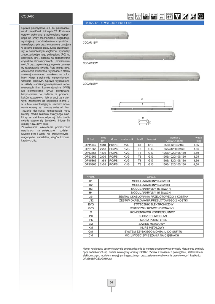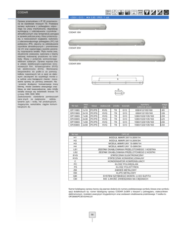 CODAR ~230V / G13 / w Oprawa przemysłowa o IP 65 przeznaczona do świetlówek liniowych T8. Podstawa oprawy wykonana z poliwęglanu odpornego na urazy mechaniczne, degradację wynikającą z oddziaływania czynników atmosferycznych oraz temperaturę panująca w oprawie podczas pracy. Klosz przezroczysty, o nowoczesnym wyglądzie, wykonany z uderzenioodpornego poliwęglanu (PC) lub polistyrenu (PS), odporny na oddziaływanie czynników atmosferycznych i promieniowanie UV oraz zapewniający wysokie parametry rozpraszania światła. Płyta montażowa, obustronnie zwieszana, wykonana z blachy stalowej malowanej proszkowo na kolor biały. Klipsy z poliamidu wzmocnionego włóknem szklanym. Oprawa wyposażona w układy stabilizacyjno-zapłonowe renomowanych firm, konwencjonalne (KVG) lub elektroniczne (EVG). Montowana bezpośrednio do podłoża za pomocą kołków rozporowych lub w opcji ze stalowymi zaczepami do szybkiego montażu w suficie umożliwiającymi również mocowanie oprawy za pomocą zwieszeń. Na życzenie dostępne: kompensacja mocy biernej, moduł zasilania awaryjnego oraz klipsy ze stali kwasoodpornej. Jako źródło światła stosuje się świetlówki liniowe T8 o mocy 18W, 36W, 58W. Zastosowanie: oświetlenie pomieszczeń narażonych na zwiększone oddziaływanie pyłu i wody, hal produkcyjnych, magazynów, warsztatów, ciągów komunikacyjnych, itp. 0,85 / IP65 / 1 szt. CODAR 18W CODAR 36W CODAR 58W Nr kat. OP11865 OP21865 OP13665 OP23665 OP15865 OP25865 moc [W] 1x18 2x18 1x36 2x36 1x58 2x58 klosz statecznik PC/PS PC/PS PC/PS PC/PS PC/PS PC/PS KVG KVG KVG KVG KVG KVG Nr kat. źródło T8 T8 T8 T8 T8 T8 trzonek G13 G13 G13 G13 G13 G13 wymiary A/B/C/D [mm] 658/412/105/160 658/412/105/160 1266/1020/105/160 1266/1020/105/160 1566/1320/105/160 1566/1320/105/160 waga [kg] 1,85 1,95 2,59 3,25 3,56 4,50 OPCJE H1 H2 H3 H4 LS1 LS2 EVG KVG C PC PS ZM KM QM CM MODUŁ AWARYJNY 6-26W/1H MODUŁ AWARYJNY 6-26W/3H MODUŁ AWARYJNY 15-58W/1H MODUŁ AWARYJNY 15-58W/3H ZESTAW OKABLOWANIA PRZELOTOWEGO 1 KOSTKA ZESTAW OKABLOWANIA PRZELOTOWEGO 2 KOSTKI STATECZNIK ELEKTRONICZNY STATECZNIK KONWENCJONALNY KONDENSATOR KOMPENSUJNCY KLOSZ POLIWĘGLAN KLOSZ POLISTYREN ZAWIEŚ METALOWY KLIPS METALOWY SYSTEM SZYBKIEGO MONTAŻU DO SUFITU MOŻLIWOŚĆ ZWIESZANIA NA CIĘGNACH Numer katalogowy oprawy tworzy się poprzez dodanie do numeru podstawowego symbolu klosza oraz symbolu opcji dodatkowych np. numer katalogowy oprawy CODAR 2x36W z kloszem z poliwęglanu, statecznikiem elektronicznym, modułem awaryjnym trzygodzinnym oraz zestawem okablowania przelotowego 1 kostka to: OP23665/PC/EVG/H4/LS1 56 CODAR 135o 135o 200 160 120o 120 CODAR 258 2 x TL-D 80 135o 135o 160 120o 120o 105o 105o 120 CODAR 236 2 x TL-D 80 120o 80 80 105o 105o 90o 90o 90o 90o 75o 75o 75o 75o 60o 60o 60o 45o 45o 45o ? = 83 % cd/klm 135o 160 120 120o ? = 77 % 45o 30o 15o 0o 15o 30o C0-C180 C90-C270 30o 15o 0o 15o 30o C0-C180 C90-C270 135o 60o cd/klm CODAR 218 2 x TL-D 120o 80 105o 105o 90o 90o 75o 75o 60o 45o 60o cd/klm ? = 72 % 45o 30o 15o 0o 15o 30o C0-C180 C90-C270 KLIPS METALOWY KLIPS TWORZYWOWY SYSTEM ZAWIESZANIA NA CIĘGNACH ZAWIEŚ METALOWY SYSTEM SZYBKIEGO MONTAŻU ZAWIEŚ TWORZYWOWY 57