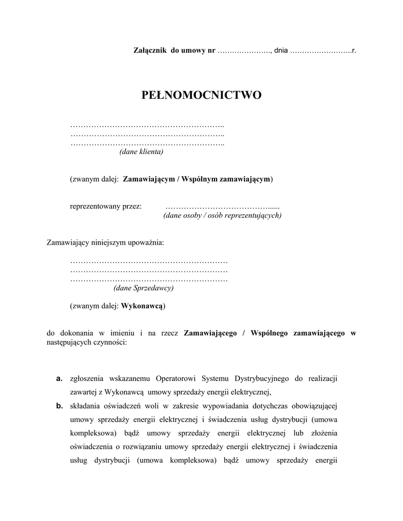 Załącznik do umowy nr …………………., dnia ……………………..r. PEŁNOMOCNICTWO ………………………………………………….. ………………………………………………….. ………………………………………………….. (dane klienta) (zwanym dalej: Zamawiającym / Wspólnym zamawiającym) reprezentowany przez: …………………………………...... (dane osoby / osób reprezentujących) Zamawiający niniejszym upoważnia: …………………………………………………… …………………………………………………… …………………………………………………… (dane Sprzedawcy) (zwanym dalej: Wykonawcą) do dokonania w imieniu i na rzecz Zamawiającego / Wspólnego zamawiającego w następujących czynności: a. zgłoszenia wskazanemu Operatorowi Systemu Dystrybucyjnego do realizacji zawartej z Wykonawcą umowy sprzedaży energii elektrycznej, b. składania oświadczeń woli w zakresie wypowiadania dotychczas obowiązującej umowy sprzedaży energii elektrycznej i świadczenia usług dystrybucji (umowa kompleksowa) bądź umowy sprzedaży energii elektrycznej lub złożenia oświadczenia o rozwiązaniu umowy sprzedaży energii elektrycznej i świadczenia usług dystrybucji (umowa kompleksowa) bądź umowy sprzedaży energii elektrycznej w trybie zgodnego porozumienia stron dotychczasowemu sprzedawcy energii elektrycznej, c. reprezentowania Zamawiającego / Wspólnego zamawiającego przed właściwym Operatorem Systemu Dystrybucyjnego w sprawach związanych z zawarciem umowy o świadczenie usług dystrybucji, z uwzględnieniem wskazanych poniżej taryf oraz mocy umownych dla poszczególnych obiektów, tj. w szczególności uzyskać, ustalić treść i przedłożyć Zamawiającemu do podpisania niezbędne dokumenty, pod warunkiem pozytywnego rozpatrzenia wniosku przez Operatora Systemu Dystrybucyjnego. Procedura zawarcia umowy o świadczenie usług dystrybucji wg powyższego pełnomocnictwa winna być przeprowadzona z uwzględnieniem przepisów ustawy Prawo zamówień publicznych; Niniejsze Pełnomocnictwo uprawnia do udzielenia dalszych pełnomocnictw substytucyjnych. ………………………………………. Data i podpis ………………………………………… Niniejsze pełnomocnictwo przyjmuję Data i podpis