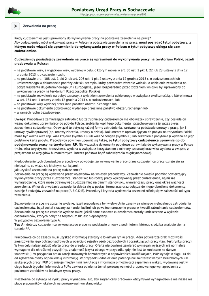 Powiatowy Urząd Pracy w Sochaczewie http://pupsochaczew.pl/strona/zezwolenia-na-prace/293 Zezwolenia na pracę Kiedy cudzoziemiec jest uprawniony do wykonywania pracy na podstawie zezwolenia na pracę? Aby cudzoziemiec mógł wykonywać pracę w Polsce na podstawie zezwolenia na pracę, musi posiadać tytuł pobytowy, z którym może wiązać się uprawnienie do wykonywania pracy w Polsce; o tytuł pobytowy ubiega się sam cudzoziemiec. Cudzoziemcy posiadający zezwolenie na pracę są uprawnieni do wykonywania pracy na terytorium Polski, jeżeli przybywają w Polsce: ● ● ● ● ● ● na podstawie wizy, z wyjątkiem wizy, wydanej w celu, o którym mowa w art. 60 ust. 1 pkt 1, 22 lub 23 ustawy z dnia 12 grudnia 2013 r. o cudzoziemcach, na podstawie art. . 108 ust. 1 pkt 2 lub art. 206 ust. 1 pkt 2 ustawy z dnia 12 grudnia 2013 r. o cudzoziemcach lub umieszczonego w dokumencie podróży odcisku stempla, który potwierdza złożenie wniosku o udzielenie zezwolenia na pobyt rezydenta długoterminowego Unii Europejskiej, jeżeli bezpośrednio przed złożeniem wniosku był uprawniony do wykonywania pracy na terytorium Rzeczpospolitej Polskiej na podstawie zezwolenia na pobyt czasowy, z wyjątkiem zezwolenia udzielonego w związku z okolicznością, o której mowa w art. 181 ust. 1 ustawy z dnia 12 grudnia 2013 r. o cudzoziemcach, lub na podstawie wizy wydanej przez inne państwo obszaru Schengen lub na podstawie dokumentu pobytowego wydanego przez inne państwo obszaru Schengen lub w ramach ruchu bezwizowego. Uwaga: Pracodawca zamierzający zatrudnić lub zatrudniający cudzoziemca ma obowiązek sprawdzenia, czy posiada on ważny dokument uprawniający do pobytu Polsce, zrobienia kopii tego dokumentu i przechowywania jej przez okres zatrudnienia cudzoziemca. Obowiązki te dotyczą każdej formy zatrudnienia, zarówno na podstawie umowy o pracę, jak i umowy cywilnoprawnej (np. umowy zlecenia, umowy o dzieło). Dokumentem uprawniającym do pobytu na terytorium Polski może być ważna wiza (np. wiza krajowa (symbol D) lub wiza Schengen (symbol C) lub zezwolenie pobytowe (i wydana na jego podstawie karta pobytu. Pracodawca powinien upewnić się także, że tytuł pobytowy cudzoziemca uprawnia go do podejmowania pracy na terytorium RP. Nie wszystkie dokumenty pobytowe uprawniają do wykonywania pracy w Polsce (m.in. wiza turystyczna, tranzytowa, wydana w związku z korzystaniem z ochrony czasowej oraz wiza wydana w związku z przejazdem ze względów humanitarnych, interes państwa bądź zobowiązania międzynarodowe). Niedopełnienie tych obowiązków pracodawcy powoduje, że wykonywanie pracy przez cudzoziemca pracy uznaje się za nielegalne, co wiąże się istotnymi sankcjami. Jak uzyskać zezwolenie na pracę cudzoziemca? Zezwolenia na pracę są wydawane przez wojewodów na wniosek pracodawcy. Zezwolenie określa podmiot powierzający wykonywanie pracy przez cudzoziemca, stanowisko lub rodzaj pracy wykonywanej przez cudzoziemca, najniższe wynagrodzenie, które może otrzymywać cudzoziemiec na danym stanowisku, wymiar czasu pracy oraz okres ważności zezwolenia. Wniosek o wydanie zezwolenia składa się w postaci formularza oraz dołącza do niego określone dokumenty. Istnieje 5 rodzajów zezwoleń na pracę(A,B,C,D,E). Procedury i kryteria wydawania zezwoleń różnią się w zależności od typu zezwolenia. Zezwolenie na pracę nie zostanie wydane, jeżeli pracodawca był wielokrotnie uznany za winnego nielegalnego zatrudniania cudzoziemców, bądź został skazany za handel ludźmi lub poważne naruszenie prawa w kwestii zatrudniania cudzoziemców. Zezwolenie na pracę nie zostanie wydane także, jeżeli dane osobowe cudzoziemca zostały umieszczone w wykazie cudzoziemców, których pobyt na terytorium RP jest niepożądany. W przypadku zezwolenia typu A: Typ A - dotyczy cudzoziemca wykonującego pracę na podstawie umowy z podmiotem, którego siedziba znajduje się na terenie RP. Pracodawca co do zasady musi uzyskać informację starosty o lokalnym rynku pracy, która potwierdza brak możliwości zrealizowania jego potrzeb kadrowych w oparciu o rejestry osób bezrobotnych i poszukujących pracy (tzw. test rynku pracy). W tym celu należy zgłosić ofertę pracy do urzędu pracy. Oferta nie powinna zawierać wymagań wyższych niż normalnie wymagane dla określonej pozycji (np. znajomość języka obcego w przypadku gdy nie jest to konieczne na danym stanowisku). W przypadku braku zarejestrowanych bezrobotnych o odpowiednich kwalifikacjach, PUP wydaje w ciągu 14 dni od zgłoszenia oferty odpowiednią informację. W przypadku odnalezienia potencjalnie zainteresowanych bezrobotnych lub szukających pracy, PUP organizuje między nimi rekrutację i informacja o możliwości zapełnienia wakatu wydawana jest w ciągu trzech tygodni. Informacja z PUPu zawiera opinię na temat porównywalności proponowanego wynagrodzenia z poziomem zarobków na lokalnym rynku pracy. Niezależnie od sytuacji na rynku pracy wymagane jest, aby zagraniczny pracownik otrzymywał wynagrodzenie nie niższe niż płace pracowników lokalnych na porównywalnym stanowisku. Zezwolenie typu A wydawane jest na okres do 3 lat, jednak okres ten może być skrócony, według kryteriów określonych w lokalnych uregulowaniach, tj. wydawanych przez wojewodę tzw. kryteriach wojewódzkich. W niektórych sytuacjach uzyskanie ww. informacji starosty nie jest wymagane. Dotyczy to m.in.: ● ● ● ● ● przedłużenia zezwolenia na pracę dla tego samego cudzoziemca na tym samym stanowisku, stanowisk lub zawodów określonych w tzw. kryteriach wojewódzkich wydawanych przez wojewodę, obywateli Armenii, Białorusi, Gruzji, Mołdawi, Rosji i Ukrainy wykonujących prace pielęgnacyjno-opiekuńcze lub jako pomoc domowa, obywateli ww. 6 krajów, którzy do tej pory pracowali na podstawie oświadczenia o zamiarze powierzenia wykonywania pracy przez przynajmniej 3 miesiące, trenerów lub sportowców wykonujących prac