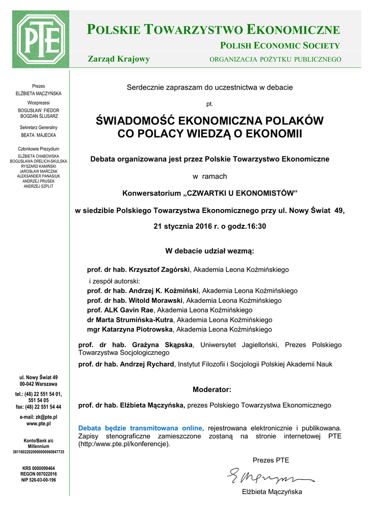POLSKIE TOWARZYSTWO EKONOMICZNE POLISH ECONOMIC SOCIETY Zarząd Krajowy Prezes ELŻBIETA MĄCZYŃSKA Wiceprezesi BOGUSŁAW FIEDOR BOGDAN ŚLUSARZ Sekretarz Generalny BEATA MAJECKA ORGANIZACJA POŻYTKU PUBLICZNEGO Serdecznie zapraszam do uczestnictwa w debacie pt. ŚWIADOMOŚĆ EKONOMICZNA POLAKÓW CO POLACY WIEDZĄ O EKONOMII Członkowie Prezydium ELŻBIETA CHABOWSKA BOGUSŁAWA DRELICH-SKULSKA RYSZARD KAMIŃSKI JAROSŁAW MARCZAK ALEKSANDER PANASIUK ANDRZEJ PRUSEK ANDRZEJ SZPLIT Debata organizowana jest przez Polskie Towarzystwo Ekonomiczne w ramach Konwersatorium „CZWARTKI U EKONOMISTÓW” w siedzibie Polskiego Towarzystwa Ekonomicznego przy ul. Nowy Świat 49, 21 stycznia 2016 r. o godz.16:30 W debacie udział wezmą: prof. dr hab. Krzysztof Zagórski, Akademia Leona Koźmińskiego i zespół autorski: prof. dr hab. Andrzej K. Koźmiński, Akademia Leona Koźmińskiego prof. dr hab. Witold Morawski, Akademia Leona Koźmińskiego prof. ALK Gavin Rae, Akademia Leona Koźmińskiego dr Marta Strumińska-Kutra, Akademia Leona Koźmińskiego mgr Katarzyna Piotrowska, Akademia Leona Koźmińskiego prof. dr hab. Grażyna Skąpska, Uniwersytet Jagielloński, Prezes Polskiego Towarzystwa Socjologicznego prof. dr hab. Andrzej Rychard, Instytut Filozofii i Socjologii Polskiej Akademii Nauk ul. Nowy Świat 49 00-042 Warszawa tel.: (48) 22 551 54 01, 551 54 05 fax: (48) 22 551 54 44 e-mail: [email protected] www.pte.pl Konto/Bank a/c Millennium Moderator: prof. dr hab. Elżbieta Mączyńska, prezes Polskiego Towarzystwa Ekonomicznego Debata będzie transmitowana online, rejestrowana elektronicznie i publikowana. Zapisy stenograficzne zamieszczone zostaną na stronie internetowej PTE (http:/www.pte.pl/konferencje). 38116022020000000060847735 Prezes PTE KRS 0000099464 REGON 007022016 NIP 526-03-00-196 Elżbieta Mączyńska Instrukcja dla uczestników spotkań online organizowanych przez Polskie Towarzystwo Ekonomiczne 1. Uczestnictwo w transmisji online wymaga dostępu do komputera oraz łącza internetowego. 2. Z transmisją wydarzenia łączymy się za pomocą adresu WWW: https://pte.clickwebinar.com/debata 3. Transmisja rozpocznie się na 20 min. przed właściwym spotkaniem. 4. Po otworzeniu linku proszę postępować według poniższej instrukcji: 5. Program przed odtworzeniem transmisji sprawdzi aktualność Państwa oprogramowania. W zależności od wyniku, może powstać potrzeba aktualizacji wybranych komponentów (testowanie można przeprowadzić w każdym momencie, nawet gdy spotkanie nie jest jeszcze rozpoczęte). 6. Po wejściu do pokoju transmisji powinien pokazać się zbliżony ekran: 7. W przypadku problemów z połączeniem, proszę o kontakt na adres mailowy: [email protected]