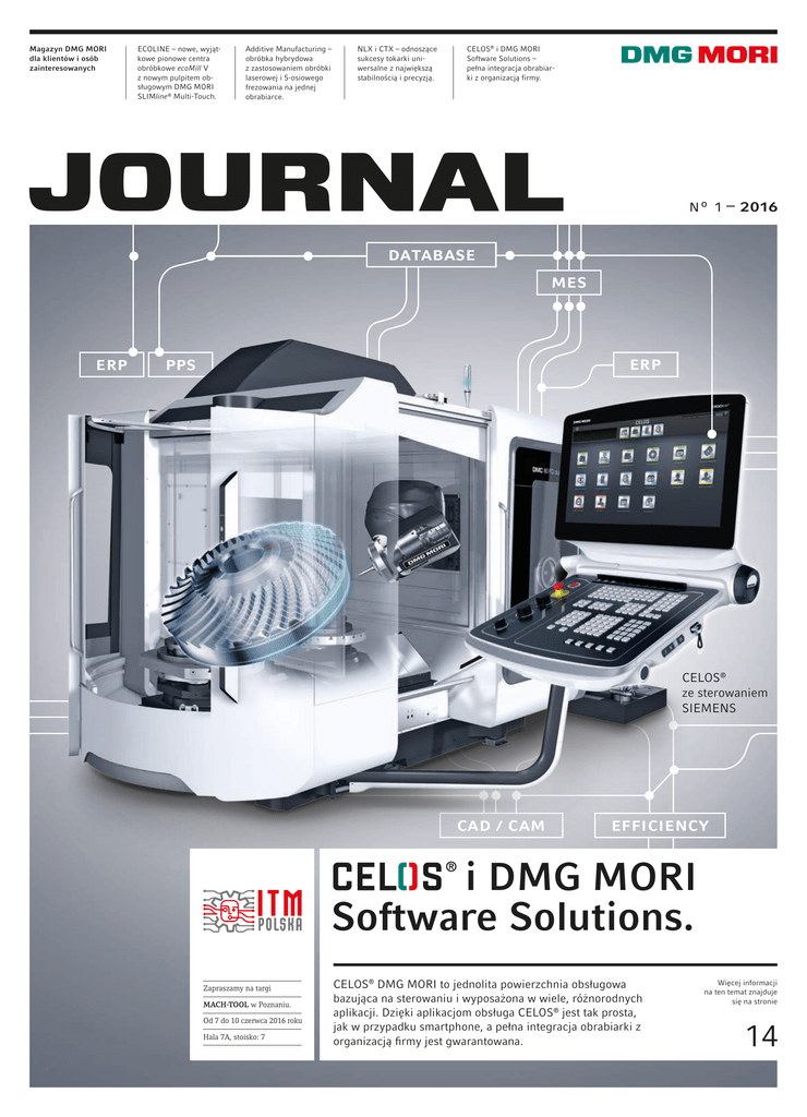 Magazyn DMG MORI dla klientów i osób zainteresowanych ECOLINE – nowe, wyjątkowe pionowe centra obróbkowe ecoMill V z nowym pulpitem obsługowym DMG MORI SLIMline® Multi-Touch. Additive Manufacturing – obróbka hybrydowa z zastosowaniem obróbki laserowej i 5-osiowego frezowania na jednej obrabiarce. NLX i CTX – odnoszące sukcesy tokarki uniwersalne z największą stabilnością i precyzją. CELOS® i DMG MORI Software Solutions – pełna integracja obrabiarki z organizacją firmy. journal nº 1 – 2016 Database MES ERP ERP PPS CELOS® ze sterowaniem SIEMENS cad / cam Efficiency i DMG MORI Software Solutions. Zapraszamy na targi MACH-TOOL w Poznaniu. Od 7 do 10 czerwca 2016 roku Hala 7A, stoisko: 7 CELOS® DMG MORI to jednolita powierzchnia obsługowa bazująca na sterowaniu i wyposażona w wiele, różnorodnych aplikacji. Dzięki aplikacjom obsługa CELOS® jest tak prosta, jak w przypadku smartphone, a pełna integracja obrabiarki z organizacją firmy jest gwarantowana. Więcej informacji na ten temat znajduje się na stronie 14 2 TRENDY I INNOWACJE 2016 Pulpit obsługowy DMG MORI SLIMline® Multi-Touch – HIGHEST FUNCTIONALITY, BEST PRICE! ecoMill V Kompaktowe, efektywne, dynamiczne i precyzyjne: nowe pionowe centra obróbkowe serii ecoMill V 4 – 5 PDM PPS / MES ERP CAD / CAM CELOS® i DMG MORI Software Solutions Perfekcyjnie zorganizowane procesy dzięki pełnej integracji obrabiarki z organizacją firmy dmg mori CNC-Scout – wszystkie oferty z natychmiastową dostawą online. Ponad 700 obrabiarek z natychmiastową dostawą! Już od dziś możesz codziennie otrzymywać informacje o ofertach z natychmiastową dostawą. Dzięki CNC-Scout DMG MORI szybko możecie Państwo znaleźć konkretną obrabiarkę, w odpowiedniej konfiguracji: cnc-scout.dmgmori.com Wszystkie dostępne oferty: cnc-scout.dmgmori.com 14 – 19 3 SPIS TREŚCI ECOLINE 4 – 5 + ecoMill V LASERTEC / ULTRASONIC 6 – 7 7 + Additive Manufacturing + Premiera światowa: ULTRASONIC 20 linear Tokarki uniwersalne 8 – 9 + NLX / CTX Obróbka kompletna tokarsko-frezarska + CTX TC / NTX Premiera światowa: CTX gamma 3000 TC 10 – 11 Automaty tokarskie / tokarki produkcyjne + SPRINT / WASINO / CTV 12 – 13 CELOS® i DMG MORI Software Solutions + + + + + Cyfrowa obróbka dla Porsche Cykle technologiczne DMG MORI Konwersja programów NC Łańcuch procesów DMG MORI Przemysł 4.0 14 – 15 16 17 17 18 – 19 Frezarki 5-osiowe + + + + Additive Manufacturing Obróbka generatywna detali 3D na gotowo, w najwyższej jakości wykonania LifeCycle Services + DMG MORI Service Plus, DMG MORI Online Shop + DMG MORI Microset, DMG MORI Academy 6 – 7 Najważniejsze wydarzenia – 1 półrocze 2016 roku ++ ++ ++ ++ ++ ++ ++ ++ METALLOOBRABOTKA, Moskwa / RU Grand Opening, Moskwa / RU BIEMH, Bilbao / ES MACH-TOOL, Poznań / PL Innovation Days, Iga / JP Open House, Bielefeld / DE CIMES, Beijing / PRC Opening, Stipshausen / DE DMU duoBLOCK® Premiera światowa: DMU 160 P duoBLOCK® 4-tej generacji 20 – 21 DMU 50 21 PORTALOWE / XXL CENTRA OBRÓBKOWE Premiera światowa: DMU 210 P 22 Premiera światowa: DMU 600 G linear 23 DIXI Premiera światowa: DIXI 125 23 23. 05. – 27. 05. 2016 23. 05. 2016 30. 05. – 04. 06. 2016 07. 06. – 10. 06. 2016 07. 06. – 11. 06. 2016 14. 06. – 17. 06. 2016 22. 06. – 26. 06. 2016 29. 06. – 01. 07. 2016 DMG MORI live : events.dmgmori.com 24 –25 26 –27 4 ECOLINE ecoMill V MAN INDUSTRY CO., LTD. „Dzięki dokładności pozycjonowania 6 µm obrabiarek serii ecoMill V, nasze detale spełniają najwyższe wymagania jakościowe.“ Zobacz film video na temat ecoMill V Więcej informacji o obrabiarkach serii ECOLINE znajduje się na stronie internetowej: ecoline.dmgmori.com Standardowo 18-miesięczna gwarancja na obrabiarki serii ECOLINE, komponenty oraz usługi serwisowe Prezes Zarządu, Jodai Takanori, opowiada o centrum ecoMill V z dokładnością pozycjonowania 6 µm. Prezes Zarządu, Jodai Takanori opisuje swoją wizję: „Redukcja czasów obróbki oraz kompleksowy park maszynowy. Oferujemy naszym klientom duże spektrum części, które obrabiamy w małych seriach, przy jednocześnie krótkich terminach dostaw. Nasz cel to dostawy ‚just in time‘, zgodne z systemem produkcyjnym Toyoty.“ Przedsiębiorstwo produkuje przede wszystkim gniazda do zaworów oraz części do amortyzatorów i przekładni dla przemysłu samochodowego, wysoko precyzyjne elementy spiekane do zastosowania w pantografach pociągów i części z materiałów trudnoobrabialnych, takich jak węgliki spiekane. Czynnikiem, który decyduje o wzroście produktywności, jest czas przezbrajania. „Dużą zaletą ecoMill V jest bardzo dobry dostęp do przestrzeni roboczej, co powala na szybką i prostą wymianę oprzyrządowania mocującego. Duża przestrzeń robocza umożliwia również zastosowanie modułowych systemów mocowań o pojemności do 30 detali. Niezwykle dobra dokładność pozycjonowania obrabiarki w zakresie 6 µm jest przy tym czynnikiem decydującym o wysokiej jakości naszych produktów. Dotychczas nie mieliśmy ani jednego braku. Dodatkowym wsparciem dla nas jest informacja o obciążeniu wrzeciona, teraz wiemy dokładnie, kiedy należy wymienić narzędzie. Wrzeciono highspeed z max. prędkością obrotową 12.000 obr/min i magazyn o pojemności 30 narzędzi umożliwiają osiągnięcie dużych prędkości skrawania oraz pozwalają nam szybko reagować na zapytania klientów, oferując zawsze krótkie terminy dostaw; to wpływa na znaczną poprawę konkurencyjności przedsiębiorstwa. Niewątpliwą zaletą ecoMill V jest wyjątkowy design“, stwierdza Prezes: „Podczas odwiedzania naszej firmy klienci są pod wrażeniem obrabiarki i jej wysokiej jakości. Poza tym uwagę należy zwrócić na optymalne odprowadzanie wiórów, co pozwala utrzymać w czystości przestrzeń roboczą. MAN INDUSTRY CO., LTD. 288-1 Bessho, Maizuru City, JP-Kyoto 624-0805 ecoMill V – największa dokładność w atrakcyjn