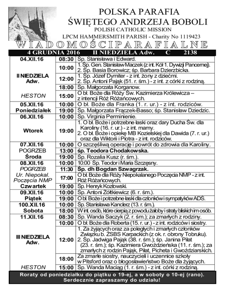POLSKA PARAFIA ŚWIĘTEGO ANDRZEJA BOBOLI POLISH CATHOLIC MISSION LPCM HAMMERSMITH PARISH - Charity No 1119423 4 GRUDNIA 2016 04.XII.16 II NIEDZIELA Adw. HESTON 05.XII.16 Poniedziałek 06.XII.16 Wtorek 07.XII.16 POGRZEB Środa 08.XII.16 POGRZEB Ur. Niepokal. Poczęcia NMP Czwartek 09.XII.16 Piątek 100.XII.16 Sobota 11.XII.16 III NIEDZIELA Adw. HESTON II NIEDZIELA Adw. C 2138 08:30 Śp. Stanisława i Edward. 1. Śp. Gen. Stanisław Maczek (z int. Kół 1. Dywizji Pancernej). 10:00 2. Śp. Basia Borowicz; śp. Barbara Dzierzbicka. 1. Śp. Józef Dymiter - z int. żony z dziećmi. 12:00 2. Śp. Antoni Pająk (51. r. śm.) - z int. z córki z rodziną. 18:00 Śp. Małgorzata Korganow. O bł. Boże dla Róży Św. Kazimierza Królewicza – 15:00 z intencji Róż Różańcowych. 10:00 O bł. Boże dla Franka (1. r. ur.) - z int. rodziców. 19:00 Śp. Małgorzata Frączek-Basso; śp. Stanisław Dziedzic. 10:00 Śp. Virginia Perminienie. 1. O bł. Boże i potrzebne łaski oraz dary Ducha Św. dla Karoliny (16. r. ur.) - z int. mamy. 19:00 2. O bł. Boże i opiekę MB Kozielskiej dla Dawida (7. r. ur.) oraz dla Wiktorii i Piotra - z int. rodziców. 10:00 O szczęśliwą operację i powrót do zdrowia dla Karoliny. 13:00 śp. Teodora Chodakowska. 19:00 Śp. Rozalia Kusz (r. śm.). 10:00 10:00 Śp. Teodor i Maria Szczęsny. 11:30 Śp. dh Bogdan Szwagrzak. O bł. Boże dla Róży Niepokalanego Poczęcia NMP - z int. 17:00 Róż Różańcowych. 19:00 Śp. Henryk Kozłowski. 10:00 Śp. Antoni Żółtkiewicz (6. r. śm.). 19:00 O bł. Boże i potrzebne łaski dla członków i sympatyków ADŚ. 10:00 Śp. Stanisława Kanclerz (13. r. śm.). 18:00 W int. osób, które cierpią z powodu żałoby i straty bliskich im osób. 08:30 Śp. Wanda Saczyk (2. r. śm.); za zmarłych z rodziny. 10:00 O bł. Boże dla Roberta (15. r. ur.) - z int. rodziców i siostry. 1. Za żyjących oraz za poległych i zmarłych członków Związku b. ŻSBS Karpackich (z ok. r. obrony Tobruku). 12:00 2. Śp. Jadwiga Pająk (38. r. śm.); śp. Janina Piłat (23. r. śm.); śp. Kazimiera Gwoździeńska (11. r. śm.); za zmarłych z rodzin Pająk, Piłat, Picheta i Gwoździarskich. Za zmarłe siostry, nauczycieli i uczennice szkoły 18:00 w Pitsford oraz o błogosławieństwo Boże dla żyjących. 15:00 Śp. Wanda Maciąg (1. r. śm.) - z int. córki z rodziną. Roraty od poniedziałku do piątku o 19-ej, a w soboty o 10-ej (rano). Serdecznie zapraszamy do udziału! NIEDZIELA 04 GRUDZIEŃ 2016 - I Niedziela M-ca 09:00-13:30: Zapraszamy do kawiarni i sklepiku. 09:30, kaplica MB: Godzinki ku czci Niepokalanego Poczęcia NMP. 11:00 i 13:00, kaplica MB: zmiana tajemnic różańcowych, a w HESTON o 16:00. 09:45, sala Św. Józefa: przygotowanie Scholi ŚWIATŁO do udziału we Mszy Św. 17:30, kościół: Nabożeństwo + Godzinki do Niepokalanego Poczęcia NMP. PONIEDZIAŁEK 05 GRUDNIA 2016 20:00, sala Św. Józefa: Spotkanie Mężczyzn św. Józefa. WTOREK 06 GRUDNIA 2016 10.00-12.00, sala św. Józefa: „Złote Rybki” czyli spotkanie mam i małych dzieci. 20:00, salka (Basement, 18 Greenside Road, W12): Spotkanie polskiej grupy AA. 20:00, kawiarnia: próba OEIQUMENE. ŚRODA 07 GRUDNIA 2016 18:30, sala Św. Józefa: Schola ŚWIATŁO. 19:00, kaplica MB: Msza i Nabożeństwo do MB Kozielskiej. CZWARTEK 08 GRUDZIEŃ 2016 UROCZYSTOŚĆ NIEPOKALANEGO POCZĘCIA NMP – Msze o: 10:00, 17:00 i 19:00. 10.00-12.00, sala św. Józefa: „Złote Rybki” czyli spotkanie mam i małych dzieci. 18:30, kaplica MB: Różaniec w intencji misji (Grupa Misyjna). 19:30-21:00, kaplica MB: indywidualna adoracja Najśw. Sakramentu. 20:00: Spotkania GALILEI (kawiarnia) i WŻCh (konferencyjna). PIĄTEK 09 GRUDZIEŃ 201610:30, kaplica B.Mił.: Nabożeństwo I Piątku M-ca + Koronka do Miłosierdzia Bożego. 18:00, kościół: Próba generalna wszystkich ministrantów przed promocją. 18:30, kaplica MB: Różaniec, Msza i katecheza dla członków i sympatyków ADŚ. 20:00, kawiarnia: Spotkanie Grupy Wielbienia. SOBOTA 10 GRUDZIEŃ 2016 16:00, kościół: I Komunia - katecheza dla Dzieci (9). 19:00, kaplica MB: Nabożeństwo fatimskie. 20:00, kawiarnia: Eucharystia dla Neokatechumenatu. NIEDZIELA 11 GRUDZIEŃ 2016 09:00-13:30: Zapraszamy do kawiarni i sklepiku. 09:30, kaplica MB: Godzinki ku czci Niepokalanego Poczęcia NMP. 09:45, sala Św. Józefa: przygotowanie Scholi ŚWIATŁO do udziału we Mszy Św. 17:30, kościół: Nabożeństwo + Godzinki do Niepokalanego poczęcia NMP. 18:00, kościół: promocja ministrancka i obrzęd przyjęcia nowych kandydatów. 05-10.12.16, 19:00 (UWAGA: 11/12 o 10:00 rano), kościół: Msze roratnie ku czci NMP. 12.12.16, 20:00, kawiarnia: Spotkanie Lektorów. 13.12.16, Great Missenden: Opłatek dekanalny dla kapłanów dekanatu Londyn Płn. 13, 20 i 27.12.16, 20:00, salka (Basement, 18 Greenside Road, W12): Polska Grupa AA. 14.12.16, 18:30, sala Św. Józefa: Schola ŚWIATŁO. 14, 21 i 28, kaplica MB: Msza i Nabożeństwo do MB Kozielskiej. 15 i 22.12.16, 20:00, kawiarnia: Wspólnota GALILEA. 15 i 22, 19:30-21:00, kaplica MB: Adoracja Najśw. Sakramentu. 15.12.16, 18:30, kaplica MB: Różaniec w intencji kapłanów. 15-18.12.16, kościół: Rekolekcje adwentowe (bp Grzegorz Ryś). 16, 23 i 30.12.16, 10:30, kaplica BMił.: Koronka do Bożego Miłosierdzia. 16, 23.12.16, 20:00, kawiarnia: Spotkanie Grupy Wielbienia. 16.12.16, 20:00, konferencyjna: Spotkanie Ruchu Czystych Serc – młodzież. 17.12.16, 20:00, kawiarnia: Eucharystia Neokatechmenatu. 17.12.16, 18:30, sala Św. Józefa: generalna próba Scholi ŚWIATŁO. 17.12.16, 17:00, kaplica MB: Katecheza Chrzcielna na luty 2017. 18.12.16, 16:00, HESTON: Jasełka Scholi HESTON. 18.12.16, 19:00, kościół: Koncert Kolęd Scholi ŚWIATŁO. 19.12.16, 20:00, sala Św. Józefa: Spotkanie Mężczyzn św. Józefa. 19.12.16-04.01.17: KANCELARIA NIECZYNNA (przerwa świąteczna). 19.12.16, 20:00, konferencyjna: IPAK HAMMERSMITH. 21.12.16, 12:00, kościół i kawiarnia: Wigilijne spotkani