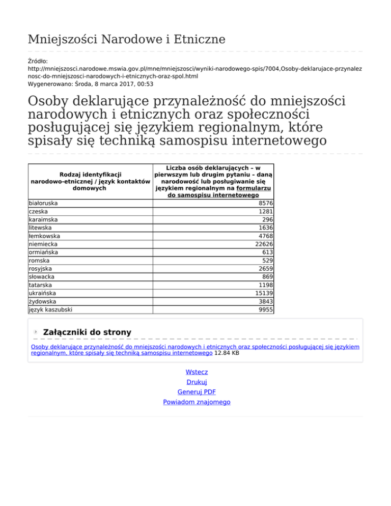 Mniejszości Narodowe i Etniczne Źródło: http://mniejszosci.narodowe.mswia.gov.pl/mne/mniejszosci/wyniki-narodowego-spis/7004,Osoby-deklarujace-przynalez nosc-do-mniejszosci-narodowych-i-etnicznych-oraz-spol.html Wygenerowano: Środa, 8 marca 2017, 00:53 Osoby deklarujące przynależność do mniejszości narodowych i etnicznych oraz społeczności posługującej się językiem regionalnym, które spisały się techniką samospisu internetowego Liczba osób deklarujących – w Rodzaj identyfikacji pierwszym lub drugim pytaniu – daną narodowo-etnicznej / język kontaktów narodowość lub posługiwanie się domowych językiem regionalnym na formularzu do samospisu internetowego białoruska 8576 czeska 1281 karaimska 296 litewska 1636 łemkowska 4768 niemiecka 22626 ormiańska 613 romska 529 rosyjska 2659 słowacka 869 tatarska 1198 ukraińska 15139 żydowska 3843 język kaszubski 9955 Załączniki do strony Osoby deklarujące przynależność do mniejszości narodowych i etnicznych oraz społeczności posługującej się językiem regionalnym, które spisały się techniką samospisu internetowego 12.84 KB Wstecz Drukuj Generuj PDF Powiadom znajomego