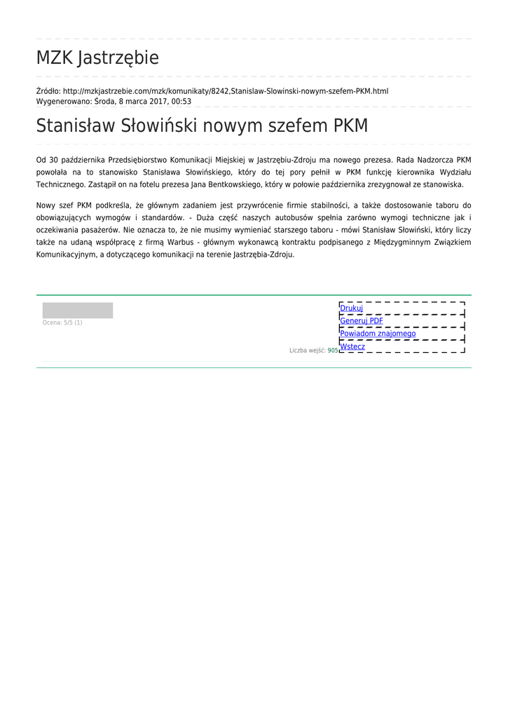 MZK Jastrzębie Źródło: http://mzkjastrzebie.com/mzk/komunikaty/8242,Stanislaw-Slowinski-nowym-szefem-PKM.html Wygenerowano: Środa, 8 marca 2017, 00:53 Stanisław Słowiński nowym szefem PKM Od 30 października Przedsiębiorstwo Komunikacji Miejskiej w Jastrzębiu-Zdroju ma nowego prezesa. Rada Nadzorcza PKM powołała na to stanowisko Stanisława Słowińskiego, który do tej pory pełnił w PKM funkcję kierownika Wydziału Technicznego. Zastąpił on na fotelu prezesa Jana Bentkowskiego, który w połowie października zrezygnował ze stanowiska. Nowy szef PKM podkreśla, że głównym zadaniem jest przywrócenie firmie stabilności, a także dostosowanie taboru do obowiązujących wymogów i standardów. - Duża część naszych autobusów spełnia zarówno wymogi techniczne jak i oczekiwania pasażerów. Nie oznacza to, że nie musimy wymieniać starszego taboru - mówi Stanisław Słowiński, który liczy także na udaną współpracę z firmą Warbus - głównym wykonawcą kontraktu podpisanego z Międzygminnym Związkiem Komunikacyjnym, a dotyczącego komunikacji na terenie Jastrzębia-Zdroju. Drukuj Generuj PDF Ocena: 5/5 (1) Powiadom znajomego Liczba wejść: 905 Wstecz