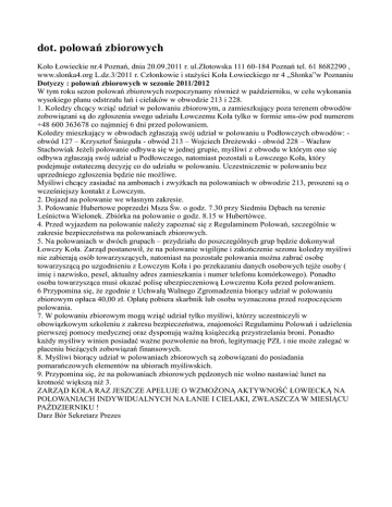 dot. polowań zbiorowych Koło Łowieckie nr.4 Poznań, dnia 20.09.2011 r. ul.Złotowska 111 60-184 Poznań tel. 61 8682290 , www.slonka4.org L.dz.3/2011 r. Członkowie i stażyści Koła Łowieckiego nr 4 „Słonka”w Poznaniu Dotyczy : polowań zbiorowych w sezonie 2011/2012 W tym roku sezon polowań zbiorowych rozpoczynamy również w październiku, w celu wykonania wysokiego planu odstrzału łań i cielaków w obwodzie 213 i 228. 1. Koledzy chcący wziąć udział w polowaniu zbiorowym, a zamieszkujący poza terenem obwodów zobowiązani są do zgłoszenia swego udziału Łowczemu Koła tylko w formie sms-ów pod numerem +48 600 363678 co najmniej 6 dni przed polowaniem. Koledzy mieszkający w obwodach zgłaszają swój udział w polowaniu u Podłowczych obwodów: obwód 127 – Krzysztof Śnieguła - obwód 213 – Wojciech Dreżewski - obwód 228 – Wacław Stachowiak Jeżeli polowanie odbywa się w jednej grupie, myśliwi z obwodu w którym ono się odbywa zgłaszają swój udział u Podłowczego, natomiast pozostali u Łowczego Koła, który podejmuje ostateczną decyzję co do udziału w polowaniu. Uczestniczenie w polowaniu bez uprzedniego zgłoszenia będzie nie możliwe. Myśliwi chcący zasiadać na ambonach i zwyżkach na polowaniach w obwodzie 213, proszeni są o wcześniejszy kontakt z Łowczym. 2. Dojazd na polowanie we własnym zakresie. 3. Polowanie Hubertowe poprzedzi Msza Św. o godz. 7.30 przy Siedmiu Dębach na terenie Leśnictwa Wielonek. Zbiórka na polowanie o godz. 8.15 w Hubertówce. 4. Przed wyjazdem na polowanie należy zapoznać się z Regulaminem Polowań, szczególnie w zakresie bezpieczeństwa na polowaniach zbiorowych. 5. Na polowaniach w dwóch grupach – przydziału do poszczególnych grup będzie dokonywał Łowczy Koła. Zarząd postanowił, że na polowanie wigilijne i zakończenie sezonu koledzy myśliwi nie zabierają osób towarzyszących, natomiast na pozostałe polowania można zabrać osobę towarzyszącą po uzgodnieniu z Łowczym Koła i po przekazaniu danych osobowych tejże osoby ( imię i nazwisko, pesel, aktualny adres zamieszkania i numer telefonu komórkowego). Ponadto osoba towarzysząca musi okazać polisę ubezpieczeniową Łowczemu Koła przed polowaniem. 6 Przypomina się, że zgodnie z Uchwałą Walnego Zgromadzenia biorący udział w polowaniu zbiorowym opłaca 40,00 zł. Opłatę pobiera skarbnik lub osoba wyznaczona przed rozpoczęciem polowania. 7. W polowaniu zbiorowym mogą wziąć udział tylko myśliwi, którzy uczestniczyli w obowiązkowym szkoleniu z zakresu bezpieczeństwa, znajomości Regulaminu Polowań i udzielenia pierwszej pomocy medycznej oraz dysponują ważną książeczką przystrzelania broni. Ponadto każdy myśliwy winien posiadać ważne pozwolenie na broń, legitymację PZŁ i nie może zalegać w płaceniu bieżących zobowiązań finansowych. 8. Myśliwi biorący udział w polowaniach zbiorowych są zobowiązani do posiadania pomarańczowych elementów na ubiorach myśliwskich. 9. Przypomina się, że na polowaniach zbiorowych pędzonych nie wolno nastawiać lunet na krotność większą niż 3. ZARZĄD KOŁA RAZ JESZCZE APELUJE O WZMOŻONĄ AKTYWNOŚĆ ŁOWIECKĄ NA POLOWANIACH INDYWIDUALNYCH NA ŁANIE I CIELAKI, ZWŁASZCZA W MIESIĄCU PAŹDZIERNIKU ! Darz Bór Sekretarz Prezes