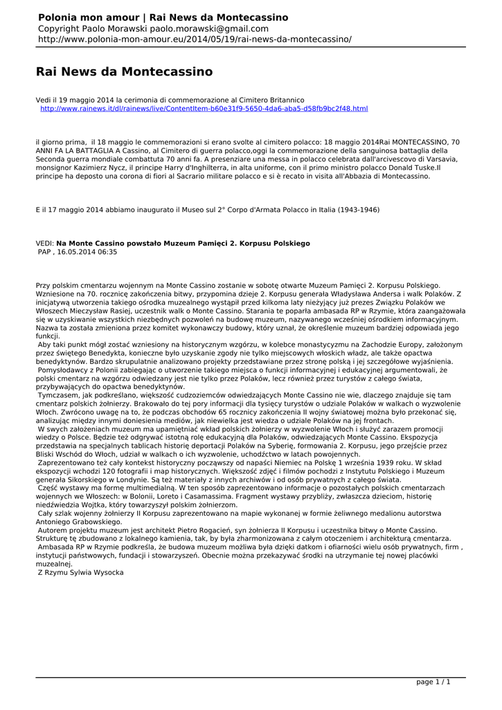 Polonia mon amour | Rai News da Montecassino Copyright Paolo Morawski [email protected] http://www.polonia-mon-amour.eu/2014/05/19/rai-news-da-montecassino/ Rai News da Montecassino Vedi il 19 maggio 2014 la cerimonia di commemorazione al Cimitero Britannico http://www.rainews.it/dl/rainews/live/ContentItem-b60e31f9-5650-4da6-aba5-d58fb9bc2f48.html il giorno prima, il 18 maggio le commemorazioni si erano svolte al cimitero polacco: 18 maggio 2014Rai MONTECASSINO, 70 ANNI FA LA BATTAGLIA A Cassino, al Cimitero di guerra polacco,oggi la commemorazione della sanguinosa battaglia della Seconda guerra mondiale combattuta 70 anni fa. A presenziare una messa in polacco celebrata dall'arcivescovo di Varsavia, monsignor Kazimierz Nycz, il principe Harry d'Inghilterra, in alta uniforme, con il primo ministro polacco Donald Tuske.Il principe ha deposto una corona di fiori al Sacrario militare polacco e si è recato in visita all'Abbazia di Montecassino. E il 17 maggio 2014 abbiamo inaugurato il Museo sul 2° Corpo d'Armata Polacco in Italia (1943-1946) VEDI: Na Monte Cassino powstało Muzeum Pamięci 2. Korpusu Polskiego PAP , 16.05.2014 06:35 Przy polskim cmentarzu wojennym na Monte Cassino zostanie w sobotę otwarte Muzeum Pamięci 2. Korpusu Polskiego. Wzniesione na 70. rocznicę zakończenia bitwy, przypomina dzieje 2. Korpusu generała Władysława Andersa i walk Polaków. Z inicjatywą utworzenia takiego ośrodka muzealnego wystąpił przed kilkoma laty nieżyjący już prezes Związku Polaków we Włoszech Mieczysław Rasiej, uczestnik walk o Monte Cassino. Starania te poparła ambasada RP w Rzymie, która zaangażowała się w uzyskiwanie wszystkich niezbędnych pozwoleń na budowę muzeum, nazywanego wcześniej ośrodkiem informacyjnym. Nazwa ta została zmieniona przez komitet wykonawczy budowy, który uznał, że określenie muzeum bardziej odpowiada jego funkcji. Aby taki punkt mógł zostać wzniesiony na historycznym wzgórzu, w kolebce monastycyzmu na Zachodzie Europy, założonym przez świętego Benedykta, konieczne było uzyskanie zgody nie tylko miejscowych włoskich władz, ale także opactwa benedyktynów. Bardzo skrupulatnie analizowano projekty przedstawiane przez stronę polską i jej szczegółowe wyjaśnienia. Pomysłodawcy z Polonii zabiegając o utworzenie takiego miejsca o funkcji informacyjnej i edukacyjnej argumentowali, że polski cmentarz na wzgórzu odwiedzany jest nie tylko przez Polaków, lecz również przez turystów z całego świata, przybywających do opactwa benedyktynów. Tymczasem, jak podkreślano, większość cudzoziemców odwiedzających Monte Cassino nie wie, dlaczego znajduje się tam cmentarz polskich żołnierzy. Brakowało do tej pory informacji dla tysięcy turystów o udziale Polaków w walkach o wyzwolenie Włoch. Zwrócono uwagę na to, że podczas obchodów 65 rocznicy zakończenia II wojny światowej można było przekonać się, analizując między innymi doniesienia mediów, jak niewielka jest wiedza o udziale Polaków na jej frontach. W swych założeniach muzeum ma upamiętniać wkład polskich żołnierzy w wyzwolenie Włoch i służyć zarazem promocji wiedzy o Polsce. Będzie też odgrywać istotną rolę edukacyjną dla Polaków, odwiedzających Monte Cassino. Ekspozycja przedstawia na specjalnych tablicach historię deportacji Polaków na Syberię, formowania 2. Korpusu, jego przejście przez Bliski Wschód do Włoch, udział w walkach o ich wyzwolenie, uchodźctwo w latach powojennych. Zaprezentowano też cały kontekst historyczny począwszy od napaści Niemiec na Polskę 1 września 1939 roku. W skład ekspozycji wchodzi 120 fotografii i map historycznych. Większość zdjęć i filmów pochodzi z Instytutu Polskiego i Muzeum generała Sikorskiego w Londynie. Są też materiały z innych archiwów i od osób prywatnych z całego świata. Część wystawy ma formę multimedialną. W ten sposób zaprezentowano informacje o pozostałych polskich cmentarzach wojennych we Włoszech: w Bolonii, Loreto i Casamassima. Fragment wystawy przybliży, zwłaszcza dzieciom, historię niedźwiedzia Wojtka, który towarzyszył polskim żołnierzom. Cały szlak wojenny żołnierzy II Korpusu zaprezentowano na mapie wykonanej w formie żeliwnego medalionu autorstwa Antoniego Grabowskiego. Autorem projektu muzeum jest architekt Pietro Rogacień, syn żołnierza II Korpusu i uczestnika bitwy o Monte Cassino. Strukturę tę zbudowano z lokalnego kamienia, tak, by była zharmonizowana z całym otoczeniem i architekturą cmentarza. Ambasada RP w Rzymie podkreśla, że budowa muzeum możliwa była dzięki datkom i ofiarności wielu osób prywatnych, firm , instytucji państwowych, fundacji i stowarzyszeń. Obecnie można przekazywać środki na utrzymanie tej nowej placówki muzealnej. Z Rzymu Sylwia Wysocka page 1 / 1