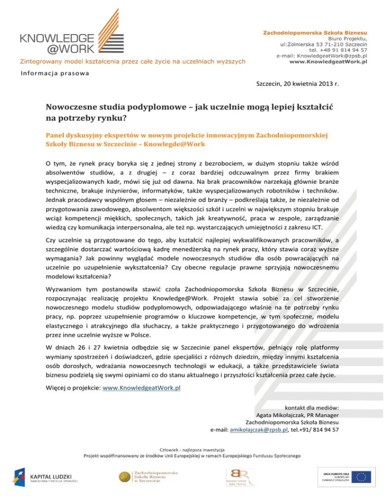 Informacja prasowa Szczecin, 20 kwietnia 2013 r. Nowoczesne studia podyplomowe – jak uczelnie mogą lepiej kształcić na potrzeby rynku? Panel dyskusyjny ekspertów w nowym projekcie innowacyjnym Zachodniopomorskiej Szkoły Biznesu w Szczecinie – Knowlegde@Work O tym, że rynek pracy boryka się z jednej strony z bezrobociem, w dużym stopniu także wśród absolwentów studiów, a z drugiej – z coraz bardziej odczuwalnym przez firmy brakiem wyspecjalizowanych kadr, mówi się już od dawna. Na brak pracowników narzekają głównie branże techniczne, brakuje inżynierów, informatyków, także wyspecjalizowanych robotników i techników. Jednak pracodawcy wspólnym głosem – niezależnie od branży – podkreślają także, że niezależnie od przygotowania zawodowego, absolwentom większości szkół i uczelni w największym stopniu brakuje wciąż kompetencji miękkich, społecznych, takich jak kreatywność, praca w zespole, zarządzanie wiedzą czy komunikacja interpersonalna, ale też np. wystarczających umiejętności z zakresu ICT. Czy uczelnie są przygotowane do tego, aby kształcić najlepiej wykwalifikowanych pracowników, a szczególnie dostarczać wartościową kadrę menedżerską na rynek pracy, który stawia coraz wyższe wymagania? Jak powinny wyglądać modele nowoczesnych studiów dla osób powracających na uczelnie po uzupełnienie wykształcenia? Czy obecne regulacje prawne sprzyjają nowoczesnemu modelowi kształcenia? Wyzwaniom tym postanowiła stawić czoła Zachodniopomorska Szkoła Biznesu w Szczecinie, rozpoczynając realizację projektu Knowledge@Work. Projekt stawia sobie za cel stworzenie nowoczesnego modelu studiów podyplomowych, odpowiadającego właśnie na te potrzeby rynku pracy, np. poprzez uzupełnienie programów o kluczowe kompetencje, w tym społeczne, modelu elastycznego i atrakcyjnego dla słuchaczy, a także praktycznego i przygotowanego do wdrożenia przez inne uczelnie wyższe w Polsce. W dniach 26 i 27 kwietnia odbędzie się w Szczecinie panel ekspertów, pełniący rolę platformy wymiany spostrzeżeń i doświadczeń, gdzie specjaliści z różnych dziedzin, między innymi kształcenia osób dorosłych, wdrażania nowoczesnych technologii w edukacji, a także przedstawiciele świata biznesu podzielą się swymi opiniami co do stanu aktualnego i przyszłości kształcenia przez całe życie. Więcej o projekcie: www.KnowledgeatWork.pl kontakt dla mediów: Agata Mikołajczak, PR Manager Zachodniopomorska Szkoła Biznesu e-mail: [email protected], tel.+91/ 814 94 57 Informacja prasowa O Projekcie Celem projektu jest wzmocnienie potencjału dydaktycznego polskich uczelni poprzez opracowanie i wdrożenie zintegrowanego modelu LLL (lifelong learning) Knowledge@Work. Realizacja polityki uczenia się przez całe życie wymaga unowocześnienia formuły nauczania osób dorosłych na uczelniach wyższych. Studia podyplomowe na dzień dzisiejszy zdominowane są przez podejście szkolne, w którym edukacja osób dorosłych przypomina, pod względem wzorów organizacyjnych i dydaktyki, edukację uczniów i studentów. Natomiast modele nauczania dla tej grupy muszą być inne – przede wszystkim powinny być oparte na uznaniu zgromadzonego już doświadczenia, autonomiczności i odpowiedzialności osób dorosłych oraz na ścisłym związku uczenia się z pracą zawodową. Model Knowledge@Work stworzy możliwość integracji kilku form kształcenia ustawicznego w ramach studiów podyplomowych i przyczyni się do zwiększenia ich elastyczności i spersonalizowania programu nauczania. Dodatkowo zwiększy też użyteczność tych studiów dla rynku pracy, dzięki uwzględnieniu w programie 10 kluczowych kompetencji, wymaganych przez pracodawców (•umiejętność funkcjonowania w otoczeniu międzynarodowym •zarządzanie zespołami •praca w zespole •kreatywność •zarządzanie wiedzą •komunikacja interpersonalna •autoprezentacja •znajomość technologii ICT •ochrona własności intelektualnej •ugruntowane podstawy matematyki). Projekt innowacyjny testujący „Knowledge@Work – zintegrowany model kształcenia przez całe życie na uczelniach wyższych” jest projektem konkursowym współfinansowanym ze środków Unii Europejskiej w ramach Europejskiego Funduszu Społecznego, z Programu Operacyjnego Kapitał Ludzki w ramach Priorytetu IV - Szkolnictwo wyższe i nauka. www.KnowledgeatWork.pl Realizujący projekt Zachodniopomorska Szkoła Biznesu w Szczecinie – założona w 1993 roku, jest jedną z pierwszych prywatnych uczelni w Polsce. Posiada 5 stałych kierunków studiów, zajęcia prowadzone są w językach polskim i angielskim. Uczelnia proponuje także studia w systemie e-learning. Organizowane są praktyki wirtualne w partnerstwie z 16 uczelniami zagranicznymi z 7 krajów Europy. W ramach Zachodniopomorskiej Szkoły Biznesu działa Centrum Rozwoju Biznesu, założone w 1997 roku z inicjatywy British Know How for Poland i brytyjskiego konsorcjum International Recourse Development. Głównym celem powstania CBR był rozwój działalności edukacyjnej na rzecz środowiska biznesowego na Pomorzu Zachodnim. W ramach działalności CBR prowadzone są studia podyplomowe oraz Executive MBA w Zachodniopomorskiej Szkole Biznesu. Szkoła posiada wieloletnie doświadczenie w kształceniu kadr menedżerskich, również z uwzględnieniem kadr gospodarki opartej na wiedzy. Wśród 12 projektów unijnych i międzynarodowych, realizowanych w ostatnich 5 latach, ZPSB zrealizowała przynajmniej 6 projektów o podobnej problematyce. www.zpsb.pl