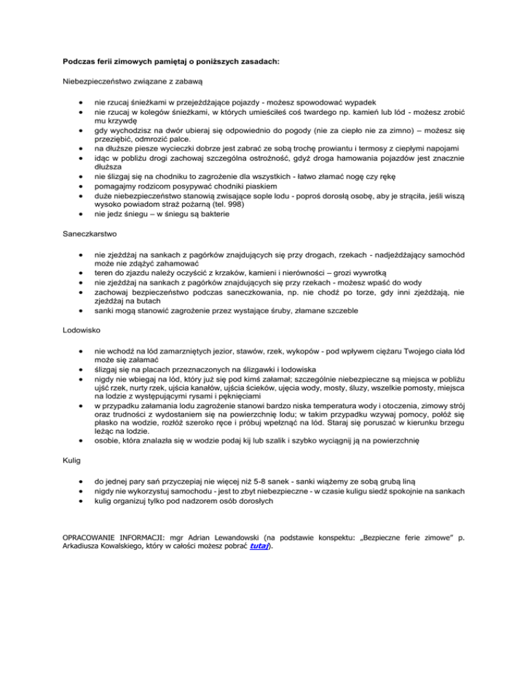 Podczas ferii zimowych pamiętaj o poniższych zasadach: Niebezpieczeństwo związane z zabawą nie rzucaj śnieżkami w przejeżdżające pojazdy - możesz spowodować wypadek nie rzucaj w kolegów śnieżkami, w których umieściłeś coś twardego np. kamień lub lód - możesz zrobić mu krzywdę gdy wychodzisz na dwór ubieraj się odpowiednio do pogody (nie za ciepło nie za zimno) – możesz się przeziębić, odmrozić palce. na dłuższe piesze wycieczki dobrze jest zabrać ze sobą trochę prowiantu i termosy z ciepłymi napojami idąc w pobliżu drogi zachowaj szczególna ostrożność, gdyż droga hamowania pojazdów jest znacznie dłuższa nie ślizgaj się na chodniku to zagrożenie dla wszystkich - łatwo złamać nogę czy rękę pomagajmy rodzicom posypywać chodniki piaskiem duże niebezpieczeństwo stanowią zwisające sople lodu - poproś dorosłą osobę, aby je strąciła, jeśli wiszą wysoko powiadom straż pożarną (tel. 998) nie jedz śniegu – w śniegu są bakterie Saneczkarstwo nie zjeżdżaj na sankach z pagórków znajdujących się przy drogach, rzekach - nadjeżdżający samochód może nie zdążyć zahamować teren do zjazdu należy oczyścić z krzaków, kamieni i nierówności – grozi wywrotką nie zjeżdżaj na sankach z pagórków znajdujących się przy rzekach - możesz wpaść do wody zachowaj bezpieczeństwo podczas saneczkowania, np. nie chodź po torze, gdy inni zjeżdżają, nie zjeżdżaj na butach sanki mogą stanowić zagrożenie przez wystające śruby, złamane szczeble Lodowisko nie wchodź na lód zamarzniętych jezior, stawów, rzek, wykopów - pod wpływem ciężaru Twojego ciała lód może się załamać ślizgaj się na placach przeznaczonych na ślizgawki i lodowiska nigdy nie wbiegaj na lód, który już się pod kimś załamał; szczególnie niebezpieczne są miejsca w pobliżu ujść rzek, nurty rzek, ujścia kanałów, ujścia ścieków, ujęcia wody, mosty, śluzy, wszelkie pomosty, miejsca na lodzie z występującymi rysami i pęknięciami w przypadku załamania lodu zagrożenie stanowi bardzo niska temperatura wody i otoczenia, zimowy strój oraz trudności z wydostaniem się na powierzchnię lodu; w takim przypadku wzywaj pomocy, połóż się płasko na wodzie, rozłóż szeroko ręce i próbuj wpełznąć na lód. Staraj się poruszać w kierunku brzegu leżąc na lodzie. osobie, która znalazła się w wodzie podaj kij lub szalik i szybko wyciągnij ją na powierzchnię Kulig do jednej pary sań przyczepiaj nie więcej niż 5-8 sanek - sanki wiążemy ze sobą grubą liną nigdy nie wykorzystuj samochodu - jest to zbyt niebezpieczne - w czasie kuligu siedź spokojnie na sankach kulig organizuj tylko pod nadzorem osób dorosłych OPRACOWANIE INFORMACJI: mgr Adrian Lewandowski (na podstawie konspektu: „Bezpieczne ferie zimowe” p. Arkadiusza Kowalskiego, który w całości możesz pobrać tutaj).