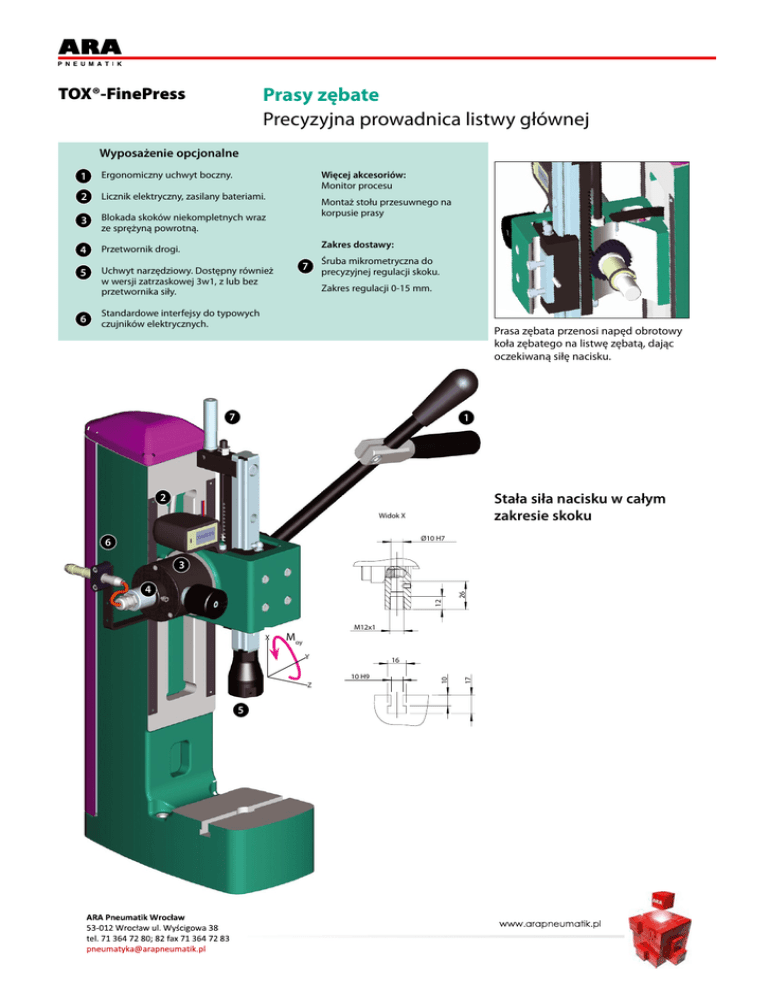 Prasy zębate Precyzyjna prowadnica listwy głównej TOX®-FinePress Wyposażenie opcjonalne 1 Ergonomiczny uchwyt boczny. 2 Licznik elektryczny, zasilany bateriami. 3 Blokada skoków niekompletnych wraz ze sprężyną powrotną. 4 Przetwornik drogi. 5 Uchwyt narzędziowy. Dostępny również w wersji zatrzaskowej 3w1, z lub bez przetwornika siły. Montaż stołu przesuwnego na korpusie prasy Zakres dostawy: 7 Śruba mikrometryczna do precyzyjnej regulacji skoku. Zakres regulacji 0-15 mm. Standardowe interfejsy do typowych czujników elektrycznych. Prasa zębata przenosi napęd obrotowy koła zębatego na listwę zębatą, dając oczekiwaną siłę nacisku. 7 1 Stała siła nacisku w całym zakresie skoku 2 Widok X Ø10 H7 6 3 12 26 4 M12x1 Moy Y Z 5 16 10 H9 17 X 10 6 Więcej akcesoriów: Monitor procesu Modułowy system „na miarę” TOX®-FinePress Prasy z listwą i kołem zębatym, w zakresie sił 2,5 – 4kN, wysoka precyzja, prowadnica nie wymaga regulacji, zabezpieczenie przed obrotem. Najwyższa jakość TOX®! Prasa zębata, z korpusem standardowym, typ S Kod zamów. maks. Siła maks. siła na skok do nacisku uchwyt obrotu uchwytu [kN] 2,5 4 ZFS 002.000 ZFS 004.000 N 200 300 Wszystkie wymiary w mm. A 56/213° 80/218° Otwór Masa stołu C S K 90 55-190 55 95 80-230 80 M BxT 465 110x90 535 130x110 L 260 285 Ø 20 20 kg 22 33 maks. Moy odkszt. moment dopuszc. * 0,05 0,05 E Ø [Nm] 25 25 9 9 F G H 72 203 76 78 214 94 9 F G H 94 263 110 *Głowica w najwyższym położeniu Prasa zębata, z korpusem podwyższonym, typ L Kod zamów. maks. Siła maks. siła na skok do nacisku uchwyt obrotu uchwytu [kN] 4 ZFL 004.000 N 300 Wszystkie wymiary w mm. A 80/218° Otwór Masa stołu C S K M 120 85-355 95 674 BxT L 150x125 339 Ø 20 kg 47 maks. Moy odkszt. moment dopuszc. * 0,05 E Ø [Nm] 25 *Głowica w najwyższym położeniu Prasa zębata, z powiększonym obszarem roboczym, typ W Kod zamów. maks. Siła maks. siła na skok do nacisku uchwyt obrotu uchwytu [kN] 4 ZFW 004.000 N 300 Wszystkie wymiary w mm. A C S K M BxT L 80/218° 300 225-370 150 745 200x200 624 Ø 20 kg 104 maks. Moy odkszt. moment dopuszc. * 0,05 E Ø [Nm] 25 F G H 9 145 500 100 C = Głębokość korpusu S = Rozwarcie, regulowane E = Otwór montażowy *Głowica w najwyższym położeniu Przykład zamawiania LL M M Otwór Masa stołu TT Wersja Maks. siła nacisku Prasa zębata Korpus typ S + ZZR 001 Blokada skoków + ZEZ 001 Licznik E Akcesoria i systemy sterowania prosimy zamawiać osobno. F H G K K CC S S A A B B WidokX X Widok ZFS 004.000 + opcje, np: Uwaga: głowice pras można również zamawiać osobno. Ceny na życzenie.