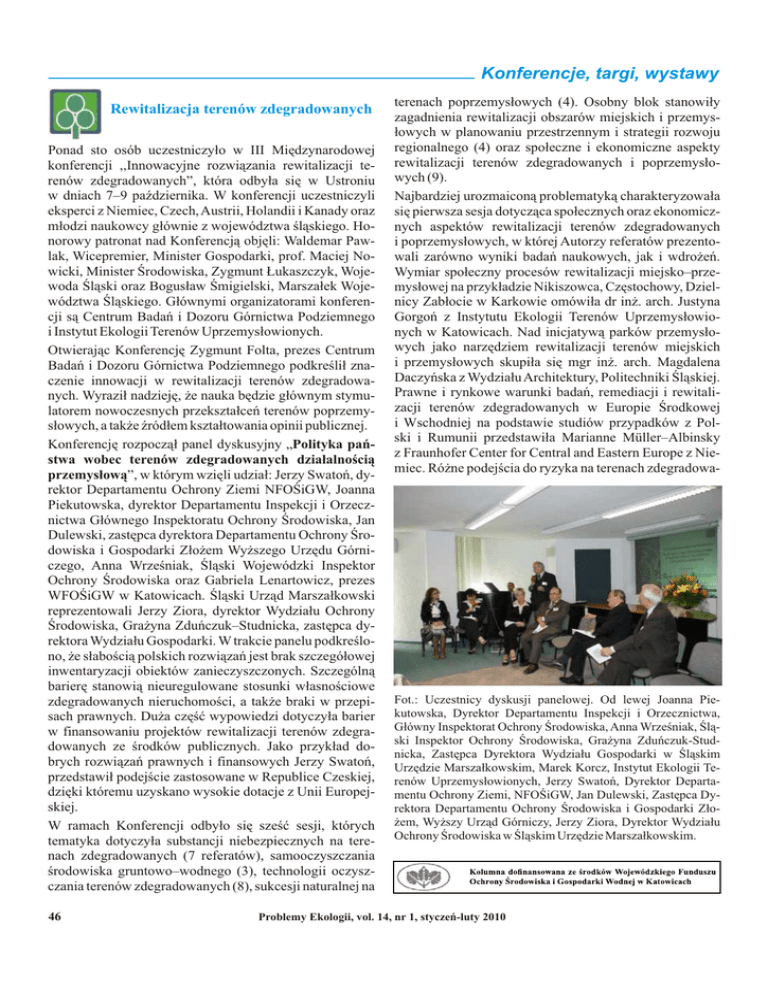 Konferencje, targi, wystawy Rewitalizacja terenów zdegradowanych Ponad sto osób uczestniczy³o w III Miêdzynarodowej konferencji ,,Innowacyjne rozwi¹zania rewitalizacji terenów zdegradowanych”, która odby³a siê w Ustroniu w dniach 7–9 paŸdziernika. W konferencji uczestniczyli eksperci z Niemiec, Czech, Austrii, Holandii i Kanady oraz m³odzi naukowcy g³ównie z województwa œl¹skiego. Honorowy patronat nad Konferencj¹ objêli: Waldemar Pawlak, Wicepremier, Minister Gospodarki, prof. Maciej Nowicki, Minister Œrodowiska, Zygmunt £ukaszczyk, Wojewoda Œl¹ski oraz Bogus³aw Œmigielski, Marsza³ek Województwa Œl¹skiego. G³ównymi organizatorami konferencji s¹ Centrum Badañ i Dozoru Górnictwa Podziemnego i Instytut Ekologii Terenów Uprzemys³owionych. Otwieraj¹c Konferencjê Zygmunt Folta, prezes Centrum Badañ i Dozoru Górnictwa Podziemnego podkreœli³ znaczenie innowacji w rewitalizacji terenów zdegradowanych. Wyrazi³ nadziejê, ¿e nauka bêdzie g³ównym stymulatorem nowoczesnych przekszta³ceñ terenów poprzemys³owych, a tak¿e Ÿród³em kszta³towania opinii publicznej. Konferencjê rozpocz¹³ panel dyskusyjny „Polityka pañstwa wobec terenów zdegradowanych dzia³alnoœci¹ przemys³ow¹”, w którym wziêli udzia³: Jerzy Swatoñ, dyrektor Departamentu Ochrony Ziemi NFOŒiGW, Joanna Piekutowska, dyrektor Departamentu Inspekcji i Orzecznictwa G³ównego Inspektoratu Ochrony Œrodowiska, Jan Dulewski, zastêpca dyrektora Departamentu Ochrony Œrodowiska i Gospodarki Z³o¿em Wy¿szego Urzêdu Górniczego, Anna Wrzeœniak, Œl¹ski Wojewódzki Inspektor Ochrony Œrodowiska oraz Gabriela Lenartowicz, prezes WFOŒiGW w Katowicach. Œl¹ski Urz¹d Marsza³kowski reprezentowali Jerzy Ziora, dyrektor Wydzia³u Ochrony Œrodowiska, Gra¿yna Zduñczuk–Studnicka, zastêpca dyrektora Wydzia³u Gospodarki. W trakcie panelu podkreœlono, ¿e s³aboœci¹ polskich rozwi¹zañ jest brak szczegó³owej inwentaryzacji obiektów zanieczyszczonych. Szczególn¹ barierê stanowi¹ nieuregulowane stosunki w³asnoœciowe zdegradowanych nieruchomoœci, a tak¿e braki w przepisach prawnych. Du¿a czêœæ wypowiedzi dotyczy³a barier w finansowaniu projektów rewitalizacji terenów zdegradowanych ze œrodków publicznych. Jako przyk³ad dobrych rozwi¹zañ prawnych i finansowych Jerzy Swatoñ, przedstawi³ podejœcie zastosowane w Republice Czeskiej, dziêki któremu uzyskano wysokie dotacje z Unii Europejskiej. W ramach Konferencji odby³o siê szeœæ sesji, których tematyka dotyczy³a substancji niebezpiecznych na terenach zdegradowanych (7 referatów), samooczyszczania œrodowiska gruntowo–wodnego (3), technologii oczyszczania terenów zdegradowanych (8), sukcesji naturalnej na 46 terenach poprzemys³owych (4). Osobny blok stanowi³y zagadnienia rewitalizacji obszarów miejskich i przemys³owych w planowaniu przestrzennym i strategii rozwoju regionalnego (4) oraz spo³eczne i ekonomiczne aspekty rewitalizacji terenów zdegradowanych i poprzemys³owych (9). Najbardziej urozmaicon¹ problematyk¹ charakteryzowa³a siê pierwsza sesja dotycz¹ca spo³ecznych oraz ekonomicznych aspektów rewitalizacji terenów zdegradowanych i poprzemys³owych, w której Autorzy referatów prezentowali zarówno wyniki badañ naukowych, jak i wdro¿eñ. Wymiar spo³eczny procesów rewitalizacji miejsko–przemys³owej na przyk³adzie Nikiszowca, Czêstochowy, Dzielnicy Zab³ocie w Karkowie omówi³a dr in¿. arch. Justyna Gorgoñ z Instytutu Ekologii Terenów Uprzemys³owionych w Katowicach. Nad inicjatyw¹ parków przemys³owych jako narzêdziem rewitalizacji terenów miejskich i przemys³owych skupi³a siê mgr in¿. arch. Magdalena Daczyñska z Wydzia³u Architektury, Politechniki Œl¹skiej. Prawne i rynkowe warunki badañ, remediacji i rewitalizacji terenów zdegradowanych w Europie Œrodkowej i Wschodniej na podstawie studiów przypadków z Polski i Rumunii przedstawi³a Marianne Müller–Albinsky z Fraunhofer Center for Central and Eastern Europe z Niemiec. Ró¿ne podejœcia do ryzyka na terenach zdegradowa- Fot.: Uczestnicy dyskusji panelowej. Od lewej Joanna Piekutowska, Dyrektor Departamentu Inspekcji i Orzecznictwa, G³ówny Inspektorat Ochrony Œrodowiska, Anna Wrzeœniak, Œl¹ski Inspektor Ochrony Œrodowiska, Gra¿yna Zduñczuk-Studnicka, Zastêpca Dyrektora Wydzia³u Gospodarki w Œl¹skim Urzêdzie Marsza³kowskim, Marek Korcz, Instytut Ekologii Terenów Uprzemys³owionych, Jerzy Swatoñ, Dyrektor Departamentu Ochrony Ziemi, NFOŒiGW, Jan Dulewski, Zastêpca Dyrektora Departamentu Ochrony Œrodowiska i Gospodarki Z³o¿em, Wy¿szy Urz¹d Górniczy, Jerzy Ziora, Dyrektor Wydzia³u Ochrony Œrodowiska w Œl¹skim Urzêdzie Marsza³kowskim. Problemy Ekologii, vol. 14, nr 1, styczeñ-luty 2010 nych zaprezentowali dr in¿. Eleonora Wcis³o z Instytutu Ekologii Terenów Uprzemys³owionych, która pokaza³a zastosowanie oceny ryzyka zdrowotnego w procesie remediacji zanieczyszczonego terenu, a in¿. W³odzimierz Sokó³ z G³ównego Instytutu Górnictwa w Katowicach omówi³ problem weryfikacji narzêdzi zarz¹dzania ryzykiem do oceny popytu na technologie œrodowiskowe dotycz¹ce rewitalizacji terenów poprzemys³owych. Szczególnie gor¹c¹ dyskusjê przeprowadzono w trakcie drugiej sesji dotycz¹cej substancji niebezpiecznych na terenach zdegradowanych, na której prezentowano badania dotycz¹ce wykorzystania biotestów jako wskaŸników zanieczyszczenia gleb oraz testów ekotoksykologicznych w strategii rekultywacji i rewitalizacji œrodowiska realizowane w Instytucie Ekologii Terenów Uprzemys³owionych, na Uniwersytecie Przyrodniczym w Lublinie oraz w Katedrze Chemii Rolnej, Uniwersytetu Rolniczego w Krakowie. Na sesji poœwiêconej technologiom oczyszczania terenów zdegradowanych prezentowano m.in. wyniki badañ i wdro¿eñ dotycz¹ce chemostabilizacji i usuwania ze œrodowiska metali ciê¿kich i trwa³ych zanieczyszczeñ. Nowoczesn¹ technologiê katalitycznej 