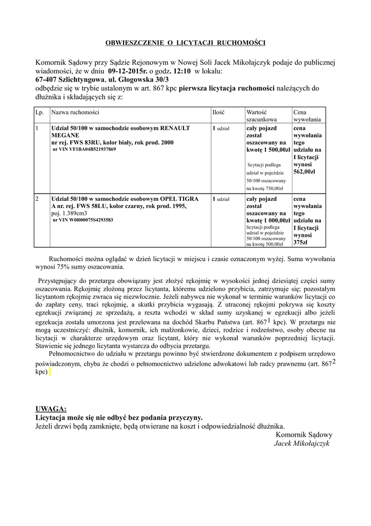 OBWIESZCZENIE O LICYTACJI RUCHOMOŚCI Komornik Sądowy przy Sądzie Rejonowym w Nowej Soli Jacek Mikołajczyk podaje do publicznej wiadomości, że w dniu 09-12-2015r. o godz. 12:10 w lokalu: 67-407 Szlichtyngowa, ul. Głogowska 30/3 odbędzie się w trybie ustalonym w art. 867 kpc pierwsza licytacja ruchomości należących do dłużnika i składających się z: Lp. Nazwa ruchomości Ilość 1 Udział 50/100 w samochodzie osobowym RENAULT MEGANE nr rej. FWS 83RU, kolor biały, rok prod. 2000 1 udział .nr VIN VF1BA04B521937869 Wartość szacunkowa cały pojazd został oszacowany na kwotę 1 500,00zł licytacji podlega udział w pojeździe Cena wywołania cena wywołania tego udziału na I licytacji wynosi 562,00zł 50/100 oszacowany na kwotę 750,00zł 2 Udział 50/100 w samochodzie osobowym OPEL TIGRA A nr. rej. FWS 58LU, kolor czarny, rok prod. 1995, poj. 1.389cm3 .nr VIN W0l000075S4293583 1 udział cały pojazd został oszacowany na kwotę 1 000,00zł licytacji podlega udział w pojeździe 50/100 oszacowany na kwotę 500,00zł cena wywołania tego udziału na I licytacji wynosi 375zł Ruchomości można oglądać w dzień licytacji w miejscu i czasie oznaczonym wyżej. Suma wywołania wynosi 75% sumy oszacowania. Przystępujący do przetargu obowiązany jest złożyć rękojmię w wysokości jednej dziesiątej części sumy oszacowania. Rękojmię złożoną przez licytanta, któremu udzielono przybicia, zatrzymuje się; pozostałym licytantom rękojmię zwraca się niezwłocznie. Jeżeli nabywca nie wykonał w terminie warunków licytacji co do zapłaty ceny, traci rękojmię, a skutki przybicia wygasają. Z utraconej rękojmi pokrywa się koszty egzekucji związanej ze sprzedażą, a reszta wchodzi w skład sumy uzyskanej w egzekucji albo jeżeli egzekucja została umorzona jest przelewana na dochód Skarbu Państwa (art. 867 1 kpc). W przetargu nie mogą uczestniczyć: dłużnik, komornik, ich małżonkowie, dzieci, rodzice i rodzeństwo, osoby obecne na licytacji w charakterze urzędowym oraz licytant, który nie wykonał warunków poprzedniej licytacji. Stawienie się jednego licytanta wystarcza do odbycia przetargu. Pełnomocnictwo do udziału w przetargu powinno być stwierdzone dokumentem z podpisem urzędowo poświadczonym, chyba że chodzi o pełnomocnictwo udzielone adwokatowi lub radcy prawnemu (art. 867 2 kpc) UWAGA: Licytacja może się nie odbyć bez podania przyczyny. Jeżeli drzwi będą zamknięte, będą otwierane na koszt i odpowiedzialność dłużnika. Komornik Sądowy Jacek Mikołajczyk