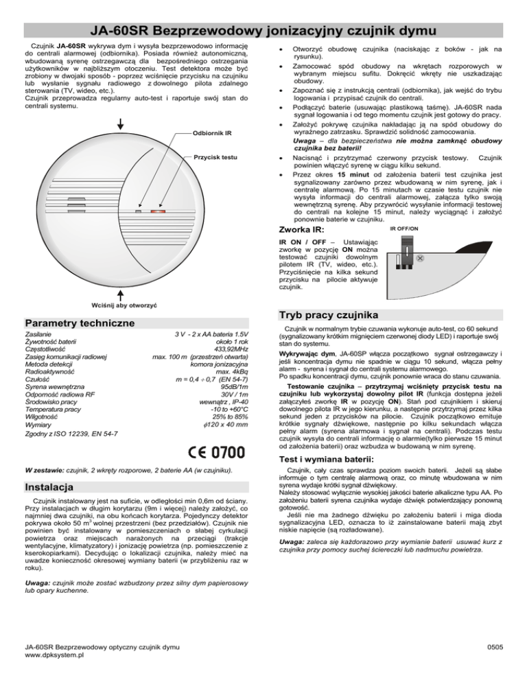 JA-60SR Bezprzewodowy jonizacyjny czujnik dymu Czujnik JA-60SR wykrywa dym i wysyła bezprzewodowo informację do centrali alarmowej (odbiornika). Posiada również autonomiczną, wbudowaną syrenę ostrzegawczą dla bezpośredniego ostrzegania użytkowników w najbliższym otoczeniu. Test detektora może być zrobiony w dwojaki sposób - poprzez wciśnięcie przycisku na czujniku lub wysłanie sygnału radiowego z dowolnego pilota zdalnego sterowania (TV, wideo, etc.). Czujnik przeprowadza regularny auto-test i raportuje swój stan do centrali systemu. • • • • • Odbiornik IR Przycisk testu • • Otworzyć obudowę czujnika (naciskając z boków - jak na rysunku). Zamocować spód obudowy na wkrętach rozporowych w wybranym miejscu sufitu. Dokręcić wkręty nie uszkadzając obudowy. Zapoznać się z instrukcją centrali (odbiornika), jak wejść do trybu logowania i przypisać czujnik do centrali. Podłączyć baterie (usuwając plastikową taśmę). JA-60SR nada sygnał logowania i od tego momentu czujnik jest gotowy do pracy. Założyć pokrywę czujnika nakładając ją na spód obudowy do wyraźnego zatrzasku. Sprawdzić solidność zamocowania. Uwaga – dla bezpieczeństwa nie można zamknąć obudowy czujnika bez baterii! Nacisnąć i przytrzymać czerwony przycisk testowy. Czujnik powinien włączyć syrenę w ciągu kilku sekund. Przez okres 15 minut od założenia baterii test czujnika jest sygnalizowany zarówno przez wbudowaną w nim syrenę, jak i centralę alarmową. Po 15 minutach w czasie testu czujnik nie wysyła informacji do centrali alarmowej, załącza tylko swoją wewnętrzną syrenę. Aby przywrócić wysyłanie informacji testowej do centrali na kolejne 15 minut, należy wyciągnąć i założyć ponownie baterie w czujniku. Zworka IR: IR OFF/ON IR ON / OFF – Ustawiąjąc zworkę w pozycję ON można testować czujniki dowolnym pilotem IR (TV, wideo, etc.). Przyciśnięcie na kilka sekund przycisku na pilocie aktywuje czujnik. Wciśnij aby otworzyć Tryb pracy czujnika Parametry techniczne Zasilanie Żywotność baterii Częstotliwość Zasięg komunikacji radiowej Metoda detekcji Radioaktywność Czułość Syrena wewnętrzna Odporność radiowa RF Środowisko pracy Temperatura pracy Wilgotność Wymiary Zgodny z ISO 12239, EN 54-7 3 V - 2 x AA bateria 1.5V około 1 rok 433,92MHz max. 100 m (przestrzeń otwarta) komora jonizacyjna max. 4kBq m = 0,4 ÷ 0,7 (EN 54-7) 95dB/1m 30V / 1m wewnątrz , IP-40 -10 to +60°C 25% to 85% φ120 x 40 mm Czujnik w normalnym trybie czuwania wykonuje auto-test, co 60 sekund (sygnalizowany krótkim mignięciem czerwonej diody LED) i raportuje swój stan do systemu. Wykrywając dym, JA-60SP włącza początkowo sygnał ostrzegawczy i jeśli koncentracja dymu nie spadnie w ciągu 10 sekund, włącza pełny alarm - syrena i sygnał do centrali systemu alarmowego. Po spadku koncentracji dymu, czujnik ponownie wraca do stanu czuwania. Testowanie czujnika – przytrzymaj wciśnięty przycisk testu na czujniku lub wykorzystaj dowolny pilot IR (funkcja dostępna jeżeli załączyłeś zworkę IR w pozycję ON). Stań pod czujnikiem i skieruj dowolnego pilota IR w jego kierunku, a następnie przytrzymaj przez kilka sekund jeden z przycisków na pilocie. Czujnik początkowo emituje krótkie sygnały dźwiękowe, następnie po kilku sekundach włącza pełny alarm (syrena alarmowa i sygnał na centrali). Podczas testu czujnik wysyła do centrali informację o alarmie(tylko pierwsze 15 minut od założenia baterii) oraz wzbudza w budowaną w nim syrenę. Test i wymiana baterii: W zestawie: czujnik, 2 wkręty rozporowe, 2 baterie AA (w czujniku). Instalacja Czujnik instalowany jest na suficie, w odległości min 0,6m od ściany. Przy instalacjach w długim korytarzu (9m i więcej) należy założyć, co najmniej dwa czujniki, na obu końcach korytarza. Pojedynczy detektor 3 pokrywa około 50 m wolnej przestrzeni (bez przedziałów). Czujnik nie powinien być instalowany w pomieszczeniach o słabej cyrkulacji powietrza oraz miejscach narażonych na przeciągi (trakcje wentylacyjne, klimatyzatory) i jonizację powietrza (np. pomieszczenie z kserokopiarkami). Decydując o lokalizacji czujnika, należy mieć na uwadze konieczność okresowej wymiany baterii (w przybliżeniu raz w roku). Czujnik, cały czas sprawdza poziom swoich baterii. Jeżeli są słabe informuje o tym centralę alarmową oraz, co minutę wbudowana w nim syrena wydaje krótki sygnał dźwiękowy. Należy stosować wyłącznie wysokiej jakości baterie alkaliczne typu AA. Po założeniu baterii syrena czujnika wydaje dźwięk potwierdzający ponowną gotowość. Jeśli nie ma żadnego dźwięku po założeniu baterii i miga dioda sygnalizacyjna LED, oznacza to iż zainstalowane baterii mają zbyt niskie napięcie (są rozładowane). Uwaga: zaleca się każdorazowo przy wymianie baterii usuwać kurz z czujnika przy pomocy suchej ściereczki lub nadmuchu powietrza. Uwaga: czujnik może zostać wzbudzony przez silny dym papierosowy lub opary kuchenne. JA-60SR Bezprzewodowy optyczny czujnik dymu www.dpksystem.pl 0505