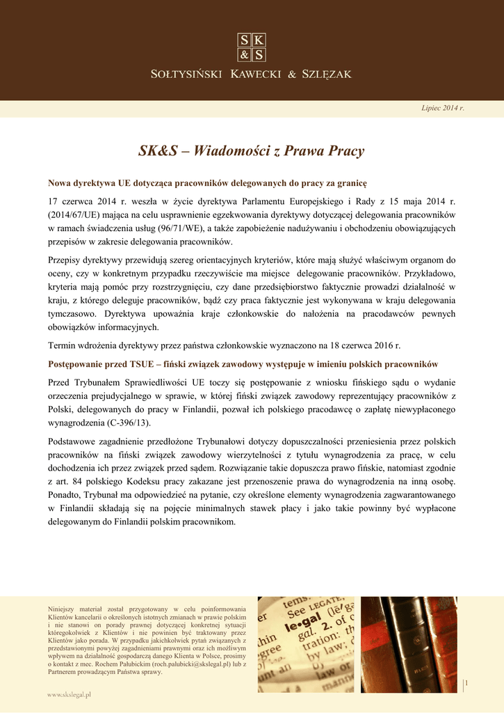 Lipiec 2014 r. SK&S – Wiadomości z Prawa Pracy Nowa dyrektywa UE dotycząca pracowników delegowanych do pracy za granicę 17 czerwca 2014 r. weszła w życie dyrektywa Parlamentu Europejskiego i Rady z 15 maja 2014 r. (2014/67/UE) mająca na celu usprawnienie egzekwowania dyrektywy dotyczącej delegowania pracowników w ramach świadczenia usług (96/71/WE), a także zapobieżenie nadużywaniu i obchodzeniu obowiązujących przepisów w zakresie delegowania pracowników. Przepisy dyrektywy przewidują szereg orientacyjnych kryteriów, które mają służyć właściwym organom do oceny, czy w konkretnym przypadku rzeczywiście ma miejsce delegowanie pracowników. Przykładowo, kryteria mają pomóc przy rozstrzygnięciu, czy dane przedsiębiorstwo faktycznie prowadzi działalność w kraju, z którego deleguje pracowników, bądź czy praca faktycznie jest wykonywana w kraju delegowania tymczasowo. Dyrektywa upoważnia kraje członkowskie do nałożenia na pracodawców pewnych obowiązków informacyjnych. Termin wdrożenia dyrektywy przez państwa członkowskie wyznaczono na 18 czerwca 2016 r. Postępowanie przed TSUE – fiński związek zawodowy występuje w imieniu polskich pracowników Przed Trybunałem Sprawiedliwości UE toczy się postępowanie z wniosku fińskiego sądu o wydanie orzeczenia prejudycjalnego w sprawie, w której fiński związek zawodowy reprezentujący pracowników z Polski, delegowanych do pracy w Finlandii, pozwał ich polskiego pracodawcę o zapłatę niewypłaconego wynagrodzenia (C-396/13). Podstawowe zagadnienie przedłożone Trybunałowi dotyczy dopuszczalności przeniesienia przez polskich pracowników na fiński związek zawodowy wierzytelności z tytułu wynagrodzenia za pracę, w celu dochodzenia ich przez związek przed sądem. Rozwiązanie takie dopuszcza prawo fińskie, natomiast zgodnie z art. 84 polskiego Kodeksu pracy zakazane jest przenoszenie prawa do wynagrodzenia na inną osobę. Ponadto, Trybunał ma odpowiedzieć na pytanie, czy określone elementy wynagrodzenia zagwarantowanego w Finlandii składają się na pojęcie minimalnych stawek płacy i jako takie powinny być wypłacone delegowanym do Finlandii polskim pracownikom. Niniejszy materiał został przygotowany w celu poinformowania Klientów kancelarii o określonych istotnych zmianach w prawie polskim i nie stanowi on porady prawnej dotyczącej konkretnej sytuacji któregokolwiek z Klientów i nie powinien być traktowany przez Klientów jako porada. W przypadku jakichkolwiek pytań związanych z przedstawionymi powyżej zagadnieniami prawnymi oraz ich możliwym wpływem na działalność gospodarczą danego Klienta w Polsce, prosimy o kontakt z mec. Rochem Pałubickim ([email protected]) lub z Partnerem prowadzącym Państwa sprawy. 1 Lipiec 2014 r. Wyrok Sądu Najwyższego – rażące naruszenie przepisów bhp W wyroku z dnia 6 lutego 2014 r. (I UK 318/13) Sąd Najwyższy analizował art. 36 ustawy o ubezpieczeniu społecznym z tytułu wypadków przy pracy i chorób zawodowych, zgodnie z którym inspektor pracy może wystąpić do ZUS z wnioskiem o podwyższenie płatnikowi, u którego w czasie dwóch kolejnych kontroli stwierdzono rażące naruszenie przepisów bhp, stopy procentowej składki na ubezpieczenie wypadkowe ustalanej na najbliższy rok składkowy o 100%. SN uznał, że użyte w ustawie pojęcie rażącego naruszenia przepisów bhp oznacza takie naruszenie, które stwarza bezpośrednie zagrożenie życia i zdrowia pracowników. Pojęcie bezpośredniego zagrożenia życia i zdrowia pracowników należy jednak interpretować ściśle i nie należy rozszerzać go na takie przypadki jak dopuszczenie pracowników do pracy bez wymaganych szkoleń bhp czy niepoinformowanie pracowników o zagrożeniach występujących w miejscu wykonywania pracy. Natomiast bezpośrednim zagrożeniem życia i zdrowia pracowników byłoby np. dopuszczenie pracowników do pracy bez zabezpieczenia przed upadkiem z wysokości. Wyrok Sądu Najwyższego – charakter wypadku podczas pracowniczych zawodów sportowych Sąd Najwyższy w wyroku z dnia 5 marca 2014 r. (II UK 354/13), nie zgadzając się ze stanowiskiem sądu I i II instancji, stwierdził, że kontuzja, której pracownik uległ w trakcie turnieju piłkarskiego zorganizowanego przez pracodawcę nie stanowi wypadku przy pracy w rozumieniu ustawy o ubezpieczeniu społecznym z tytułu wypadków przy pracy i chorób zawodowych. Oceny tej nie zmienił fakt, że zawody odbywały się w godzinach pracy poszkodowanego. SN uznał, że dobrowolny udział w tego rodzaju turniejach nie pozostaje w żadnym związku z wykonywaniem czynności pracowniczych i nie może być uznany za działanie na rzecz pracodawcy. Roch Pałubicki Karolina Nowotna Partner, radca prawny +48 61 856 04 14 [email protected] radca prawny +48 61 856 04 20 [email protected] 2