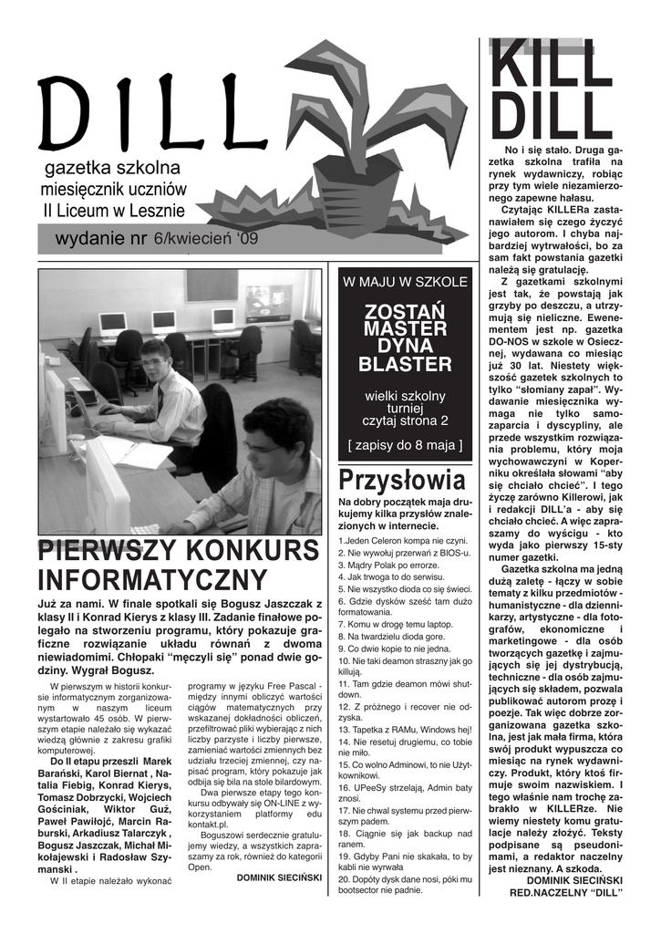 KILL DILL 6/kwiecień ʻ09 W MAJU W SZKOLE ZOSTAŃ MASTER DYNA BLASTER wielki szkolny turniej czytaj strona 2 [ zapisy do 8 maja ] PIERWSZY KONKURS INFORMATYCZNY Już za nami. W finale spotkali się Bogusz Jaszczak z klasy II i Konrad Kierys z klasy III. Zadanie finałowe polegało na stworzeniu programu, który pokazuje graficzne rozwiązanie układu równań z dwoma niewiadomimi. Chłopaki “męczyli się” ponad dwie godziny. Wygrał Bogusz. W pierwszym w historii konkursie informatycznym zorganizowanym w naszym liceum wystartowało 45 osób. W pierwszym etapie należało się wykazać wiedzą głównie z zakresu grafiki komputerowej. Do II etapu przeszli Marek Barański, Karol Biernat , Natalia Fiebig, Konrad Kierys, Tomasz Dobrzycki, Wojciech Gościniak, Wiktor Guź, Paweł Pawiłojć, Marcin Raburski, Arkadiusz Talarczyk , Bogusz Jaszczak, Michał Mikołajewski i Radosław Szymanski . W II etapie należało wykonać programy w języku Free Pascal między innymi obliczyć wartości ciągów matematycznych przy wskazanej dokładności obliczeń, przefiltrować pliki wybierając z nich liczby parzyste i liczby pierwsze, zamieniać wartości zmiennych bez udziału trzeciej zmiennej, czy napisać program, który pokazuje jak odbija się bila na stole bilardowym. Dwa pierwsze etapy tego konkursu odbywały się ON-LINE z wykorzystaniem platformy edu kontakt.pl. Boguszowi serdecznie gratulujemy wiedzy, a wszystkich zapraszamy za rok, również do kategorii Open. DOMINIK SIECIŃSKI Przysłowia Na dobry początek maja drukujemy kilka przysłów znalezionych w internecie. 1.Jeden Celeron kompa nie czyni. 2. Nie wywołuj przerwań z BIOS-u. 3. Mądry Polak po errorze. 4. Jak trwoga to do serwisu. 5. Nie wszystko dioda co się świeci. 6. Gdzie dysków sześć tam dużo formatowania. 7. Komu w drogę temu laptop. 8. Na twardzielu dioda gore. 9. Co dwie kopie to nie jedna. 10. Nie taki deamon straszny jak go killują. 11. Tam gdzie deamon mówi shutdown. 12. Z próżnego i recover nie odzyska. 13. Tapetka z RAMu, Windows hej! 14. Nie resetuj drugiemu, co tobie nie miło. 15. Co wolno Adminowi, to nie Użytkownikowi. 16. UPeeSy strzelają, Admin baty znosi. 17. Nie chwal systemu przed pierwszym padem. 18. Ciągnie się jak backup nad ranem. 19. Gdyby Pani nie skakała, to by kabli nie wyrwała 20. Dopóty dysk dane nosi, póki mu bootsector nie padnie. No i się stało. Druga gazetka szkolna trafiła na rynek wydawniczy, robiąc przy tym wiele niezamierzonego zapewne hałasu. Czytając KILLERa zastanawiałem się czego życzyć jego autorom. I chyba najbardziej wytrwałości, bo za sam fakt powstania gazetki należą się gratulację. Z gazetkami szkolnymi jest tak, że powstają jak grzyby po deszczu, a utrzymują się nieliczne. Ewenementem jest np. gazetka DO-NOS w szkole w Osiecznej, wydawana co miesiąc już 30 lat. Niestety większość gazetek szkolnych to tylko “słomiany zapał”. Wydawanie miesięcznika wymaga nie tylko samozaparcia i dyscypliny, ale przede wszystkim rozwiązania problemu, który moja wychowawczyni w Koperniku określała słowami “aby się chciało chcieć”. I tego życzę zarówno Killerowi, jak i redakcji DILLʼa - aby się chciało chcieć. A więc zapraszamy do wyścigu - kto wyda jako pierwszy 15-sty numer gazetki. Gazetka szkolna ma jedną dużą zaletę - łączy w sobie tematy z kilku przedmiotów humanistyczne - dla dziennikarzy, artystyczne - dla fotografów, ekonomiczne i marketingowe - dla osób tworzących gazetkę i zajmujących się jej dystrybucją, techniczne - dla osób zajmujących się składem, pozwala publikować autorom prozę i poezje. Tak więc dobrze zorganizowana gazetka szkolna, jest jak mała firma, która swój produkt wypuszcza co miesiąc na rynek wydawniczy. Produkt, który ktoś firmuje swoim nazwiskiem. I tego właśnie nam trochę zabrakło w KILLERze. Nie wiemy niestety komu gratulacje należy złożyć. Teksty podpisane są pseudonimami, a redaktor naczelny jest nieznany. A szkoda. DOMINIK SIECIŃSKI RED.NACZELNY “DILL” [2] [email protected] ZOSTAŃ ZOSTAŃ MASTER MASTER DYNA DYNA BLASTER BLASTER Chcesz być “MASTER” Dyna Blaster? Już w maju rusza konkurs informatyczny, którego uczestnicy zmierzą się ze sobą, grając w starszą wersje Bombermanʼa, Dyna Blaster. Do konkursu może zgłosić się maksymalnie 30. uczestników, z których w 1. etapie odpadnie połowa. Pozostała piętnastka zostanie podzielona losowo na trzy pięcioosobowe grupy, z których wychodzi tylko jeden zwycięzca, czyli łącznie trzy osoby na podium. W finale trójka najlepszych z najlepszych zmierzy się ze sobą na zaawansowanej mapie Dyna. Wszystkie rozgrywki będą odbywały się na przerwach, w salach informatycznych. Zgłoszenia uczestników przyjmowane są przez uczniów klas 1d i 1e do 08 maja na zasadzie “kto pierwszy ten lepszy”. Konkurs organizują: Asia Paszkowiak, Ania Gindera, Hania Klimkowska, Asia Kowalska, Jakub Bartkowiak, Dominik Bińkowski, Dominik Wels. JAKUB BARTKOWIAK, 1E MASZ POMYSŁ NA KONKURS SZKOLNY? Wykorzystaj www.edukontakt.pl i przygotuj rozgrywki on-line w internecie. Założ konto nauczycielskie, utwórz klasę, ogłoś zapisy na plakatach, potem przypisz zadania, oceń je i wybierz zwycięzcę! Na stronie niemieckiej firmy Invers Software pojawiła się pod koniec kwietnia nowa wersja programu iCalamus o numerze kodowym 1.16. Oprócz kilku nowości przydatnych przy pracy w wydawnictwach wersja 1.16 posiada polski interfejs użytkownika przygotowany przez uczniów klasy III naszej szkoły na fakultetach z informatyki. Chłopaki - gratulujemy! Dziś prezentujemy trzecie z serii zdjęć, jakie przygotowaliśmy dla Was. Na zwycięzcę czeka nagroda - niespodzianka. Aby wziąć udział w losowaniu nagrody należy przysłać nam przez SMS prawidłowe rozwiązanie, czyli podać gdzie znajduje się obiekt ze zdjęcia. Wysyłamy SMS o treści TC.DILL.MIEJSCOWOŚĆ numer 70068 i czekamy na losowanie nagrody. U