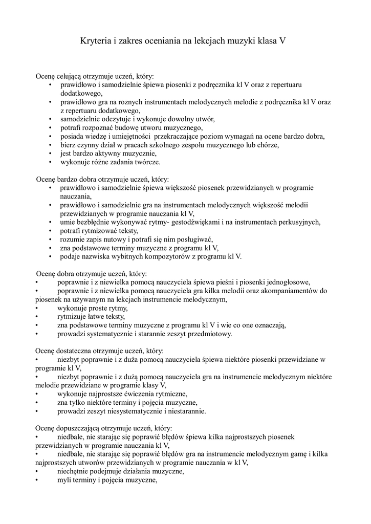 Kryteria i zakres oceniania na lekcjach muzyki klasa V