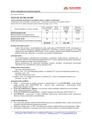 Karta zabezpieczeń antykorozyjnych Data wydania: 2010-03-01 ZESTAW EP 501-54/200 system malarski epoksydowy na podłoża stalowe, stalowe ocynkowane i aluminiowe dla warunków wewnętrznych , środowisko korozyjne C4 wg ISO 12944-5 System S4.20, trwałość zabezpieczenia antykorozyjnego pow. 15 lat EPOXYKOR M 501 farba epoksydowa do gruntowania z antykorozyjnym pigmentem fosforanowym 60 1 Grubość powłoki m] 140 EPOXYMAL 54 M emalia epoksydowa nawierzchniowa specjalna 60 1 60 RAZEM 2 min. 200 Nazwa handlowa / nazwa wyrobu Zaw. substancji nielotnych obj. Ilość warstw [%] Zużycie teoretyczne [ l/m2] 0,233 0,100 krótka charakterystyka : System farb złożony z dwuskładnikowej farby epoksydowej EPOXYKOR M 501 zawierającej w swoim składzie ekologiczny pigment fosforanowy, stanowiącej warstwę gruntującą oraz emalii epoksydowej chemoodpornej EPOXYMAL 54 M, tworzący powłoki bardzo dobrze przyczepne do podłoża stalowego, elastyczne, o wysokiej wytrzymałości mechanicznej. przeznaczenie : Do antykorozyjnego zabezpieczenia konstrukcji i elementów ocynkowanych i aluminiowych w przemyśle ciężkim oraz konstrukcji eksploatowanych w wysoko agresywnej atmosferze chemicznej, gdzie wymagany jest długi okres zabezpieczenia. System przeznaczony do malowania konstrukcji nośnych, dźwigów, zewnętrznych powierzchni zbiorników itp. o przedłużonym okresie zabezpieczenia. temperatura stosowania : Dla farby EPOXYKOR M 501: podłoża - min. +5oC oraz temperatura podłoża co najmniej 30C wyższa od temperatury punktu rosy; otoczenia - min. +5oC Dla farby EPOXYMAL 54 M: podłoża - min. +5oC temperatura podłoża co najmniej 30C wyższa od temperatury punktu rosy; otoczenia - do min. +5oC przygotowanie podłoża : STAL - oczyszczona do stopnia czystości co najmniej Sa 2 1/2 wg PN-ISO 8501 - 1 lub pokryta ciągłą powłoką farby EPOXYKOR FD - dotyczy stanu wyjściowego; powierzchnia sucha, pozbawiona tłuszczu i kurzu. STAL OCYNKOWANA ogniowo - oczyszczona i bardzo dokładnie odtłuszczona; powierzchnia sucha, pozbawiona tłuszczu i kurzu ; STAL OCYNKOWANA natryskowo - - podłoże zagruntowane farbą typu EPOXYMAL 12. ALUMINIUM - oczyszczone i bardzo dokładnie odtłuszczone; powierzchnia sucha, pozbawiona tłuszczu i kurzu, korzystnie zszorstkowana. uwagi technologiczne : Przy malowaniu pędzlem farbami EPOXYKOR konieczne jest nakładanie farby w kilku warstwach dla uzyskania zalecanej grubości pojedynczej powłoki. Najkrótszy odstęp czasu ( w 20oC ) od nałożenia powłoki do oddania pokrycia do eksploatacji -7 dni . Szczegółowe informacje o warunkach stosowania wyrobów podane są w kartach katalogowych farb. Fabryka Farb i Lakierów MALCHEM Sp. z o.o. Sułkowice 4, 05-650 Chynów Tel.: (0 48) 661 43 32, 33 ; fax: (0 48) 661 45 72. Dział Handlowy : Tel/fax: (0 48) 661 43 30 ; Tel.: (0 48) 661 48 56 ; www.malchem.com.pl ; e-mail: [email protected]