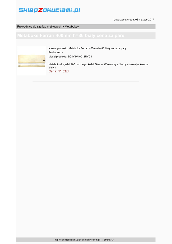 Utworzono: środa, 08 marzec 2017 Prowadnice do szuflad meblowych > Metaboksy Metaboks Ferrari 400mm h=86 biały cena za parę Nazwa produktu: Metaboks Ferrari 400mm h=86 biały cena za parę Producent: Model produktu: ZQ1V1V40012RVC1 Metaboks długości 400 mm i wysokości 86 mm. Wykonany z blachy stalowej w kolorze białym Cena: 11.62zł http://sklepzokuciami.pl | [email protected] | | Strona 1/1