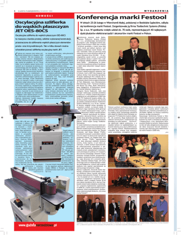 6 WYDARZENIA GAZETA NARZĘDZIOWA | MARZEC 2008 NOWOŚCI Konferencja marki Festool Oscylacyjna szlifierka do wąskich płaszczyzn JET OES-80CS Oscylacyjna szlifierka do wąskich płaszczyzn OES-80CS to maszyna o bardzo prostej, solidnie wykonanej konstrukcji, przeznaczona do szlifowania wąskich płaszczyzn elementów prosto- oraz krzywoliniowych. Tak w kilku słowach można scharakteryzować szlifierkę oscylacyjną marki JET. C zęścią tej maszyny jest taśma szlifierska bezkońcowa o długości 2260 mm i szerokości 150 mm rozpięta pomiędzy dwoma walcami. Bezpośrednio na silniku zamontowano walec napędzający taśmę do prędkości 16 m/s. Drugi walec ma za zadanie napiąć taśmę oraz wprawić ją w oscylację za pomocą zamontowanego pod nim agregatu. Taśma wykonuje 100 cykli na minutę, co gwarantuje gładką powierzchnię elementu obrabianego bez rys wzdłużnych. Jej położenie regulujemy za pomocą mechanizmu umieszczonego w górnej części walca biernego. Przed założeniem taśmy na maszynę trzeba w pierwszej kolejności zdjąć osłonę tylną oraz dźwignią zwolnić napięcie taśmy. Po założeniu nowej, napinamy ją, następnie próbnie uruchamiamy maszynę i korygujemy położenie taśmy wspomnianym mechanizmem. Czynność ta jest konieczna ze względu na zdarzające się rozbieżności w długości taśm dostarczanych na polski rynek przez wielu producentów. Ważnym elementem każdej maszyny jest stół roboczy. W tym przypadku ma on wy- miary 180 x 80 mm i jest wykonany z odlewu żeliwnego i zamocowany na korpusie z możliwością zmiany wysokości jego położenia. Jest to bardzo przydatne w przypadku szlifowania elementów o niewielkiej grubości. Podczas takiej operacji zużywamy tylko niewielką część taśmy ściernej. Przestawienie stołu procentuje pełniejszym wykorzystaniem całej szerokości materiału ściernego. W nim także wyfrezowano rowek w kształcie litery T przeznaczony do zamocowania przykładnicy wzdłużnej lub kątowej. Nie bez znaczenia dla jakości szlifowania i żywotności taśmy jest również okładzina grafitowa naklejona na stopie szlifierskiej, zdecydowanie zwiększająca poślizg. Z prawej strony szlifierki, bezpośrednio na silniku zawieszony jest stolik boczny wykorzystywany w przypadku szlifowania elementów krzywoliniowych. Także w tym przypadku jest możliwość regulacji położenia wysokości stołu. Agregat szlifujący w maszynie OES-80CS możemy ustawić w pionie, tak jak pokazano na fotografii, w poziomie oraz pod każdym pośrednim kątem. Funkcję tę wykorzystujemy szczególnie przy szlifowaniu tzw. fazy, czyli krawędzi ściętych do kąta. Odpylanie działa sprawnie zarówno podczas pracy na stole głównym, jak i bocznym. Po zdjęciu osłony odciągowej bez problemów możemy szlifować elementy o zdecydowanie większej długości niż stół roboczy. Gdy szlifujemy mniejsze elementy lub od czoła, możemy posłużyć się tzw. opornikiem przykręconym z prawej strony maszyny, który przeciwdziała porwaniu przedmiotu przez taśmę szlifującą. Zespół roboczy szlifierki przykręcony jest do estetycznej podstawy, wykonanej z grubej malowanej proszkowo blachy z praktycznym schowkiem na narzędzia. JET oferuje szlifierki OES-80CS w dwóch wersjach z silnikiem na 230 lub 400 V. Oba rozwiązania przeznaczone są do pracy ciągłej. Z tą oraz innymi maszynami będzie można się zapoznać podczas tegorocznych targów DREMA w Poznaniu na stoisku przedstawiciela marki JET Agencji AMK Sp z o.o. LP W dniach 25-26 lutego w Wierchomli Małej, położonej w Beskidzie Sądeckim, odbyła się konferencja marki Festool. Zorganizowała ją firma Tooltechnic Systems (Polska) Sp. z o.o. W spotkaniu wzięło udział ok. 70 osób, reprezentujących 40 najlepszych dystrybutorów elektronarzędzi i akcesoriów marki Festool w Polsce. K onferencję otworzył Jacek Rybka, prezes Tooltechnic Systems (Polska) Sp. z o.o., przedstawiając dystrybutorom jej program i cele. Następnie omówił osiągnięcia marki Festool w 2007 roku w Polsce i strukturę sprzedaży, a także nową ideę trzech marek pod jednym dachem, czyli wspólnej prezentacji marek Festool, Protool i Schneider, która już pierwszą swoją realizację ma w nowo otwartym salonie narzędzi lubelskiej firmy CEL-NAR. – W ub.r. osiągnęliśmy wysoki wzrost, co pozwoliło nam podwoić obroty w czasie 5 lat, a także zwiększyć udziały rynkowe – powiedział Jacek Rybka. – Zawdzięczamy to konsekwentnie prowadzonej polityce handlowej, a także dużej aktywności naszych dystrybutorów. Jacek Rybka nagrodził dyplomami i wyróżnieniami najaktywniejszych dealerów marki Festool, czyli w 2007 roku mających największe obroty i/lub dynamikę sprzedaży. W grupie najlepszych firm znalazły się: A. Możdżeń (Krosno Odrzańskie), Balcerowicz (Łomianki), Bosch Centrum Agares (Gdańsk), JR Tech (Białystok), Luna (Siemianowice), PGN (Ostróda), Profi + Techmark (Kraków), PW Roman Gaj (Piła), Redix (Warszawa), Rotor (Bydgoszcz), SC-Toolsystems (Suwałki), Technik (Olsztyn), Elektron Sp.J. Następnie Maciej Stajkowski, sales area manager nadzorujący sprzedaż produktów Festool m.in. w Polsce, omówił aktywności i osiągnięcia na rynku globalnym w 2007 roku firmy TTS Tooltechnic Systems AG&Co. KG, do której należy marka Festool, jak również jej polskie przedstawicielstwo Tooltechnic Systems (Polska) Sp. z o.o. W ub.r. niemiecki koncern osiągnął wzrost sprzedaży na wszystkich rynkach, na których działa. W dalszym ciągu największy obrót generuje w swoim macierzystym kraju, czyli w Niemczech. Polska w grupie państw, w których dystrybuuje się elektronarzędzia i akcesoria Festool, wyróżnia się bardzo dużą dynamiką sprzedaży oraz wysokimi obrotami i jest niekwestionowanym liderem wśród krajów Europy ŚrodkowoWschodniej. W czasie konferencji omówiono także program szkoleń i prezentacji produktowych u klientów ostatecznych oraz problemy zw