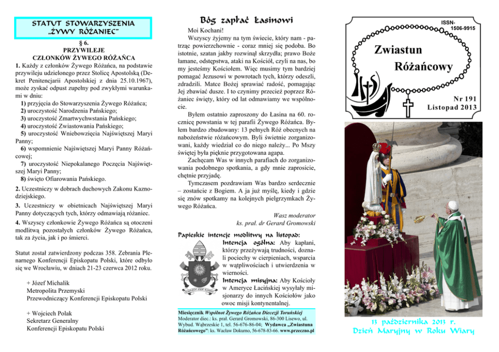 FG4GHG FGBJ4EMLFM8A<4 •zLJL Exz4A<86ù § 6. PRZYWILEJE CZŁONKÓW ŻYWEGO RÓŻAŃCA 1. Każdy z członków Żywego Różańca, na podstawie przywileju udzielonego przez Stolicę Apostolską (Dekret Penitencjarii Apostolskiej z dnia 25.10.1967), może zyskać odpust zupełny pod zwykłymi warunkami w dniu: 1) przyjęcia do Stowarzyszenia Żywego Różańca; 2) uroczystość Narodzenia Pańskiego; 3) uroczystość Zmartwychwstania Pańskiego; 4) uroczystość Zwiastowania Pańskiego; 5) uroczystość Wniebowzięcia Najświętszej Maryi Panny; 6) wspomnienie Najświętszej Maryi Panny Różańcowej; 7) uroczystość Niepokalanego Poczęcia Najświętszej Maryi Panny; 8) święto Ofiarowania Pańskiego. 2. Uczestniczy w dobrach duchowych Zakonu Kaznodziejskiego. 3. Uczestniczy w obietnicach Najświętszej Maryi Panny dotyczących tych, którzy odmawiają różaniec. 4. Wszyscy członkowie Żywego Różańca są otoczeni modlitwą pozostałych członków Żywego Różańca, tak za życia, jak i po śmierci. Statut został zatwierdzony podczas 358. Zebrania Plenarnego Konferencji Episkopatu Polski, które odbyło się we Wrocławiu, w dniach 21-23 czerwca 2012 roku. + Józef Michalik Metropolita Przemyski Przewodniczący Konferencji Episkopatu Polski + Wojciech Polak Sekretarz Generalny Konferencji Episkopatu Polski 5ÇZ mTcÄT} vTf\abj\ Moi Kochani! Wszyscy żyjemy na tym świecie, który nam - patrząc powierzchownie - coraz mniej się podoba. Bo istotnie, szatan jakby rozwinął skrzydła; prawo Boże łamane, odstępstwa, ataki na Kościół, czyli na nas, bo my jesteśmy Kościołem. Więc musimy tym bardziej pomagać Jezusowi w powrotach tych, którzy odeszli, zdradzili. Matce Bożej sprawiać radość, pomagając Jej zbawiać dusze. I to czynimy przecież poprzez Różaniec święty, który od lat odmawiamy we wspólnocie. Byłem ostatnio zaproszony do Łasina na 60. rocznicę powstania w tej parafii Żywego Różańca. Byłem bardzo zbudowany: 13 pełnych Róż obecnych na nabożeństwie różańcowym. Byli świetnie zorganizowani, każdy wiedział co do niego należy... Po Mszy świętej była pięknie przygotowana agapa. Zachęcam Was w innych parafiach do zorganizowania podobnego spotkania, a gdy mnie zaprosicie, chętnie przyjadę. Tymczasem pozdrawiam Was bardzo serdecznie – zostańcie z Bogiem. A ja już myślę, kiedy i gdzie się znów spotkamy na kolejnych pielgrzymkach Żywego Różańca. Wasz moderator ks. prał. dr Gerard Gromowski CTc\Xf^\X \agXaV]X `bW_\gjl aT _\fgbcTW<agXaV]T bZÇ_aT- Aby kapłani, którzy przeżywają trudności, doznali pociechy w cierpieniach, wsparcia w wątpliwościach i utwierdzenia w wierności. <agXaV]T `\fl]aT- Aby Kościoły w Ameryce Łacińskiej wysyłały misjonarzy do innych Kościołów jako owoc misji kontynentalnej. Miesięcznik Wspólnot Żywego Różańca Diecezji Toruńskiej Moderator diec.: ks. prał. Gerard Gromowski, 86-300 Lisewo, ul. Wybud. Wąbrzeskie 1, tel. 56-676-86-04; Wydawca „Zwiastuna Różańcowego”: ks. Wacław Dokurno, 56-678-83-66. www.przeczno.pl $& cTÖWm\Xea\^T %#$& e! 7m\XÅ @Tel]al j Eb^h J\Tel