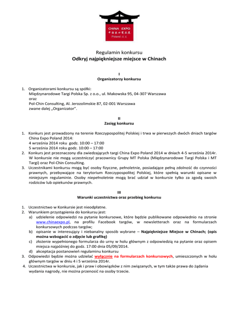 Regulamin konkursu Odkryj najpiękniejsze miejsce w Chinach I Organizatorzy konkursu 1. Organizatorami konkursu są spółki: Międzynarodowe Targi Polska Sp. z o.o., ul. Makowska 95, 04-307 Warszawa oraz Pol-Chin Consulting, Al. Jerozolimskie 87, 02-001 Warszawa zwane dalej „Organizator”. II Zasięg konkursu 1. Konkurs jest prowadzony na terenie Rzeczypospolitej Polskiej i trwa w pierwszych dwóch dniach targów China Expo Poland 2014: 4 września 2014 roku godz. 10:00 – 17:00 5 września 2014 roku godz. 10:00 – 17:00 2. Konkurs jest przeznaczony dla zwiedzających targi China Expo Poland 2014 w dniach 4-5 września 2014r. W konkursie nie mogą uczestniczyć pracownicy Grupy MT Polska (Międzynarodowe Targi Polska i MT Targi) oraz Pol-Chin Consulting. 3. Uczestnikami konkursu mogą być osoby fizyczne, pełnoletnie, posiadające pełną zdolność do czynności prawnych, przebywające na terytorium Rzeczypospolitej Polskiej, które spełnią warunki opisane w niniejszym regulaminie. Osoby niepełnoletnie mogą brać udział w konkursie tylko za zgodą swoich rodziców lub opiekunów prawnych. III Warunki uczestnictwa oraz przebieg konkursu 1. Uczestnictwo w Konkursie jest nieodpłatne. 2. Warunkiem przystąpienia do konkursu jest: a) udzielenie odpowiedzi na pytanie konkursowe, które będzie publikowane odpowiednio na stronie www.chinaexpo.pl, na profilu Facebook targów, w newsletterach oraz na formularzach konkursowych podczas targów; b) opisanie w interesujący i niebanalny sposób wybrane – Najpiękniejsze Miejsce w Chinach; (opis można wzbogacić o zdjęcie lub grafikę) c) złożenie wypełnionego formularza do urny w holu głównym z odpowiedzią na pytanie oraz opisem miejsca najpóźniej do godz. 17:00 dnia 05/09/2014. d) akceptacja postanowień regulaminu konkursu 3. Odpowiedzi będzie można udzielać wyłącznie na formularzach konkursowych, umieszczonych w holu głównym targów w dniu 4 i 5 września 2014r. 4. Uczestnictwa w konkursie, jak i praw i obowiązków z nim związanych, w tym także prawa do żądania wydania nagrody, nie można przenosić na osoby trzecie. IV Jury konkursu 1. Spośród złożonych formularzy konkursowych jury, składające się z pracowników organizatora konkursu (Międzynarodowe Targi Polska sp. z o.o., Pol-Chin Consulting) dokona weryfikacji poprawnych odpowiedzi, oceny treści opisu najpiękniejszego miejsca w Chinach oraz przyzna nagrody. 2. Organizatorzy zastrzegają sobie prawo zmiany składu jury. 3. Decyzja jury jest ostateczna i niepodważalna. V Kryterium oceny 1. Ocena zgłoszeń konkursowych będzie odbywała się wg następujących kryteriów: - poprawna odpowiedź na pytanie konkursowe - interesujący i niebanalny opis najpiękniejszego miejsca w Chinach, zachęcający do odwiedzenia - złożenie formularza konkursowego do godz. 17:00 dnia 05/09/2014 VI Nagrody 1. Miejsce pierwsze (1 nagroda): 1 bilet lotniczy PLL LOT Warszawa – Pekin – Warszawa, ufundowany przez linie lotnicze PLL LOT oraz zestaw gadżetów PLL LOT. Warunki biletu: - 1 bilet na trasie Warszawa – Pekin – Warszawa w klasie ekonomicznej - bilet całkowicie bezpłatny - okres ważności biletu do 04/09/2015 - bilet nie może zostać przekazany osobie trzeciej - bilet jest bezzwrotny, bez możliwości zmian - bilet do wykorzystania po wcześniejszym potwierdzeniu dostępności miejsc W sprawie dokonania rezerwacji należy skontaktować się z Panią Dorotą Hadler z PLL LOT tel. 22 6066181 Zapłacenie podatku leży po stronie Organizatora. 2. Miejsce drugie (2 nagrody): Kurs języka chińskiego - dla początkujących (1 semestr) – ufundowany przez Chińską Szkołę w Warszawie oraz chiński upominek. Realizacja kursu do 30.06.2015 3. Miejsce trzecie (3 nagrody): Voucher o wartości 100zł do restauracachi China Town (w 4-ech lokalizacjach) oraz chiński upominek. Realizacja voucheru w ciągu roku od zakończenia targów. 4. Nagrody nie podlegają wymianie na jakikolwiek ekwiwalent. 5. Warunkiem otrzymania nagrody jest obecność w Centrum Targowo-Kongresowym MT Polska, ul. Marsa 56c w Warszawie podczas ogłoszenia wyników konkursu na scenie targowej dnia 6/09/2014 o godz. 12:00. W przypadku nieobecności zwycięzcy, nagroda nie zostanie przyznana. 6. Jury zastrzega sobie prawo do nieprzyznania nagrody w zależności od poziomu zebranych zgłoszeń. VII Ogłoszenie wyników 1. Ogłoszenie wyników konkursu nastąpi na scenie targowej dnia 6 września 2014 o godzinie 12.00. 2. Organizator zastrzega sobie prawo do publikowania informacji o zwycięzcach na stronie internetowej www.chinaexpo.pl, na profilu China Expo Poland na portalu Facebook oraz w innych publikacjach Organizatora, na co uczestnicy przystępujący do konkursu wyrażają zgodę. VIII Zgoda na przetwarzanie danych 1. Akceptacja regulaminu jest równocześnie zgodą na przesyłanie przez Międzynarodowe Targi Polska sp. z o.o. oraz China Town Travel s.c. informacji handlowych oraz przetwarzanie danych osobowych w celach marketingowych zgodnie z przepisami ustawy z dnia 29 sierpnia 1997 roku o ochronie danych osobowych (Dz. U. z 1997r., Nr 133, poz. 883 ze zm.). Podanie danych jest dobrowolne. Uczestnikowi przysługuje prawo do wglądu w udostępnione dane oraz zgłoszenie sprzeciwu co do ich przetwarzania. IX Postanowienia końcowe 1. Organizator zastrzega sobie możliwość zmiany w regulaminie. 2. Organizator zastrzega sobie prawo do dyskwalifikacji Uczestnika z Konkursu oraz do pozbawienia go prawa do nagrody w przypadku nieprzestrzegania przez niego postanowień regulaminu konkursu oraz obowiązujących przepisów prawa. 3. Organizator zastrzega sobie prawo do zmiany Regulaminu Konkursu lub zakończenia Konkursu w dowolnym momencie bez konieczności podawania przyczyny i odrębnego powiadamiania Uczestników. Zmieniony Regulamin zostanie zamieszczony na profilu oraz na stronie www.chinaexpo.pl . Organizatorzy: