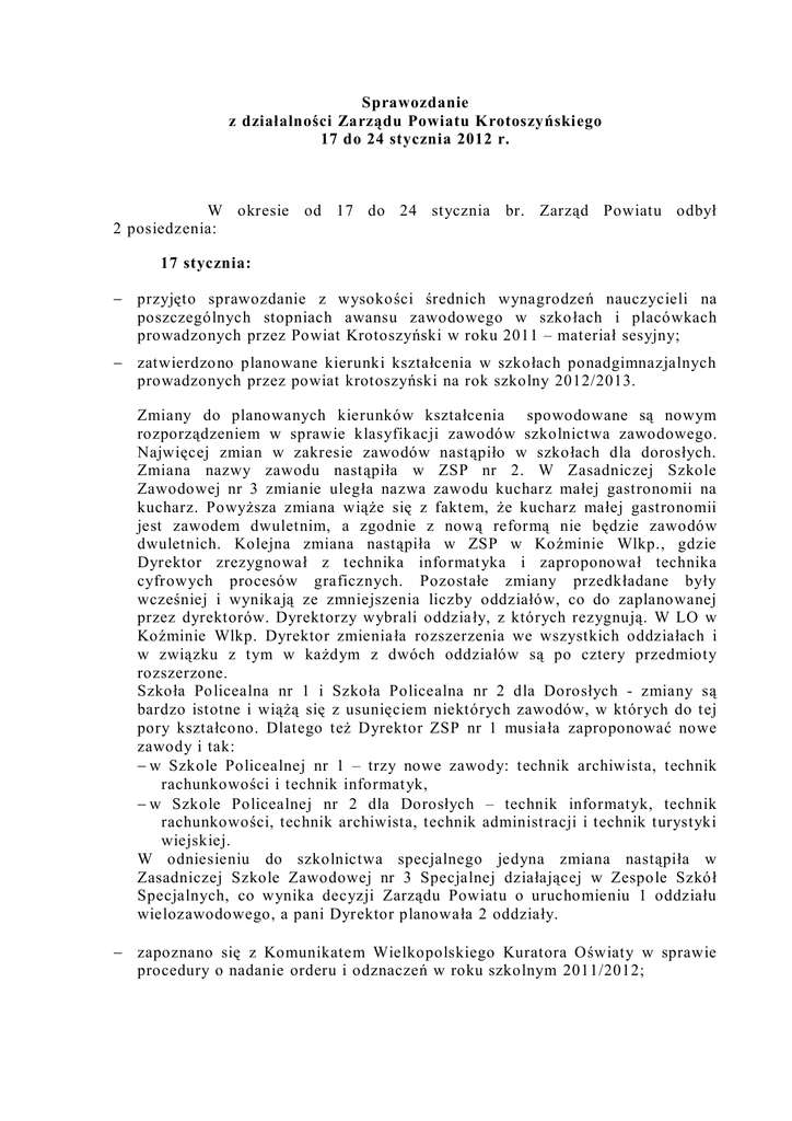 Sprawozdanie z działalności Zarządu Powiatu Krotoszyńskiego 17 do 24 stycznia 2012 r. W okresie od 17 do 24 stycznia br. Zarząd Powiatu odbył 2 posiedzenia: 17 stycznia: − przyjęto sprawozdanie z wysokości średnich wynagrodzeń nauczycieli na poszczególnych stopniach awansu zawodowego w szko łach i placówkach prowadzonych przez Powiat Krotoszyński w roku 2011 – materiał sesyjny; − zatwierdzono planowane kierunki kształcenia w szkołach ponadgimnazjalnych prowadzonych przez powiat krotoszyński na rok szkolny 2012/2013. Zmiany do planowanych kierunków kształcenia spowodowane są nowym rozporządzeniem w sprawie klasyfikacji zawodów szkolnictwa zawodowego. Najwięcej zmian w zakresie zawodów nastąpiło w szkołach dla dorosłych. Zmiana nazwy zawodu nastąpiła w ZSP nr 2. W Zasadniczej Szkole Zawodowej nr 3 zmianie uległa nazwa zawodu kucharz małej gastronomii na kucharz. Powyższa zmiana wiąże się z faktem, że kucharz małej gastronomii jest zawodem dwuletnim, a zgodnie z nową reformą nie będzie zawodów dwuletnich. Kolejna zmiana nastąpiła w ZSP w Koźminie Wlkp., gdzie Dyrektor zrezygnował z technika informat yka i zaproponował technika cyfrowych procesów graficznych. Pozostałe zmiany przedkładane były wcześniej i wynikają ze zmniejszenia liczby oddziałów, co do zaplanowanej przez dyrektorów. Dyrektorzy wybrali oddzia ły, z których rezygnują. W LO w Koźminie Wlkp. Dyrektor zmienia ła rozszerzenia we wszystkich oddziałach i w związku z tym w każdym z dwóch oddziałów są po cztery przedmioty rozszerzone. Szkoła Policealna nr 1 i Szkoła Policealna nr 2 dla Dorosłych - zmiany są bardzo istotne i wiążą się z usunięciem niektórych zawodów, w których do tej pory kształcono. Dlatego też Dyrektor ZSP nr 1 musiała zaproponować nowe zawody i tak: − w Szkole Policealnej nr 1 – trzy nowe zawody: technik archiwista, technik rachunkowości i technik informat yk, − w Szkole Policealnej nr 2 dla Dorosłych – technik informatyk, technik rachunkowości, technik archiwista, technik administracji i technik turystyki wiejskiej. W odniesieniu do szkolnictwa specjalnego jedyna zmiana nastąpiła w Zasadniczej Szkole Zawodowej nr 3 Specjalnej działającej w Zespole Szkół Specjalnych, co wynika decyzji Zarządu Powiatu o uruchomieniu 1 oddziału wielozawodowego, a pani Dyrektor planowała 2 oddziały. − zapoznano się z Komunikatem Wielkopolskiego Kuratora Oświaty w sprawie procedury o nadanie orderu i odznaczeń w roku szkolnym 2011/2012; 2 − zatwierdzono aneks nr 10 do arkusza organizacji SOSW w Konarzewie, który wiąże się z: - z powrotem z dniem 11.01.2012 r. z długotrwałego zwolnienia lekarskiego pracownika zatrudnionego jako pomoc nauczyciela (½ etatu) i praczka (½ etatu) i rozwiązaniem umowy zawartej z osobą na czas nieobecności ww. pracownika na ½ etatu po mocy nauczyciela; - ujęciem 1 godziny tygodniowo zajęć wczesnego wspomagania rozwoju dziecka i zmianą przydziału godzin nauczycielki. − zatwierdzono aneks nr 7 do arkusza organizacji ZSP nr 2, który dot yczy powrotu z dniem 26 stycznia 2012 r. do pracy po uzupełniającym urlopie wypoczynkowym nauczycielki języka niemieckiego. W związku z powyższym ulegną zmianie przydziały godzin u nauczycieli zastępujących ww. nauczycielkę. − zatwierdzono aneks nr 10 do arkusza organizacji ZSS w Krotoszynie, który wiąże się z powrotem z dniem 23 stycznia 2012 r. z długotrwałego zwolnienia lekarskiego nauczycielki. W związku z powyższym nastąpi zmiana przydziału godzin nauczycieli, zastępujących nauczycielkę. Jednocześnie przydzielono godziny nauczycielce, któr wcześniej pomniejszo no ze względu na przekroczenie wysokości etatu (do 1,56 etatu). − zapoznano się z wynikami kontroli doraźnej przeprowadzonej w dniach 28-29 grudnia 2011 r. w DPS w Baszkowie, której przedmiotem było zapewnienie leków mieszkańcom. W toku czynności kontrolnych nie stwierdzono żadnych śladów niewłaściwego działania przy zapewnieniu leków. Jedyną nieprawidłowością, którą stwierdzono w zakresie gospodarowania lekami, dotyczy leków po osobach zmarłych. Nie na wszystkich oddziałach dokonywano spisu leków po zmarłych. W procedurach wewnętrznych nie został określony sposób postępowania z lekami po zmarłych oraz nie określono pracowników odpowiedzialnych za niniejszy proces. Powyższą uwagę zawarto w wystąpieniu pokontrolnym. − podjęto uchwałę w sprawie rozstrzygnięcia otwartego konkursu ofert na realizację zadań publicznych przez organizacje pozarządowe oraz podmiot y wymienione w art. 3 ust. 3 ustawy o działalności pożytku publicznego i o wo lontariacie na rok 2012 r. − wyrażono zgodę Dyrektorowi ZSP nr 3 na likwidację składnika majątku ruchomego: - kserografu „Canon” o wartości początkowej 2.750 zł, - ksero o wartości początkowej 3.100 zł - kamery Panasonic wartości początkowej 1.718,05 zł, - komputera o wartości początkowej 2.285 zł. Komisja likwidacyjna po zbadaniu ww. przedmiotów oceniła, że sprzęt jest stary, a dzisiejsza wartość rynkowa jest znikoma, jest zniszczony i koszty naprawy przekraczają wartość zakupu, dla wielu urządzeń tego typu nie ma części zapasowych. 3 − przyznano 4% podwyżki wynagrodzeń dla kierowników i dyrektorów jednostek organizacyjnych (Dyrektor PCPR, Kierownik ŚDS, Dyrektor PZD). Podwyżką nie objęto Dyrektora DPS w Baszkowie, bowiem otrzymuje ju ż maksymalne miesięczne wynagrodzenie ustalone Zarządzeniem Starosty Krotoszyńskiego. − wyrażono zgodę na przekazanie całej kwoty dotacji dla SPZOZ w Krotoszynie. W budżecie na 2012 r. ujęte są środki w wysokości 547.498 zł jako dotacja powiatu dla SPZOZ na następujące zadania: − sfinansowanie budowy parkingu przy budynku szpit ala przy ul. Mickiewicza w Krotoszynie, − do finansowanie budowy windy w budynku Zakładu OpiekuńczoLeczniczego w Krotoszynie, − sfinansowanie wkładu
