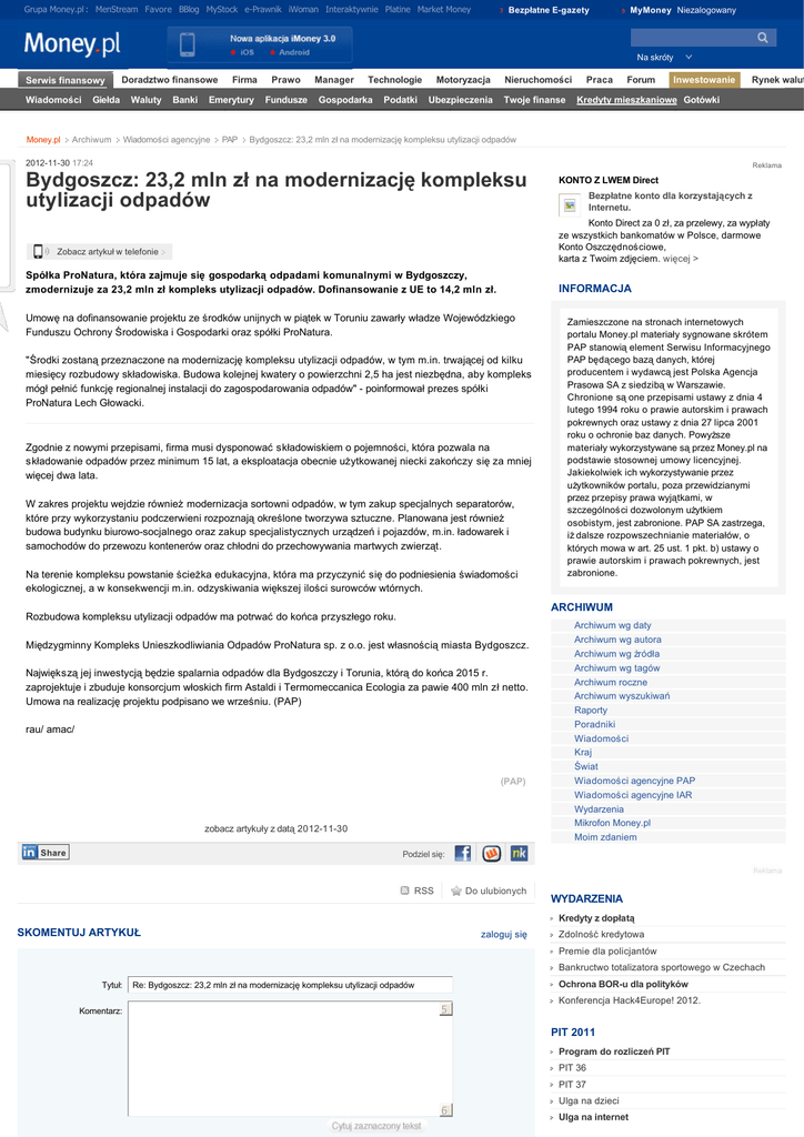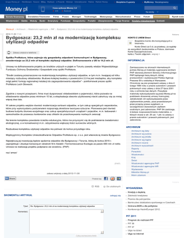 Grupa Money.pl : MenStream Favore BBlog MyStock e-Prawnik iWoman Interaktywnie Platine Market Money Bezpłatne E-gazety MyMoney Niezalogowany Na skróty Serwis finansowy Wiadomości Money.pl Doradztwo finansowe Giełda Archiwum Waluty Banki Firma Emerytury Wiadomości agencyjne PAP Prawo Fundusze Manager Technologie Gospodarka Podatki Motoryzacja Ubezpieczenia Nieruchomości Twoje finanse Praca Forum Inwestowanie Rynek walut Kredyty mieszkaniowe Gotówki Bydgoszcz: 23,2 mln zł na modernizację kompleksu utylizacji odpadów 2012-11-30 17:24 Reklama Bydgoszcz: 23,2 mln zł na modernizację kompleksu utylizacji odpadów Bezpłatne konto dla korzystających z Internetu. Konto Direct za 0 zł, za przelewy, za wypłaty ze wszystkich bankomatów w Polsce, darmowe Konto Oszczędnościowe, karta z Twoim zdjęciem. więcej > Zobacz artykuł w telefonie Spółka ProNatura, która zajmuje się gospodarką odpadami komunalnymi w Bydgoszczy, zmodernizuje za 23,2 mln zł kompleks utylizacji odpadów. Dofinansowanie z UE to 14,2 mln zł. INFORMACJA Umowę na dofinansowanie projektu ze środków unijnych w piątek w Toruniu zawarły władze Wojewódzkiego Funduszu Ochrony Środowiska i Gospodarki oraz spółki ProNatura. "Środki zostaną przeznaczone na modernizację kompleksu utylizacji odpadów, w tym m.in. trwającej od kilku miesięcy rozbudowy składowiska. Budowa kolejnej kwatery o powierzchni 2,5 ha jest niezbędna, aby kompleks mógł pełnić funkcję regionalnej instalacji do zagospodarowania odpadów" - poinformował prezes spółki ProNatura Lech Głowacki. Zgodnie z nowymi przepisami, firma musi dysponować składowiskiem o pojemności, która pozwala na składowanie odpadów przez minimum 15 lat, a eksploatacja obecnie użytkowanej niecki zakończy się za mniej więcej dwa lata. W zakres projektu wejdzie również modernizacja sortowni odpadów, w tym zakup specjalnych separatorów, które przy wykorzystaniu podczerwieni rozpoznają określone tworzywa sztuczne. Planowana jest również budowa budynku biurowo-socjalnego oraz zakup specjalistycznych urządzeń i pojazdów, m.in. ładowarek i samochodów do przewozu kontenerów oraz chłodni do przechowywania martwych zwierząt. Na terenie kompleksu powstanie ścieżka edukacyjna, która ma przyczynić się do podniesienia świadomości ekologicznej, a w konsekwencji m.in. odzyskiwania większej ilości surowców wtórnych. Zamieszczone na stronach internetowych portalu Money.pl materiały sygnowane skrótem PAP stanowią element Serwisu Informacyjnego PAP będącego bazą danych, której producentem i wydawcą jest Polska Agencja Prasowa SA z siedzibą w Warszawie. Chronione są one przepisami ustawy z dnia 4 lutego 1994 roku o prawie autorskim i prawach pokrewnych oraz ustawy z dnia 27 lipca 2001 roku o ochronie baz danych. Powyższe materiały wykorzystywane są przez Money.pl na podstawie stosownej umowy licencyjnej. Jakiekolwiek ich wykorzystywanie przez użytkowników portalu, poza przewidzianymi przez przepisy prawa wyjątkami, w szczególności dozwolonym użytkiem osobistym, jest zabronione. PAP SA zastrzega, iż dalsze rozpowszechnianie materiałów, o których mowa w art. 25 ust. 1 pkt. b) ustawy o prawie autorskim i prawach pokrewnych, jest zabronione. ARCHIWUM Rozbudowa kompleksu utylizacji odpadów ma potrwać do końca przyszłego roku. Archiwum wg daty Międzygminny Kompleks Unieszkodliwiania Odpadów ProNatura sp. z o.o. jest własnością miasta Bydgoszcz. Największą jej inwestycją będzie spalarnia odpadów dla Bydgoszczy i Torunia, którą do końca 2015 r. zaprojektuje i zbuduje konsorcjum włoskich firm Astaldi i Termomeccanica Ecologia za pawie 400 mln zł netto. Umowa na realizację projektu podpisano we wrześniu. (PAP) rau/ amac/ (PAP) Archiwum wg autora Archiwum wg źródła Archiwum wg tagów Archiwum roczne Archiwum wyszukiwań Raporty Poradniki Wiadomości Kraj Świat Wiadomości agencyjne PAP Wiadomości agencyjne IAR Wydarzenia Mikrofon Money.pl Moim zdaniem zobacz artykuły z datą 2012-11-30 Share KONTO Z LWEM Direct Podziel się: RSS Do ulubionych WYDARZENIA Kredyty z dopłatą SKOMENTUJ ARTYKUŁ zaloguj się Zdolność kredytowa Premie dla policjantów Bankructwo totalizatora sportowego w Czechach Tytuł: Komentarz: Ochrona BOR-u dla polityków Re: Bydgoszcz: 23,2 mln zł na modernizację kompleksu utylizacji odpadów 5 Konferencja Hack4Europe! 2012. PIT 2011 Program do rozliczeń PIT PIT 36 PIT 37 6 Ulga na dzieci Ulga na internet Autor: E-mail: Wyślij b Poinformuj mnie mailem o pierwszej odpowiedzi. c d e f g zaloguj się > (c) 2012 Money.pl Sp. z o.o. Na skróty O nas Centrum prasowe Reklama Mapa serwisu Regulamin Praca w Money.pl Portal finansowy Produkty finansowe Serwis dla firm Nieruchomości Motoryzacja Kalkulatory Prawo Praca Kontakt Pomoc Dla webmasterów iMoney w Twoim iPhonie Wersja dla komórek RSS Akademia Money.pl Monetized by Pogoda GPW Kurs Euro Kurs Dolara Rejestr Firm Raporty Wydarzenia