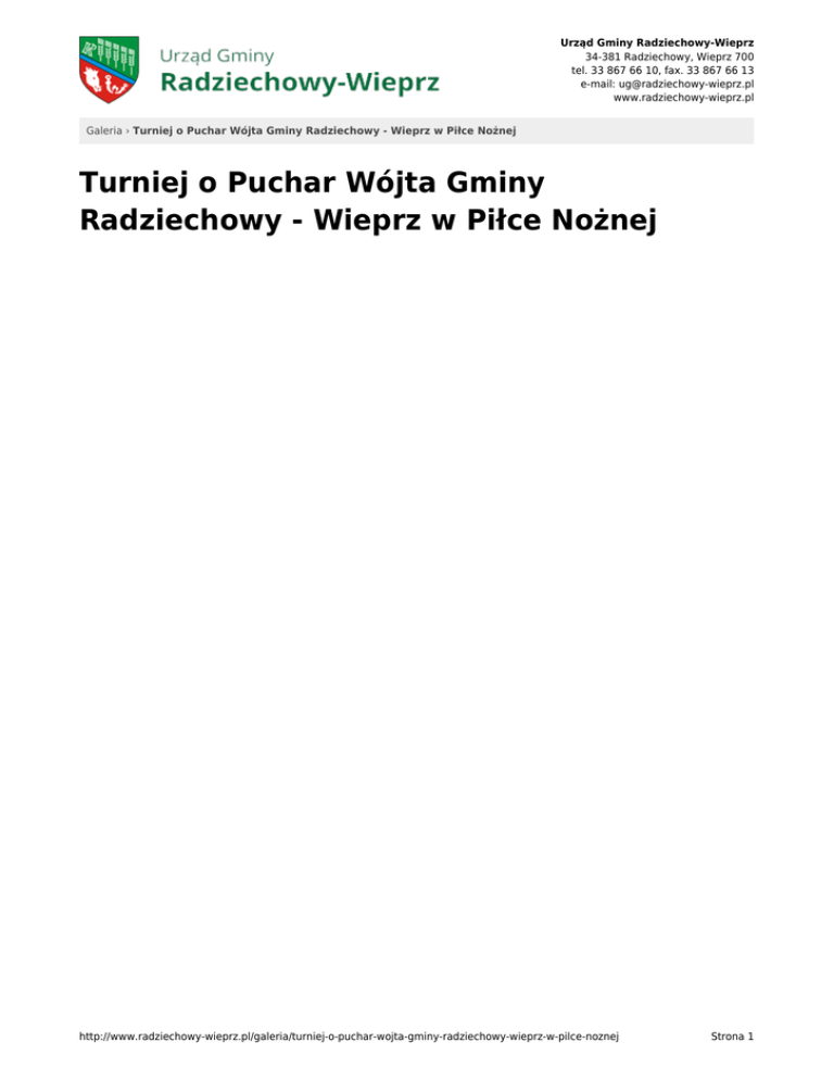 Urząd Gminy Radziechowy-Wieprz 34-381 Radziechowy, Wieprz 700 tel. 33 867 66 10, fax. 33 867 66 13 e-mail: [email protected] www.radziechowy-wieprz.pl Galeria › Turniej o Puchar Wójta Gminy Radziechowy - Wieprz w Piłce Nożnej Turniej o Puchar Wójta Gminy Radziechowy - Wieprz w Piłce Nożnej http://www.radziechowy-wieprz.pl/galeria/turniej-o-puchar-wojta-gminy-radziechowy-wieprz-w-pilce-noznej Strona 1