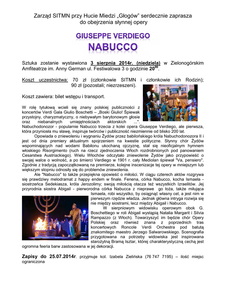Zarząd SITMN przy Hucie Miedzi „Głogów” serdecznie zaprasza do obejrzenia słynnej opery Sztuka zostanie wystawiona 3 sierpnia 2014r. (niedziela) w Zielonogórskim Amfiteatrze im. Anny German ul. Festiwalowa 3 o godzinie 2000. Koszt uczestnictwa: 70 zł (członkowie SITMN i członkowie ich Rodzin); 90 zł (pozostali; niezrzeszeni). Koszt zawiera: bilet wstępu i transport. W rolę tytułową wcieli się znany polskiej publiczności z koncertów Verdi Gala Giulio Boschetti – „Boski Giulio! Śpiewak przystojny, charyzmatyczny, o niebywałym barytonowym głosie oraz niebanalnych umiejętnościach aktorskich ...". Nabuchodonozor - popularnie Nabucco trzecia z kolei opera Giuseppe Verdiego, ale pierwsza, która przyniosła mu sławę, inspiruje twórców i publiczność niezmiennie od blisko 200 lat. Opowiada o zniewoleniu i wygnaniu Żydów przez babilońskiego króla Nabuchodonozora II i jest od dnia premiery aktualnym spojrzeniem na kwestie polityczne. Słynny chór Żydów wspominających nad wodami Babilonu ukochaną ojczyznę, stał się nieoficjalnym hymnem włoskiego Risorgimento (ruch na rzecz zjednoczenia Włoch rozdrobnionych pod panowaniem Cesarstwa Austriackiego). Wielu Włochów odczytało zniewolenie Żydów jako przypowieść o swojej walce o wolność, a po śmierci Verdiego w 1901 r. cały Mediolan śpiewał "Va, pensiero". Zgodnie z tradycją zapoczątkowaną na premierze, kolejne inscenizacje tej opery w mniejszym lub większym stopniu odnosiły się do problemów zniewolenia. Ale "Nabucco" to także przepiękna opowieść o miłości. W ciągu czterech aktów rozgrywa się prawdziwy melodramat z happy endem w finale. Fenena, córka Nabucco, kocha Ismaela siostrzeńca Sedekiasza, króla Jerozolimy; swoją miłością otacza też wszystkich Izraelitów. Jej przyrodnia siostra Abigail - pierworodna córka Nabucca z nieprawe go łoża, także miłująca Ismaela, robi wszystko, by osiągnąć własny cel, a jest nim w pierwszym rzędzie władza. Jednak główna intryga rozwija się nie między siostrami, lecz między Abigail i Nabucco. W sierpniowym widowisku operowym obok G. Boschettiego w roli Abigail wystąpią Natalia Margarit i Silvia Rampazzo (z Włoch). Towarzyszyć im będzie chór Opery Polskiej oraz również znana z poprzednich tras koncertowych Roncole Verdi Orchestra pod batutą znakomitego maestro Jerzego Salwarowskiego. Scenografia przygotowana na potrzeby widowiska jest inspirowana starożytną Bramą Isztar, której charakterystyczną cechą jest ogromna feeria barw zastosowana w jej dekoracji. Zapisy do 25.07.2014r. przyjmuje kol. Izabela Zielińska (76 747 7195) – ilość miejsc ograniczona
