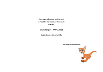 Plan nauczania języka angielskiego w Pijarskim Przedszkolu w Warszawie 2016/2017 Grupa Kangury | KANGAROOS English Teacher: Diana Kozińska Play, learn and grow together! PAŹDZIERNIK | OCTOBER Tydzień | Week - pytania: What colour is the [sky/ sun/ tree]?, What colour are the apples?, Where’s the sun? What colour is it?, Is it [red]? 1 - 2 - 3 Kojarzenie, werbalne i niewerbalne reagowanie | Pairing, verbal and non-verbal reac ons Colours! Słownictwo | Vocabulary zdania Come on everyone, it’s story me fun, Kenny is in the sun, What a lovely/ beau ful day, Let’s go for a walk, Miaow, says Kenny and climbs up the tree; polecenie Look at the beau ful [yellow sun/ blue sky/ green tree/ red apples]; - zwrot an apple for [Billy] - zdanie Kenny wants an apple; - zwrot A [green] apple for you. - pytanie What’s your favourite - - rozpoznawanie kolorów: dzieci wrzucają woreczki lub miękkie piłki w kolorowe okręgi na podłodze, zgodnie z nazwanym przez nauczyciela kolorem; ćwiczenie pamięci: nazywanie koloru, którego brakuje w sekwencji (podczas gdy dzieci zamykają oczy, nauczyciel chowa jeden z obrazków – flashcards); - zgadywanie: dzieci próbują odgadnąć, który z odwróconych obrazków przedstawia słońce (reagowanie na pytanie Where’s the sun?) - reagowanie na pytanie Is it [blue]? potakiwaniem lub potrząsaniem głowy; - wskazywanie przedmiotów o kolorze nazwanym przez nauczyciela; - śledzenie prostej opowiastki, kojarzenie ilustracji z odpowiednimi częściami opowiastki; rozpoznawanie kolorów: nauczyciel nazywa kolor, a dzieci, które mają na sobie ubranie w tym kolorze, siadają na podłodze; - Piosenki i rymowanki | Songs & Rhymes Mówienie | Speaking - nazywanie kolorów (odpowiadanie na pytania What colour is the [sky]?, What colour are the apples?) - piosenka (Two pre y colours!) - - - słuchanie opowiastki z poprzedniej lekcji i układanie ilustracji we właściwej kolejności; rozpoznawanie kolorów: dzieci trzymają w rękach papierowe jabłka w trzech kolorach (żółte, zielone - - piosenka na pożegnanie (Byebye!) dopowiadanie fragmentów - piosenka (Two pre y opowiastki colours!) - - piosenka na powitanie (Hello!); piosenka-zaproszenie do kółeczka (Make a circle!) A [red] apple for you – oferowanie kotu Kenny’emu narysowanych jabłek piosenka na powitanie (Hello!); piosenka-zaproszenie do kółeczka (Make a circle!) piosenka na pożegnanie (Byebye!) - piosenka (Hello yellow! Two pre y colours!) - piosenka na powitanie i czerwone); nauczyciel mówi [Yellow] is for the apples on the tree, a dzieci trzymające jabłko w danym kolorze podnoszą je do góry; colour?; - 4 - części ciała: hands, feet; rzeczownik mouse; przymiotniki: li le, funny; powitanie Welcome; - zdania: Li le mouse is very sweet, This is a mouse. - 5 wykrzyknik Hooray for [blue]! - polecenie Show me your li le hands/ feet; pytanie Hands or feet?; - rzeczownik mice - wybiórcze wykonywanie poleceń: dzieci podzielone są na 4 grupy, z których każda ma przydzielony kolor oraz czynność przypisaną do tego koloru (np. podskakiwanie, tupanie itp.); nauczyciel wymienia nazwę koloru, a dzieci z danej grupy wykonują odpowiednią czynność - szukanie pary: dzieci otrzymują po jednym pasku kolorowej bibuły; kiedy przestaje grać muzyka, ich zadaniem jest znaleźć kolegę/ koleżankę z paskiem bibuły w tym samym kolorze; - ćwiczenie pamięci: dzieci próbują zapamiętać sekwencję obrazków (flashcards) Li le mouse! - kojarzenie rzeczowników hands, feet z odpowiednimi częściami ciała; - rysowanie: odrysowanie własnych dłoni i stóp na papierze, kolorowanie - - reagowanie na polecenie Show me your li le hands/ feet; zgadywanka: nauczyciel trzyma za plecami obrazek przedstawiający dłonie lub stopy i zadaje pytanie Hands or feet?, a dzieci próbują odgadnąć, co jest na obrazku (flashcards); dopasowanie obrazków przedstawiających łapki do „portretów” Kenny’ego i Mackey’ego - - powitanie myszki Mackey’ego: Welcome, Mackey Mouse! - piosenka na pożegnanie (Byebye!) - piosenka (Li le mouse!) - piosenka na powitanie (Hello!); piosenka-zaproszenie do kółeczka (Make a circle!) - - nazywanie części ciała: hands, feet (Hello!); piosenka-zaproszenie do kółeczka (Make a circle!) - piosenka na pożegnanie (Byebye!) - piosenka (Li le mouse!) - piosenka na powitanie (Hello!); piosenka-zaproszenie do kółeczka (Make a circle!) - piosenka na pożegnanie (Byebye!)