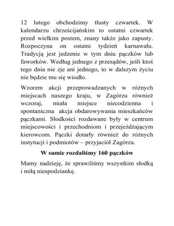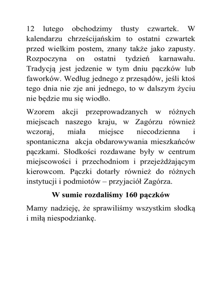 12 lutego obchodzimy tłusty czwartek. W kalendarzu chrześcijańskim to ostatni czwartek przed wielkim postem, znany także jako zapusty. Rozpoczyna on ostatni tydzień karnawału. Tradycją jest jedzenie w tym dniu pączków lub faworków. Według jednego z przesądów, jeśli ktoś tego dnia nie zje ani jednego, to w dalszym życiu nie będzie mu się wiodło. Wzorem akcji przeprowadzanych w różnych miejscach naszego kraju, w Zagórzu również wczoraj, miała miejsce niecodzienna i spontaniczna akcja obdarowywania mieszkańców pączkami. Słodkości rozdawane były w centrum miejscowości i przechodniom i przejeżdżającym kierowcom. Pączki dotarły również do różnych instytucji i podmiotów – przyjaciół Zagórza. W sumie rozdaliśmy 160 pączków Mamy nadzieję, że sprawiliśmy wszystkim słodką i miłą niespodziankę.