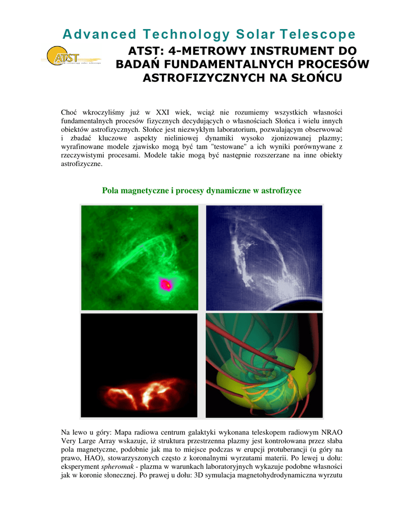Cho wkroczyli my ju w XXI wiek, wci nie rozumiemy wszystkich własno ci fundamentalnych procesów fizycznych decyduj cych o własno ciach Sło ca i wielu innych obiektów astrofizycznych. Sło ce jest niezwykłym laboratorium, pozwalaj cym obserwowa i zbada kluczowe aspekty nieliniowej dynamiki wysoko zjonizowanej plazmy; wyrafinowane modele zjawisko mog by tam "testowane" a ich wyniki porównywane z rzeczywistymi procesami. Modele takie mog by nast pnie rozszerzane na inne obiekty astrofizyczne. Pola magnetyczne i procesy dynamiczne w astrofizyce Na lewo u góry: Mapa radiowa centrum galaktyki wykonana teleskopem radiowym NRAO Very Large Array wskazuje, i struktura przestrzenna plazmy jest kontrolowana przez słaba pola magnetyczne, podobnie jak ma to miejsce podczas w erupcji protuberancji (u góry na prawo, HAO), stowarzyszonych cz sto z koronalnymi wyrzutami materii. Po lewej u dołu: eksperyment spheromak - plazma w warunkach laboratoryjnych wykazuje podobne własno ci jak w koronie słonecznej. Po prawej u dołu: 3D symulacja magnetohydrodynamiczna wyrzutu typu jet wywołanego przez pola magnetyczne skr cane w czarnej dziurze akreuj cej materi (M. Nakamura, Uchida Lab), ma on cechy podobne do zjawisk obserwowanych na Sło cu. W ostatniej dekadzie XX-go wieku nast pił gwałtowny rozwój bada Sło ca, doprowadzaj c je do fazy, gdy zaawansowane teorie i modele oczekuj na rozstrzygaj ce testy obserwacyjne. Niestety, współczesne instrumenty nie s w stanie sprosta temu wyzwaniu. Współczesne pokazy działaj cych systemów optyki adaptywnej, w poł czeniu z innymi nowoczesnymi, bardzo efektywnymi technikami instrumentalnymi, pozwalaj oczekiwa w najbli szych latach szybkiego wzrostu mo liwo ci obserwacji Sło ca. ATST w "pigułce" Teleskop ATST (Advanced Technology Solar Telescope czyli Zaawansowany Technologicznie Teleskop Słoneczny, instrument o 4-ro metrowej rednicy lustra głównego, b dzie miał ogromy wpływ na rozwój astronomii, fizyki plazmy oraz zwi zków ZiemiaSło ce poprzez zbadanie fundamentalnych procesów astrofizycznych zachodz cych w przestrzeni kosmicznej i na Sło cu. ATST pozwoli zbada kluczowe aspekty nieliniowych procesów dynamicznych zachodz cych w turbulentnej pla mie słonecznej. Oto wybrane podstawowe zagadnienia naukowe: • • • Jak s generowane i niszczone pola magnetyczne? Jak role odgrywaj kosmiczne pola magnetyczne w organizacji struktury plazmy oraz w impulsowym wydzielaniu energii, powszechnie obserwowanym we Wszech wiecie? Jakie mechanizmy s odpowiedzialne za zmiany aktywno ci słonecznej (wpływaj cej tak e na nasz Ziemi )? Sło ce daje nam wyj tkow mo liwo badania kosmicznych pól magnetycznych z nadzwyczajn przestrzenn i czasow zdolno ci rozdzielcz , pozwala nam testowa teorie na temat ich powstawania, struktury i dynamiki. Post p w dziedzinie obserwacji wymaga jednak teleskopu o nast puj cych cechach: • • • Przestrzenna zdolno rozdzielcza 0.1 sekundy łuku lub lepsza, aby mo liwe było zbadanie ci nieniowej skali wysoko ci oraz długo ci redniej drogi swobodnej fotonów. Du ego strumienia fotonów nawet przy najwi kszej przestrzennej zdolno ci rozdzielczej aby umo liwi precyzyjny pomiar pól magnetycznych oraz pr dko ci materii. Dost p do szerokiego zakresu widma E-M: 300 nm do 35 µm aden inny obecnie u ywany b d planowany teleskop, zarówno naziemny jak i kosmiczny, nie zapewnia takich mo liwo ci. Najnowsze osi gni cia w dziedzinie technologii i budowy instrumentów umo liwiaj realizacj teleskopu ATST przed ko cem dekady: • • • Działaj cy system optyki adaptywnej dla wiatła widzialnego Otwarte konstrukcja tubusa teleskopu, umo liwiaj ca uzyskiwanie obrazów o dyfrakcyjnie ograniczonej przestrzennej zdolno ci rozdzielczej Wielko-formatowe kamery wiatła podczerwonego Podstawowe parametry teleskopu ATST i ich znaczenie naukowe Czuło : 4-metrowa rednica lustra gromadz cego fotony • • • mo liwo badania bardzo słabych pól magnetycznych i testowania modeli dynama turbulentnego w górnej cz ci strefy konwektywnej mo liwo pomiaru oscylacji p tli/rur pola magnetycznego oraz testowanie modeli grzania chromosfery i korony mo liwo pomiaru pól magnetycznych w koronie Pole widzenia: 5 minut łuku • • • testowanie modeli wypływania strumieni magnetycznych formuj cych obszary aktywne z obszaru działania dynama w rejonie dolnej kraw dzi warstwy konwektywnej testowanie modeli wielko-skalowych, koherentnych procesów prowadz cych do powstawania rozbłysków słonecznych i koronalnych wyrzutów materii obserwacje wielko-skalowych oscylacji w protuberancjach i porównanie ich z modelami Zakres obserwowanego widma: od 300 nm to 35 µm • aden inny obecnie u ywany b d planowany teleskop, zarówno naziemny jak i kosmiczny, nie umo liwia obserwacji tak szerokiego zestawu linii widmowych i fragmentów widma przydatnych w diagnostyce własno ci atmosfery słonecznej od fotosfery do korony Przestrzenna zdolno • • okre lenie ci nieniowej skali wysoko ci oraz długo ci redniej drogi swobodnej fotonów w fotosferze zbadanie podczerwonych sygnatur chłodnych chmur w chromosferze i testowanie ich chłodzenia przez promieniowanie Dokładno • • rozdzielcza: >~ 0.1" (z optyk adaptywn ) pomiaru polaryzacji: 10-4 nat enia dokładny pomiar pełnego wektora pola magnetycznego oraz testowanie modeli generacji oscylacji w rurach magnetycznych przez otaczaj c granulacj testowanie model najsłabszych pól magnetycznych w fotosferze, chromosferze i w protuberancjach przy wykorzystaniu efektu Hanle'go wiatło rozproszone: <10% w plamach, 10-6 w podczerwieni • • testowanie modeli magneto-konwekcji w najciemniejszych cz ciach plam słonecznych pomiar własno ci koronalnych pól magnetycznych i testowanie modeli nagrzewu korony słonecznej Lokalizacja: • • najlepsze miejsce pod wzgl dem seeingu i długo ci czasu obserwacyjnego maksymalizacja osi gów i minimalizacja kosztu optyki adaptywnej Dlaczego heliofizycy potrzebuj teleskopy o du ych
