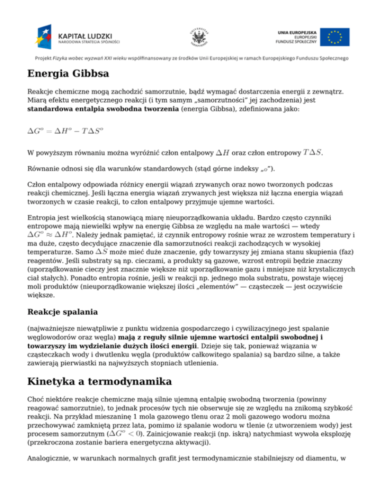 Energia Gibbsa Reakcje chemiczne mogą zachodzić samorzutnie, bądź wymagać dostarczenia energii z zewnątrz. Miarą efektu energetycznego reakcji (i tym samym „samorzutności” jej zachodzenia) jest standardowa entalpia swobodna tworzenia (energia Gibbsa), zdefiniowana jako: W powyższym równaniu można wyróżnić człon entalpowy oraz człon entropowy . Równanie odnosi się dla warunków standardowych (stąd górne indeksy „ ”). Człon entalpowy odpowiada różnicy energii wiązań zrywanych oraz nowo tworzonych podczas reakcji chemicznej. Jeśli łączna energia wiązań zrywanych jest większa niż łączna energia wiązań tworzonych w czasie reakcji, to człon entalpowy przyjmuje ujemne wartości. Entropia jest wielkością stanowiącą miarę nieuporządkowania układu. Bardzo często czynniki entropowe mają niewielki wpływ na energię Gibbsa ze względu na małe wartości — wtedy . Należy jednak pamiętać, iż czynnik entropowy rośnie wraz ze wzrostem temperatury i ma duże, często decydujące znaczenie dla samorzutności reakcji zachodzących w wysokiej temperaturze. Samo może mieć duże znaczenie, gdy towarzyszy jej zmiana stanu skupienia (faz) reagentów. Jeśli substraty są np. cieczami, a produkty są gazowe, wzrost entropii będzie znaczny (uporządkowanie cieczy jest znacznie większe niż uporządkowanie gazu i mniejsze niż krystalicznych ciał stałych). Ponadto entropia rośnie, jeśli w reakcji np. jednego mola substratu, powstaje więcej moli produktów (nieuporządkowanie większej ilości „elementów” — cząsteczek — jest oczywiście większe. Reakcje spalania (najważniejsze niewątpliwie z punktu widzenia gospodarczego i cywilizacyjnego jest spalanie węglowodorów oraz węgla) mają z reguły silnie ujemne wartości entalpii swobodnej i towarzyszy im wydzielanie dużych ilości energii. Dzieje się tak, ponieważ wiązania w cząsteczkach wody i dwutlenku węgla (produktów całkowitego spalania) są bardzo silne, a także zawierają pierwiastki na najwyższych stopniach utlenienia. Kinetyka a termodynamika Choć niektóre reakcje chemiczne mają silnie ujemną entalpię swobodną tworzenia (powinny reagować samorzutnie), to jednak procesów tych nie obserwuje się ze względu na znikomą szybkość reakcji. Na przykład mieszaninę 1 mola gazowego tlenu oraz 2 moli gazowego wodoru można przechowywać zamkniętą przez lata, pomimo iż spalanie wodoru w tlenie (z utworzeniem wody) jest procesem samorzutnym ( ). Zainicjowanie reakcji (np. iskrą) natychmiast wywoła eksplozję (przekroczona zostanie bariera energetyczna aktywacji). Analogicznie, w warunkach normalnych grafit jest termodynamicznie stabilniejszy od diamentu, w praktyce jednak nie obserwuje się rozpadu diamentu, nawet w wysokich temperaturach. W temperaturze, w której grafit się już pali (niższa energia aktywacji), diament nie ulega nadal żadnym przemianom. Jeśli jednak przekroczymy barierę aktywacji i uda się spalić diament, to efekt energetyczny takiego spalania będzie większy niż ze spalania grafitu — dokładnie o różnicę entalpii swobodnej tworzenia grafitu z diamentu! Dzieje się tak, ponieważ produkty całkowitego spalania diamentu i grafitu są takie same. Katalizatory reakcji (m.in. enzymy) obniżają energię aktywacji, jednak nie mają wpływu na równowagę reakcji, oraz jej łączny efekt energetyczny.