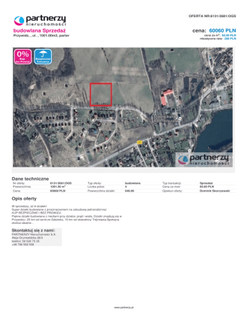 OFERTA NR:6131/2681/OGS budowlana Sprzedaż cena: 60060 PLN cena za m2: 60.00 PLN miesięczna rata: 288 PLN Przywidz, , ul. , 1001.00m2, parter Dane techniczne Nr oferty: Powierzchnia: 6131/2681/OGS 1001.00 m2 Typ oferty: Liczba pokoi: budowlana 4 Typ transakcji: Cena za metr: Sprzedaż 60.00 PLN Cena: 60060 PLN Powierzchnia działki: 646.00 Opiekun oferty: Dominik Skorczewski Opis oferty W sprzedaży, aż 6 działek! Super działki budowlane z przeznaczeniem na zabudowę jednorodzinną! KUP BEZPIECZNIE I BEZ PROWIZJI. Piękne działki budowlane z mediami przy działce: prąd i woda. Działki znajdują się w Przywidzu- 25 km od centrum Gdańska, 15 km od obwodnicy Trójmiasta.Spokojna okolica idealne... Skontaktuj się z nami: PARTNERZY Nieruchomości S.A. Aleja Grunwaldzka 28/3 telefon: 58 520 75 35 +48 798 568 568 www.partnerzy.pl Powered by TCPDF (www.tcpdf.org)