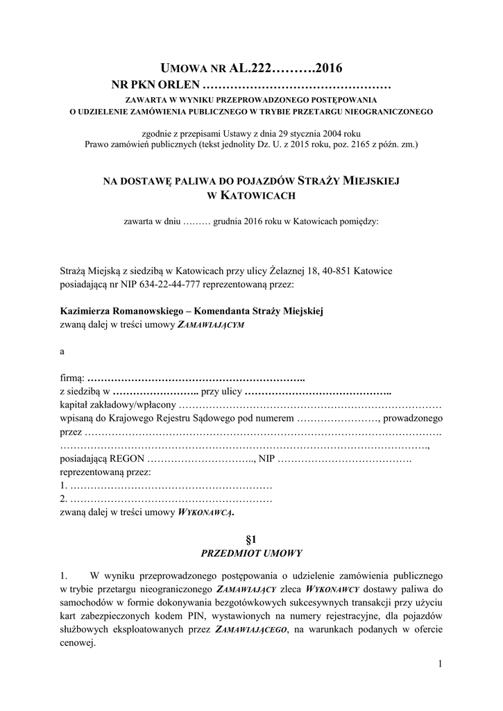 UMOWA NR AL.222……….2016 NR PKN ORLEN ………………………………………… ZAWARTA W WYNIKU PRZEPROWADZONEGO POSTĘPOWANIA O UDZIELENIE ZAMÓWIENIA PUBLICZNEGO W TRYBIE PRZETARGU NIEOGRANICZONEGO zgodnie z przepisami Ustawy z dnia 29 stycznia 2004 roku Prawo zamówień publicznych (tekst jednolity Dz. U. z 2015 roku, poz. 2165 z późn. zm.) NA DOSTAWĘ PALIWA DO POJAZDÓW STRAŻY MIEJSKIEJ W KATOWICACH zawarta w dniu ……… grudnia 2016 roku w Katowicach pomiędzy: Strażą Miejską z siedzibą w Katowicach przy ulicy Żelaznej 18, 40-851 Katowice posiadającą nr NIP 634-22-44-777 reprezentowaną przez: Kazimierza Romanowskiego – Komendanta Straży Miejskiej zwaną dalej w treści umowy ZAMAWIAJĄCYM a firmą: ……………………………………………………….. z siedzibą w …………………….. przy ulicy …………………………………….. kapitał zakładowy/wpłacony …………………………………………………………………… wpisaną do Krajowego Rejestru Sądowego pod numerem ……………………, prowadzonego przez ……………………………………………………………………………………………. ………………………………………………………………………………………………., posiadającą REGON ………………………….., NIP …………………………………. reprezentowaną przez: 1. …………………………………………………… 2. …………………………………………………… zwaną dalej w treści umowy WYKONAWCĄ. §1 PRZEDMIOT UMOWY 1. W wyniku przeprowadzonego postępowania o udzielenie zamówienia publicznego w trybie przetargu nieograniczonego ZAMAWIAJĄCY zleca WYKONAWCY dostawy paliwa do samochodów w formie dokonywania bezgotówkowych sukcesywnych transakcji przy użyciu kart zabezpieczonych kodem PIN, wystawionych na numery rejestracyjne, dla pojazdów służbowych eksploatowanych przez ZAMAWIAJĄCEGO, na warunkach podanych w ofercie cenowej. 1 Zamówienie obejmuje zakup paliwa: a. benzyny bezołowiowej w ilości 23 000 litrów, b. oleju napędowego w ilości 13 000 litrów. 3. ZAMAWIAJĄCY oświadcza, że posiada w eksploatacji 16 samochodów oraz 4 skutery. 4. Wykaz numerów rejestracyjnych pojazdów stanowi załącznik do niniejszej Umowy. 5. Nowe karty, zarówno do pojazdów obecnie eksploatowanych, jak i pojazdów planowanych do zakupu, będą wydawane ZAMAWIAJĄCEMU bezpłatnie, a w razie ich utraty WYKONAWCA wyda odpłatnie karty dodatkowe lub zamienne. W przypadku zgłoszenia utraty karty przez ZAMAWIAJĄCEGO WYKONAWCA zapewni blokadę karty w sieci punktów sprzedaży. 6. ZAMAWIAJĄCY zastrzega sobie prawo zmiany ilości kart magnetycznych w czasie trwania umowy, w zależności od liczby pojazdów znajdujących się w eksploatacji, przy zachowaniu limitu maksymalnej wartości zamówienia. 2. §2 TERMIN OBOWIĄZYWANIA I REALIZACJI 1. Zamówienie zrealizowane będzie przez okres 12 miesięcy 2017 roku – tj. od dnia 1 stycznia do dnia 31 grudnia 2017. 2. Karty magnetyczne zostaną wydane ZAMAWIAJĄCEMU w terminie 10 dni roboczych od dnia dostarczenia przez ZAMAWIAJĄCEGO WYKONAWCY wypełnionych i podpisanych wniosków o wydanie kart. §3 CENA 1. Formularz ofertowy WYKONAWCY stanowi załącznik do niniejszej UMOWY. 2. Z tytułu realizacji dostaw paliwa WYKONAWCA będzie otrzymywał wynagrodzenie będące iloczynem ilości dostarczonego paliwa oraz ceny za 1 litr paliwa obowiązującej na danej stacji paliw Wykonawcy w momencie realizacji transakcji. 3. Wartość przedmiotu umowy według ceny zaoferowanej przez WYKONAWCĘ wynosi: brutto ……………………… zł (słownie: …………………………..……………..złotych ……………………groszy), w tym VAT 23%, tj. ………………….. zł (słownie: ……………………………………………….. złotych …………………………… grosze), netto ………………………………………………. zł (słownie: ………………………………………… złote ……………………………. groszy). 4. Podane ilości paliwa są ilościami orientacyjnymi i ZAMAWIAJĄCY zastrzega sobie prawo do zakupu mniejszej ilości paliwa. 5. ZAMAWIAJĄCY dokona płatności wyłącznie za zakupione paliwo. §4 FORMA I TERMINY PŁATNOŚCI 2 1. Należność z tytułu realizacji niniejszej UMOWY będzie wypłacana WYKONAWCY na podstawie wystawianych 2 razy w miesiącu faktur, przy czym ustala się następujące okresy rozliczeniowe: od 1 do 15 dnia każdego miesiąca i od 16 do ostatniego dnia miesiąca, obejmujące ilość i cenę zatankowanego paliwa obowiązującą na danej stacji paliw Wykonawcy w momencie realizacji transakcji. Za datę sprzedaży uznaje się ostatni dzień okresu rozliczeniowego. W fakturze lub załączniku do faktury WYKONAWCA uwzględni: a. daty tankowań, b. miejsca tankowań, c. ilości tankowanego paliwa, d. ceny 1 litra paliwa, e. wartość zakupu paliwa, f. numer rejestracyjny pojazdu. 2. Należność będzie opłacana przelewem na rachunek bankowy WYKONAWCY wskazany na fakturze w terminie 14 dni od daty poprawnie wystawionej faktury VAT. 3. Wykonawca wystawi fakturę na: Nabywca: Miasto Katowice ulica Młyńska 4 40-098 Katowice NIP 634-001-01-47 Odbiorca faktury: Straż Miejska w Katowicach 40-851 Katowice ul. Żelazna 18 4. Miejscem dostarczenia faktury jest siedziba ZAMAWIAJĄCEGO – 40-851 Katowice, ulica Żelazna 18. 5. Za termin dokonania zapłaty STRONY przyjmują datę przekazania należności z rachunku bankowego ZAMAWIAJĄCEGO na rachunek bankowy WYKONAWCY. §5 WYKAZ STACJI PALIW 1. WYKONAWCA oświadcza, że posiada ………………. stacje benzynowe zlokalizowanymi na terenie całej Polski oraz ……… stacji na terenie miasta Katowice, na których możliwe będzie dokonywanie bezgotówkowych transakcji przy użyciu kart. 2. Wykaz adresów poszczególnych st