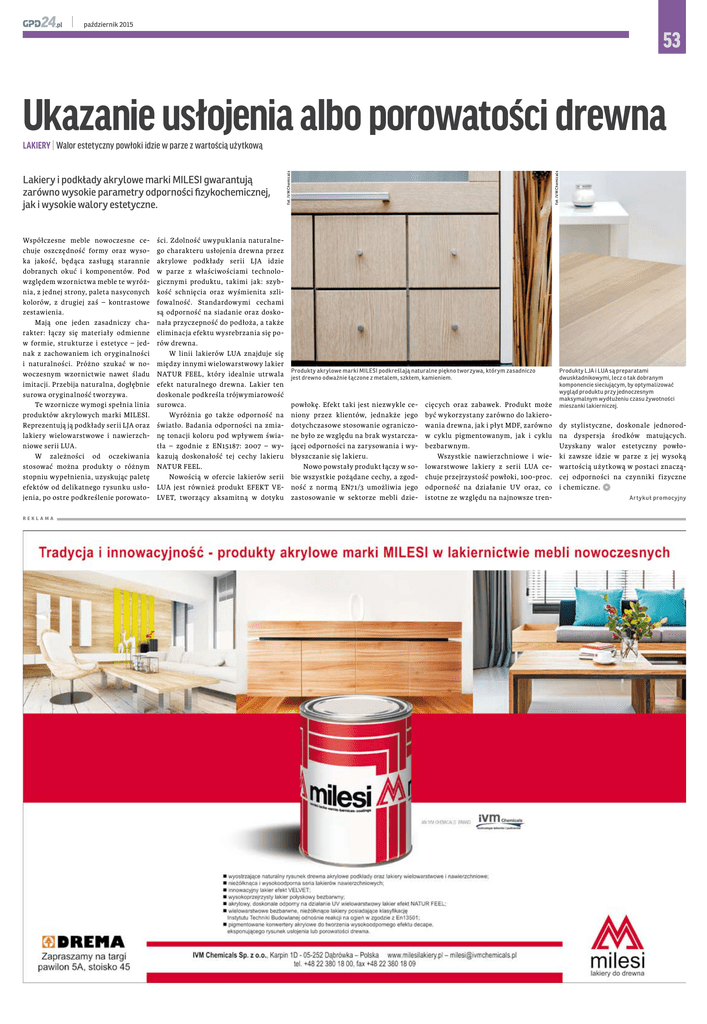 październik 2015 53 Ukazanie usłojenia albo porowatości drewna Współczesne meble nowoczesne cechuje oszczędność formy oraz wysoka jakość, będąca zasługą starannie dobranych okuć i komponentów. Pod względem wzornictwa meble te wyróżnia, z jednej strony, paleta nasyconych kolorów, z drugiej zaś – kontrastowe zestawienia. Mają one jeden zasadniczy charakter: łączy się materiały odmienne w formie, strukturze i estetyce – jednak z zachowaniem ich oryginalności i naturalności. Próżno szukać w nowoczesnym wzornictwie nawet śladu imitacji. Przebija naturalna, dogłębnie surowa oryginalność tworzywa. Te wzornicze wymogi spełnia linia produktów akrylowych marki MILESI. Reprezentują ją podkłady serii LJA oraz lakiery wielowarstwowe i nawierzchniowe serii LUA. W zależności od oczekiwania stosować można produkty o różnym stopniu wypełnienia, uzyskując paletę efektów od delikatnego rysunku usłojenia, po ostre podkreślenie porowatoREKLAMA ści. Zdolność uwypuklania naturalnego charakteru usłojenia drewna przez akrylowe podkłady serii LJA idzie w parze z właściwościami technologicznymi produktu, takimi jak: szybkość schnięcia oraz wyśmienita szlifowalność. Standardowymi cechami są odporność na siadanie oraz doskonała przyczepność do podłoża, a także eliminacja efektu wysrebrzania się porów drewna. W linii lakierów LUA znajduje się między innymi wielowarstwowy lakier NATUR FEEL, który idealnie utrwala efekt naturalnego drewna. Lakier ten doskonale podkreśla trójwymiarowość surowca. Wyróżnia go także odporność na światło. Badania odporności na zmianę tonacji koloru pod wpływem światła – zgodnie z EN15187: 2007 – wykazują doskonałość tej cechy lakieru NATUR FEEL. Nowością w ofercie lakierów serii LUA jest również produkt EFEKT VELVET, tworzący aksamitną w dotyku fot. IVM Chemicals Lakiery i podkłady akrylowe marki MILESI gwarantują zarówno wysokie parametry odporności fizykochemicznej, jak i wysokie walory estetyczne. fot. IVM Chemicals Lakiery | Walor estetyczny powłoki idzie w parze z wartością użytkową Produkty akrylowe marki MILESI podkreślają naturalne piękno tworzywa, którym zasadniczo jest drewno odważnie łączone z metalem, szkłem, kamieniem. powłokę. Efekt taki jest niezwykle ceniony przez klientów, jednakże jego dotychczasowe stosowanie ograniczone było ze względu na brak wystarczającej odporności na zarysowania i wybłyszczanie się lakieru. Nowo powstały produkt łączy w sobie wszystkie pożądane cechy, a zgodność z normą EN71/3 umożliwia jego zastosowanie w sektorze mebli dzie- cięcych oraz zabawek. Produkt może być wykorzystany zarówno do lakierowania drewna, jak i płyt MDF, zarówno w cyklu pigmentowanym, jak i cyklu bezbarwnym. Wszystkie nawierzchniowe i wielowarstwowe lakiery z serii LUA cechuje przejrzystość powłoki, 100-proc. odporność na działanie UV oraz, co istotne ze względu na najnowsze tren- Produkty LJA i LUA są preparatami dwuskładnikowymi, lecz o tak dobranym komponencie sieciującym, by optymalizować wygląd produktu przy jednoczesnym maksymalnym wydłużeniu czasu żywotności mieszanki lakierniczej. dy stylistyczne, doskonale jednorodna dyspersja środków matujących. Uzyskany walor estetyczny powłoki zawsze idzie w parze z jej wysoką wartością użytkową w postaci znaczącej odporności na czynniki fizyczne i chemiczne. l Artykuł promocyjny