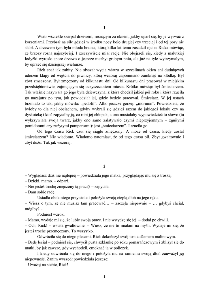 1 Wiatr wściekle szarpał drzewem, rosnącym za oknem, jakby uparł się, by je wyrwać z korzeniami. Przybrał na sile gdzieś w środku nocy koło drugiej czy trzeciej i od tej pory nie słabł. A drzewem tym była młoda brzoza, którą kilka lat temu zasadził ojciec Ricka mówiąc, że brzozy rosną najszybciej. I rzeczywiście miał rację. Nie obejrzeli się, kiedy z malutkiej łodyżki wyrosło spore drzewo o jeszcze niezbyt grubym pniu, ale już na tyle wytrzymałym, by oprzeć się dzisiejszej wichurze. Rick spał jak zabity. Nie słyszał wycia wiatru w szczelinach okien ani dudniących uderzeń klapy od wejścia do piwnicy, którą wczoraj zapomniano zamknąć na kłódkę. Był zbyt zmęczony. Był zmęczony od kilkunastu dni. Od kilkunastu dni pracował w miejskim przedsiębiorstwie, zajmującym się oczyszczaniem miasta. Krótko mówiąc był śmieciarzem. Tak właśnie nazywała go jego była dziewczyna, z którą chodził jakieś pół roku i która rzuciła go nazajutrz po tym, jak powiedział jej, gdzie będzie pracował. Śmieciarz. W jej ustach brzmiało to tak, jakby mówiła: „pedofil”. Albo jeszcze gorzej: „mormon”. Powiedziała, że byłoby to dla niej obciachem, gdyby wybrali się gdzieś razem do jakiegoś lokalu czy na dyskotekę i ktoś zapytałby ją, co robi jej chłopak, a ona musiałaby wypowiedzieć to słowo (tu wykrzywiała swoją twarz, jakby ono samo zalatywało czymś nieprzyjemnym – zgniłymi pomidorami czy zużytymi pampersami): jest „śmieciarzem”. I rzuciła go. Od tego czasu Rick czuł się ciągle zmęczony. A może od czasu, kiedy został śmieciarzem? Nie wiadomo. Wiadomo natomiast, że od tego czasu pił. Zbyt gwałtownie i zbyt dużo. Tak jak wczoraj. 2 – Wyglądasz dziś nie najlepiej – powiedziała jego matka, przyglądając mu się z troską. – Dzięki, mamo. – odparł. – Nie jesteś trochę zmęczony tą pracą? – zapytała. – Dam sobie radę. Usiadła obok niego przy stole i położyła swoją ciepłą dłoń na jego ręku. – Wiesz o tym, że nie musisz tam pracować… – zaczęła niepewnie – … gdybyś chciał, mógłbyś… Podniósł wzrok. – Mamo, wydaje mi się, że lubię swoją pracę. I nie wstydzę się jej. – dodał po chwili. – Och, Rick! – wstała gwałtownie. – Wiesz, że nie to miałam na myśli. Wydaje mi się, że jesteś trochę przemęczony. To wszystko. Odwróciła się do niego plecami. Rick dokończył swój tost z dżemem malinowym. – Będę leciał – podniósł się, chwycił pustą szklankę po soku pomarańczowym i zbliżył się do matki, by jak zawsze, gdy wychodził, cmoknąć ją w policzek. I kiedy odwróciła się do niego i położyła mu na ramieniu swoją dłoń zauważył jej niepewność. Zanim wyszedł powiedziała jeszcze: – Uważaj na siebie, Rick! 1 3 Wywożenie śmieci nie było trudnym zajęciem. Właściwie było monotonne. Ale z punktu widzenia ochrony przyrody i segregacji śmieci, było to wręcz niezbędne i godne najwyższego szacunku. I właściwie nie wiadomo dlaczego nie cieszyło się wśród społeczeństwa takim poważaniem, na jakie zasługiwało. Właściwie mimowolnie prawie każdy człowiek myśląc o śmieciarzach utożsamiał ich ze śmieciami, które zbierali i wywozili na ogromne kilkuhektarowe wysypisko osiem mil za miastem i traktował ich samych z pogardą lub co najmniej lekceważąco. Tak, jakby to oni produkowali te śmieci. Ludzie, z którymi pracował Rick, a więc Tommy Cusack, kierowca nowoczesnej śmieciarki, którą obsługiwali oraz Nort Hapmiller zdążyli się już do tego przyzwyczaić i przestali zwracać uwagę na pogardliwe spojrzenia. Co innego Rick. Wychwytywał je wszędzie, nawet tam, gdzie ich nie było i bardzo go bolały. Był przekonany, że większość ludzi uważa ich za brudasów, którzy nie używają antyperspirantów czy nici dentystycznej. Ich śmieciarka była supernowoczesnym pojazdem. Posiadała system zgniatania, dzięki któremu mogła włożyć, wysypać, sproszkować, zniszczyć i zgnieść każdego rodzaju śmieci. System ten zbudowany był z specjalnie ułożonych zębów, belek i drutów tnących. Dzięki takiej maszynie śmieci zebrane z kilkunastu pełnych pojemników po zgnieceniu zajmowały niewiele więcej miejsca, niż pudełko po butach. Rick lubił przyglądać się pracy tych urządzeń i słuchać dźwięków, jakie wydawały – brzmiało to coś, jak: „DRYYST, DRYYST, UMCA, UMCA, UMCA, ŻYZZT, ŻYZZT”. Dla uszu Ricka brzmiało to jak jakiś nowy letni przebój. Jak zwykle koło dziesiątej, kiedy opróżnili pojemniki w północnej części dzielnicy miasta robili sobie półgodzinną przerwę. Zwykle jadali „U Barny’ego”, gdzie podawano naprawdę dobrą kawę. To właśnie tam ZOBACZYŁ po raz pierwszy. Tylko wtedy jeszcze tego nie rozumiał. W barze było sporo ludzi. Tylko kilka stolików było pustych. Siedli przy jednym z nich. Tommy Cusack, jak zwykle, opowiadał różne historie, niektóre tylko głupie, a inne zupełnie kretyńskie. Tommy był Murzynem. Uwielbiał śmiać się, robić kawały i opowiadać świńskie dowcipy. Mówił na przykład tak: „A wiecie, wczoraj w autobusie był taki ścisk, że gdyby nie kobiety to nie byłoby gdzie palca włożyć…”. I większość jego dowcipów była w tym stylu. Nort był małomówny i raczej nieśmiały, ale był silny jak niedźwiedź. Dlatego był niezastąpiony. Z kawałów Tommy’ego śmiał się bezgłośnie, podnosząc tylko kąciki ust i to była cała jego reakcja. „U Barny’ego” w kącie nad barem wisiał nieduży odbiornik telewizyjny, w którym prawie na okrągło leciały teledyski różnych młodzieżowych kapel, które tylko co pół godziny były przerywane, aby nadać najświeższe wiadomości. Wiadomości czytał znany i powszechnie lubiany spiker Christopher Nolan. Nolan kiedyś był głośnym i kontrowersyjnym dziennikarzem, którego odwaga i bezkompromisowość stały si