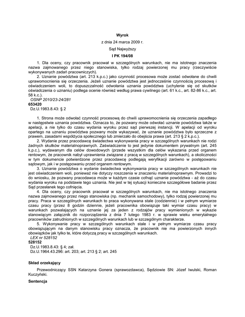Wyrok z dnia 24 marca 2009 r. Sąd Najwyższy I PK 194/08 1. Dla oceny, czy pracownik pracował w szczególnych warunkach, nie ma istotnego znaczenia nazwa zajmowanego przez niego stanowiska, tylko rodzaj powierzonej mu pracy (rzeczywiście wykonywanych zadań pracowniczych). 2. Uznanie powództwa (art. 213 k.p.c.) jako czynność procesowa może zostać odwołane do chwili uprawomocnienia się orzeczenia. Jeżeli uznanie powództwa jest jednocześnie czynnością procesową i oświadczeniem woli, to dopuszczalność odwołania uznania powództwa (uchylenie się od skutków oświadczenia o uznaniu) podlega ocenie również według prawa cywilnego (art. 61 k.c., art. 82-86 k.c., art. 58 k.c.). OSNP 2010/23-24/281 653420 Dz.U.1983.8.43: § 2 1. Strona może odwołać czynność procesową do chwili uprawomocnienia się orzeczenia zapadłego w następstwie uznania powództwa. Oznacza to, że pozwany może odwołać uznanie powództwa także w apelacji, a nie tylko do czasu wydania wyroku przez sąd pierwszej instancji. W apelacji od wyroku opartego na uznaniu powództwa pozwany może wykazywać, że uznanie powództwa było sprzeczne z prawem, zasadami współżycia społecznego lub zmierzało do obejścia prawa (art. 213 § 2 k.p.c.). 2. Wydanie przez pracodawcę świadectwa wykonywania pracy w szczególnych warunkach nie rodzi żadnych skutków materialnoprawnych. Zaświadczenie to jest jedynie dokumentem prywatnym (art. 245 k.p.c.), wydawanym dla celów dowodowych (przede wszystkim dla celów wykazania przed organem rentowym, że pracownik nabył uprawnienia związane z pracą w szczególnych warunkach), a okoliczności w tym dokumencie potwierdzone przez pracodawcę podlegają weryfikacji zarówno w postępowaniu sądowym, jak i w postępowaniu przed organem rentowym. 3. Uznanie powództwa o wydanie świadectwa wykonywania pracy w szczególnych warunkach nie jest oświadczeniem woli, ponieważ nie dotyczy roszczenia w znaczeniu materialnoprawnym. Prowadzi to do wniosku, że pozwany pracodawca może w każdym czasie cofnąć uznanie powództwa - aż do czasu wydania wyroku na podstawie tego uznania. Nie jest w tej sytuacji konieczne szczegółowe badanie przez Sąd przesłanek tego cofnięcia. 4. Dla oceny, czy pracownik pracował w szczególnych warunkach, nie ma istotnego znaczenia nazwa zajmowanego przez niego stanowiska (np. mechanik samochodowy), tylko rodzaj powierzonej mu pracy. Praca w szczególnych warunkach to praca wykonywana stale (codziennie) i w pełnym wymiarze czasu pracy (przez 8 godzin dziennie, jeżeli pracownika obowiązuje taki wymiar czasu pracy) w warunkach pozwalających na uznanie jej za jeden z rodzajów pracy wymienionych w wykazie stanowiącym załącznik do rozporządzenia z dnia 7 lutego 1983 r. w sprawie wieku emerytalnego pracowników zatrudnionych w szczególnych warunkach lub w szczególnym charakterze. 5. Wykonywanie pracy w szczególnych warunkach stale i w pełnym wymiarze czasu pracy obowiązującym na danym stanowisku pracy oznacza, że pracownik nie ma powierzonych innych obowiązków jak tylko te, które dotyczą pracy w szczególnych warunkach. LEX nr 528152 528152 Dz.U.1983.8.43: § 4; zał. Dz.U.1964.43.296: art. 203; art. 213 § 2; art. 245 Skład orzekający Przewodniczący SSN Katarzyna Gonera (sprawozdawca), Sędziowie SN: Józef Iwulski, Roman Kuczyński. Sentencja Sąd Najwyższy, po rozpoznaniu na posiedzeniu niejawnym w dniu 24 marca 2009 r. sprawy z powództwa Jana F. przeciwko "J." Ł. Spółdzielni Mleczarskiej w Ł. o odszkodowanie, wydanie świadectwa pracy w warunkach szczególnych, na skutek skargi kasacyjnej powoda od wyroku Sądu Okręgowego-Sądu Pracy i Ubezpieczeń Społecznych w Łodzi z dnia 11 września 2007 r. [...] 1. oddalił skargę kasacyjną; 2. nie obciążył powoda obowiązkiem zwrotu stronie pozwanej kosztów zastępstwa procesowego w postępowaniu kasacyjnym. Uzasadnienie faktyczne Sąd Rejonowy dla Łodzi-Śródmieścia-Sąd Pracy i Ubezpieczeń Społecznych w Łodzi wyrokiem z 28 marca 2007 r. [...] oddalił powództwo Jana F. przeciwko "J." Ł. Spółdzielni Mleczarskiej w Ł. o odszkodowanie i wydanie świadectwa pracy w szczególnych warunkach. Jan F. wniósł początkowo o uznanie za bezskuteczne wypowiedzenia umowy o pracę podnosząc, że pozwany pracodawca dokonując wypowiedzenia naruszył art. 39 k.p., ponieważ w okresie od 1970 r. do 1994 r. powód wykonywał pracę w szczególnych warunkach, określoną w pkt 16 działu XIV wykazu A stanowiącego załącznik do rozporządzenia Rady Ministrów z dnia 7 lutego 1983 r. w sprawie wieku emerytalnego pracowników zatrudnionych w szczególnych warunkach lub w szczególnym charakterze (Dz.U. Nr 8, poz. 43 ze zm.), dzięki czemu uzyskał uprawnienia do wcześniejszej emerytury i w chwili wypowiedzenia znajdował się w okresie ochronnym. W toku postępowania powód zmodyfikował powództwo, wnosząc ostatecznie o zasądzenie na jego rzecz od pozwanego pracodawcy odszkodowania w kwocie 50.000 zł za niezgodne z prawem wypowiedzenie umowy o pracę oraz o zobowiązanie pozwanego do wydania świadectwa wykonywania pracy w szczególnych warunkach, obejmującego okres od 12 maja 1970 r. do 29 maja 1992 r. Oddalając powództwo Sąd Rejonowy ustalił, że 12 maja 1970 r. powód został zatrudniony w pozwanej Spółdzielni Mleczarskiej na podstawie umowy o pracę na stanowisku montera samochodowego. Pozwana nosiła wówczas nazwę Transportowo-Usługowa Spółdzielnia Pracy "T.-M.". Od 28 kwietnia 1982 r. powodowi powierzono obowiązki brygadzisty w Stacji Obsługi [...]. Zgodnie z zakresem obowiązków powód był zobowiązany do organizowania i koordynowania pracy podległej brygady oraz nadzoru nad prawidłowym i terminowym wykonywaniem obsługi i napraw powierzonych pojazdów, instruowania podległych sobie pracowników w zakresie fachowej obsługi i napraw samochodów, wystawiania dowodów RW i ZW dla swojej brygady, wystawiania dziennych kart pracy dla podle