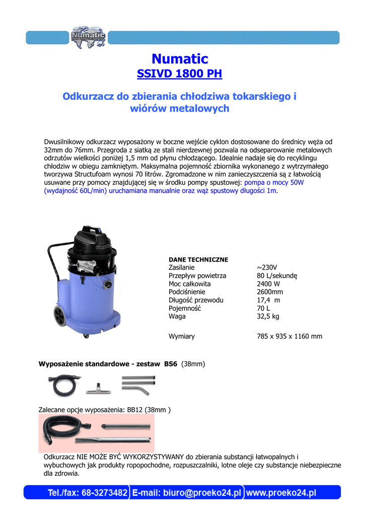 Numatic SSIVD 1800 PH Odkurzacz do zbierania chłodziwa tokarskiego i wiórów metalowych Dwusilnikowy odkurzacz wyposażony w boczne wejście cyklon dostosowane do średnicy węża od 32mm do 76mm. Przegroda z siatką ze stali nierdzewnej pozwala na odseparowanie metalowych odrzutów wielkości poniżej 1,5 mm od płynu chłodzącego. Idealnie nadaje się do recyklingu chłodziw w obiegu zamkniętym. Maksymalna pojemność zbiornika wykonanego z wytrzymałego tworzywa Structufoam wynosi 70 litrów. Zgromadzone w nim zanieczyszczenia są z łatwością usuwane przy pomocy znajdującej się w środku pompy spustowej: pompa o mocy 50W (wydajność 60L/min) uruchamiana manualnie oraz wąż spustowy długości 1m. DANE TECHNICZNE Zasilanie Przepływ powietrza Moc całkowita Podciśnienie Długość przewodu Pojemność Waga ~230V 80 L/sekundę 2400 W 2600mm 17,4 m 70 L 32,5 kg Wymiary 785 x 935 x 1160 mm Wyposażenie standardowe - zestaw BS6 (38mm) Zalecane opcje wyposażenia: BB12 (38mm ) Odkurzacz NIE MOŻE BYĆ WYKORZYSTYWANY do zbierania substancji łatwopalnych i wybuchowych jak produkty ropopochodne, rozpuszczalniki, lotne oleje czy substancje niebezpieczne dla zdrowia. Numatic SSIVD 1800 AP Odkurzacz do zbierania chłodziwa tokarskiego i wiórów metalowych Dwusilnikowy odkurzacz wyposażony w boczne wejście cyklon dostosowane do średnicy węża od 32mm do 76mm. Przegroda z siatką ze stali nierdzewnej pozwala na odseparowanie metalowych odrzutów wielkości poniżej 1,5 mm od płynu chłodzącego. Idealnie nadaje się do recyklingu chłodziw w obiegu zamkniętym. Maksymalna pojemność zbiornika wykonanego z wytrzymałego tworzywa Structufoam wynosi 70 litrów. Zgromadzone w nim zanieczyszczenia są z łatwością usuwane przy pomocy znajdującej się w środku pompy spustowej: pompa o mocy 500W (wydajność 160L/min) uruchamiana automatycznie oraz wąż spustowy długości 10m. DANE TECHNICZNE Zasilanie Przepływ powietrza Moc całkowita Podciśnienie Długość przewodu Pojemność Waga ~230V 80 L/sekundę 2400 W 2600mm 17,4 m 70 L 33,5 kg Wymiary 785 x 935 x 1160 mm Wyposażenie standardowe - zestaw BS6 (38mm) Zalecane opcje wyposażenia: BB12 (38mm ) Odkurzacz NIE MOŻE BYĆ WYKORZYSTYWANY do zbierania substancji łatwopalnych i wybuchowych jak produkty ropopochodne, rozpuszczalniki, lotne oleje czy substancje niebezpieczne dla zdrowia. Numatic SSIVD 1800 DH Odkurzacz do zbierania chłodziwa tokarskiego i wiórów metalowych Dwusilnikowy odkurzacz wyposażony w boczne wejście cyklon dostosowane do średnicy węża od 32mm do 76mm. Przegroda z siatką ze stali nierdzewnej pozwala na odseparowanie metalowych odrzutów wielkości poniżej 1,5 mm od płynu chłodzącego. Idealnie nadaje się do recyklingu chłodziw w obiegu zamkniętym. Maksymalna pojemność zbiornika wykonanego z wytrzymałego tworzywa Structufoam wynosi 70 litrów. Zgromadzone w nim zanieczyszczenia są z łatwością usuwane przy pomocy węża spustowego długości 1m. DANE TECHNICZNE Zasilanie Przepływ powietrza Moc całkowita Podciśnienie Długość przewodu Pojemność Waga ~230V 80 L/sekundę 2400 W 2600mm 15,6 m 70 L 30,5 kg Wymiary 785 x 935 x 1160 mm Wyposażenie standardowe - zestaw BS6 (38mm) Zalecane opcje wyposażenia: BB12 (38mm ) Odkurzacz NIE MOŻE BYĆ WYKORZYSTYWANY do zbierania substancji łatwopalnych i wybuchowych jak produkty ropopochodne, rozpuszczalniki, lotne oleje czy substancje niebezpieczne dla zdrowia.