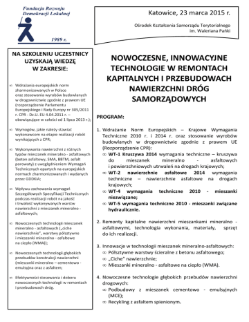 23 marca 2015 r. RozwiązaniaKatowice, informatyczne Ośrodek Kształcenia Samorządu Terytorialnego im. Waleriana Pańki NA SZKOLENIU UCZESTNICY UZYSKAJĄ WIEDZĘ W ZAKRESIE: • Wdrażania europejskich norm zharmonizowanych w Polsce oraz stosowania wyrobów budowlanych w drogownictwie zgodnie z prawem UE (rozporządzenie Parlamentu Europejskiego i Rady Europy nr 305/2011 r. CPR - Dz.U. EU 4.04.2011 r. – obowiązujące w całości od 1 lipca 2013 r.); • Wymogów, jakie należy stawiać wykonawcom na etapie realizacji robót wynikających z CPR; • Wykonywania nawierzchni z różnych typów mieszanek mineralno - asfaltowych (beton asfaltowy, SMA, BBTM, asfalt porowaty) z uwzględnieniem Wymagań Technicznych opartych na europejskich normach zharmonizowanych i wydanych przez GDDKiA; • Wpływu zachowania wymagań Szczegółowych Specyfikacji Technicznych podczas realizacji robót na jakość i trwałość wykonywanych warstw nawierzchni z mieszanek mineralno asfaltowych; • Nowoczesnych technologii mieszanek mineralno - asfaltowych („ciche nawierzchnie”, warstwy półsztywne i mieszanki mineralno - asfaltowe na ciepło (WMA)); • Nowoczesnych technologii głębokich przebudów konstrukcji nawierzchni (mieszanki mineralno – cementowo emulsyjna oraz z asfaltem; • Efektywności stosowania i doboru nowoczesnych technologii w remontach i przebudowach dróg. NOWOCZESNE, INNOWACYJNE TECHNOLOGIE W REMONTACH KAPITALNYCH I PRZEBUDOWACH NAWIERZCHNI DRÓG SAMORZĄDOWYCH PROGRAM: 1. Wdrażanie Norm Europejskich – Krajowe Wymagania Techniczne 2010 r. i 2014 r. oraz stosowanie wyrobów budowlanych w drogownictwie zgodnie z prawem UE (Rozporządzenie CPR): • WT-1 Kruszywa 2014 wymagania techniczne – kruszywa do mieszanek mineralno asfaltowych i powierzchniowych utrwaleń na drogach krajowych; • WT-2 nawierzchnie asfaltowe 2014 wymagania techniczne – nawierzchnie asfaltowe na drogach krajowych; • WT-4 wymagania techniczne 2010 - mieszanki niezwiązane; • WT-5 wymagania techniczne 2010 - mieszanki związane hydraulicznie. 2. Remonty kapitalne nawierzchni mieszankami mineralno asfaltowymi, technologia wykonania, materiały, sprzęt do ich realizacji. 3. Innowacje w technologii mieszanek mineralno-asfaltowych: • Półsztywne warstwy ścieralne z betonu asfaltowego; • „Ciche” nawierzchnie; • Mieszanki mineralno - asfaltowe na ciepło (WMA). 4. Nowoczesne technologie głębokich przebudów nawierzchni drogowych: • Podbudowy z mieszanek cementowo - emulsyjnych (MCE); • Recykling z asfaltem spienionym. SZKOLENIE SKIEROWANE DO: Pracowników wydziałów dróg, Zarządów Dróg Powiatowych, Zarządów Dróg Miejskich, Zakładów Gospodarki Komunalnej oraz firm wykonawczych. Miejsce szkolenia: Katowice, siedziba Ośrodka, ul. Mariacka 1 (II piętro). Termin i godzina: 23 marca 2015 r. godz. 10.00 – 15.00. D A N E D O K O N T A K T U : Ośrodek Kształcenia Samorządu Terytorialnego im. Waleriana Pańki 40-014 Katowice ul. Mariacka 1 NIP 5220001895 Cena: 329 zł netto/os. Udział w szkoleniu zwolniony z VAT w przypadku finansowania szkolenia ze środków publicznych. Cena zawiera materiały szkoleniowe, zaświadczenie o ukończeniu szkolenia, poczęstunek i serwis kawowy. tel/fax. 32 259 86 73, 32 253 84 09 e-mail: [email protected] RABAT 10% za każdą następną osobę zgłoszoną z tej samej instytucji. www.okst.pl OSOBA DO KONTAKTU: Barbara Tekień, tel. 32 206 98 43 w. 34, [email protected] Zgłoszenia: Wypełnioną kartę zgłoszenia należy przesłać mailem lub faksem do 18 marca 2015 r. Uwaga: Ilość miejsc ograniczona. Brak pisemnej rezygnacji do 18.03.2015 r. będzie równoznaczny z obciążeniem Państwa pełnym kosztem szkolenia. Karta zgłoszenia – kod szkolenia: 364/15/T Nazwa Nabywcy(dane do FVAT):.................................................................................………………………………………… Ulica, nr domu: ........................................... Miejscowość…………………..………………kod pocztowy………….….……….. NIP: ............................................................. Tel......................................…………e-mail………………………..……………… 1. ............................................................................................................................................................................. imię i nazwisko, (wypełnić drukowanymi) wydział/ stanowisko 2............................................................................................................................................................RABAT 10% imię i nazwisko, (wypełnić drukowanymi) wydział/ stanowisko Oświadczam, że szkolenie dla ww. pracowników jest kształceniem zawodowym finansowanym w całości lub co najmniej 70% ze środków publicznych (właściwe zaznaczyć) TAK / NIE ......…………………………………. Podpis UWAGA! Ilość miejsc ograniczona. O udziale w szkoleniu decyduje kolejność zgłoszeń. Zgłoszenie na szkolenie musi zostać potwierdzone przesłaniem do Ośrodka karty zgłoszenia. Brak pisemnej rezygnacji ze szkolenia najpóźniej na trzy dni przed terminem będzie równoznaczny z obciążeniem Państwa należnością za to szkolenie. Należność należy płacić przelewem najpóźniej 3 dni przed szkoleniem (nie dotyczy Jednostek Samorządu Terytorialnego). Na przelewie prosimy podać nazwę szkolenia lub jego numer). NR RACHUNKU: BPH: 68-10600076-0000321000197618