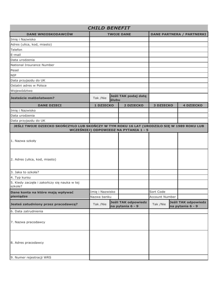 CHILD BENEFIT DANE WNIOSKODAWCÓW TWOJE DANE DANE PARTNERA / PARTNERKI Imię i Nazwisko Adres (ulica, kod, miasto) Telefon E-mail Data urodzenia National Insurance Number Pesel NIP Data przyjazdu do UK Ostatni adres w Polsce Województwo Jesteście małżeństwem? DANE DZIECI Tak /Nie Jeśli TAK podaj datę ślubu 1 DZIECKO 2 DZIECKO 3 DZIECKO 4 DZIECKO Imię i Nazwisko Data urodzenia Data przyjazdu do UK JEŚLI TWOJE DZIECKO SKOŃCZYŁO LUB SKOŃCZY W TYM ROKU 16 LAT (URODZIŁO SIĘ W 1989 ROKU LUB WCZEŚNIEJ) ODPOWIEDZ NA PYTANIA 1 - 5 1. Nazwa szkoły 2. Adres (ulica, kod, miasto) 3. Jaka to szkoła? 4. Typ kursu 5. Kiedy zaczęła i zakończy się nauka w tej szkole? Dane konta na które mają wpływać pieniądze Jesteś zatudniony przez pracodawcę? 6. Data zatrudnienia 7. Nazwa pracodawcy 8. Adres pracodawcy 9. Numer rejestracji WRS Imię i Nazwisko Sort Code Nazwa banku Account Number Tak /Nie Jeśli TAK odpowiedz na pytania 6 - 9 Tak /Nie Jeśli TAK odpowiedz na pytania 6 - 9 Jesteś aktualnie Self-employed? Jeśli TAK odpowiedz na pytania 10 - 11 Tak /Nie Tak /Nie Jeśli TAK odpowiedz na pytania 10 - 11 10. Data rozpoczęcia prywatnej działalności 11. Tax reference Czy kiedykolwiek pracowałeś w UK? Pracowałeś w Polsce? Tak / Nie Tak / Nie Tak / Nie Jeśli TAK odpowiedz na pytania 12 - 14 Tak / Nie Jeśli TAK odpowiedz na pytania 12 - 14 Tak / Nie Jeśli TAK odpowiedz na pytanie 15 Tak / Nie Jeśli TAK odpowiedz na pytanie 15 12. Nazwa pracodawcy 13. Adres pracodawcy 14. Od kiedy - do kiedy Pobierałeś w Polsce zasiłki? 15. Wymień zasiłki Daty (od/do), i kto je wypłacał (np. ZUS, MOPS) DODATKOWE INFORMACJE, UWAGI NIE ZAPOMNIJ DOŁĄCZYĆ AKTÓW URODZENIA DZIECI !!!