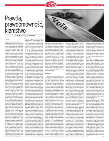 nr 215 - LUTY 2015 17 Prawda, prawdomówność, kłamstwo ANDRZEJ C. LESZCZYŃSKI Prawda W potocznej świadomości kłamstwo pojmowane jest zazwyczaj jako przeciwieństwo prawdy. Taka opozycja miesza jednak dwie odmienne płaszczyzny: epistemologiczną i moralną1/. Przeciwieństwem prawdy jest fałsz; obydwie te kategorie w tradycji greckiej (άλήθεια – ψεῦδος) i rzymskiej (vēritās – falsum) mówią o wiedzy. Á λήθεια to cecha έπιστήμη, choć czasami była też przypisywana bytowi (φūσιζ). Całkowicie ontologiczny sens zachowuje prawda (emet, )תמאw tradycji judajskiej: jako solidność, niezmienność i wierność jest cechą Jahwe ()הוהי. Prawda ontologiczna jest dla człowieka nieuchwytna – wymagałaby wiedzy dotyczącej całości bytu, co jest z gruntu niemożliwe. Aby coś było prawdziwe, pisze Leszek Kołakowski, musi istnieć podmiot nieomylny. „Ten podmiot musi być też wszechwiedzący; podmiot, który posiadając wiedzę fragmentaryczną cieszyłby się w jej granicach doskonałą pewnością, jest nie do pojęcia. Żadna bowiem prawda częściowa nie może nieść doskonałej pewności, jeśli nie odwołuje się do całej prawdy”2/. Słowom Jezusa: „[…] poznajcie prawdę, a prawda was wyzwoli” (J 8, 32) przeciwstawia się bezradne pytanie Piłata: „Cóż to jest prawda?” (J 18, 38). Bezradność tę – jeśli nie była łatwą wymówką – zdaje się rozumieć św. Paweł, gdy pisze w Hymnie o miłości: „Po części bowiem tylko poznajemy/ i po części prorokujemy./ Gdy zaś przyjdzie to, co jest doskonałe,/ zniknie to, co jest tylko częściowe” (1 Kor 13, 9-10). Czysto epistemologiczny sens prawdy podważany jest w pewnych interpretacjach tradycji greckiej, które pojęcie prawdy odnoszą nie do wiedzy, ale do bytu „odsłaniającego się”. Właśnie tak w Sein und Zeit czyta termin άλήθεια Martin Heidegger. „Nie chodzi o wykazanie zgodności poznawania i przedmiotu […]. Wykazane ma być wyłącznie bycie-odkrytym bytu samego. […] To, że wypowiedź jest prawdziwa, znaczy: odkrywa ona byt w nim samym. Wypowiada ona, ukazuje, »pozwala widzieć« byt w jego odkrytości”3/. Władysław Stróżewski tak rozumianą prawdę określa mianem „metafizycznej”; znajduje ją u Parmenidesa (poznanie prowadzi jednocześnie do prawdy i bytu), częściowo u św. Tomasza z Akwinu, także u Edmunda Husserla (bycie danym w bezpośredniej naoczności)4/. Epistemologiczne pojęcie prawdy było różnie konkretyzowane i interpretowane, w związku z czym powstało kilka wyrazistych koncepcji dotyczących tej kwestii. Koncepcja klasyczna, sformułowana przez Arysto- telesa ze Stagiry, mówi o zgodności (adekwatności, korespondencji) myśli (sądów) z rzeczywistością. W Metafizyce wyraża to filozof w sposób, który nie może nie trafić do elementarnego poczucia oczywistości. „Bowiem mówić, że to, co jest, nie jest, a to, co nie jest, jest, to fałsz, zaś mówić, że to, co jest, jest, a to, co nie jest, nie jest, to prawda”5/. Oczywistość i prostota tej formuły nie uchroniła jej przez zarzutami. Krytyka dotyczyła istoty zgodności: w jaki sposób myśl może być zgodna z rzeczywistością, skoro jest tylko jej reprezentacją i stanowi byt odmiennego rodzaju. Zwracano też uwagę na brak jasno sformułowanych kryteriów tak rozumianej prawdy. Kolejna koncepcja, koherencyjna – łączona z nazwiskiem Francisa Herberta Bradley`a – odwołuje się do zgodności sądu nie z rzeczywistością, lecz z innymi sądami przyjętymi w ramach danego systemu twierdzeń. Mówi o związku wewnętrznym, harmonijnym sąsiedztwie (cohaerentia). Koncepcję tę cechują elegancja i hermetyzm, trudne do pogodzenia z koniecznością wprowadzania do systemu sądów nowych, bywa że brutalnie sprzecznych z uznanymi za prawdziwe. Emil Cioran uznawał system za najgorszą formę despotyzmu w filozofii: „System jest tyranią, uduszeniem, ślepym zaułkiem”6/. Koncepcja utylitarystyczna ugruntowała się wśród pragmatystów (William James, John Dewey). Za sądy prawdziwe uznaje te, które okazują się przydatne (ūtilis) dla działań zaspokajających potrzeby (πρᾶγμα). Zarzuty wobec tego stanowiska koncentrują się wokół możliwej arbitralności w określaniu użyteczności, interesów i potrzeb. Można sobie wyobrazić sytuację, w której prawa ściśle ogólne zastąpione zostaną przez dowolną liczbę jednostkowych praw naukowych. Teoria oczywistości (ewidencji) uznaje za prawdziwe takie sądy, których nie sposób odrzucić bez pogwałcenia rozumu. Zdaniem Kartezjusza oczywiste jest to, co jawi się jako jasne i wyraźne (clare et distincte): ujawniające wewnętrzną zawartość i odróżniające się od tego, co zewnętrzne. Heinrich Rickert wiązał oczywistość z normą wywołującą poczucie powinności. Krytyka powyższej koncepcji dotyczy subiektywnego, intuicjonistycznego jej charakteru i niemożności obiektywizacji tego rodzaju doznań. Gdy dodać do tego koncepcje zgody powszechnej (mającej przekroczyć subiektywizm intuicjonizmu na rzecz intersubiektywizmu), konsensualizmu (szukającego prawdy w relacji dialogicznej o cechach sokratejskich) czy zdrowego rozsądku Thomasa Reida (common sense) – można zobaczyć, jak dalece niewy- starczająca dla określenia prawdy okazała się klasyczna teoria arystotelesowska. Semantyka logiczna broni się przed różnorodnymi interpretacjami epistemologicznymi, a także przed paradoksami takimi, jak antynomia kłamcy, budując definicję formalną (jej twórcą jest Alfred Tarski7/). Zgodnie z tą definicją wyrażenie W jest prawdziwe w dziedzinie D = [X, p1, …, pr] przy rozumieniu predykatów P1, …, Pn jako nazw relacji p1, …, pn wtedy i tylko wtedy, gdy każdy ciąg przedmiotów zbioru X spełnia W w D przy powyższym rozumieniu predykatów. Definicja ta opiera się na odróżnieniu języka i metajęzyka (zdanie: „Warszaw