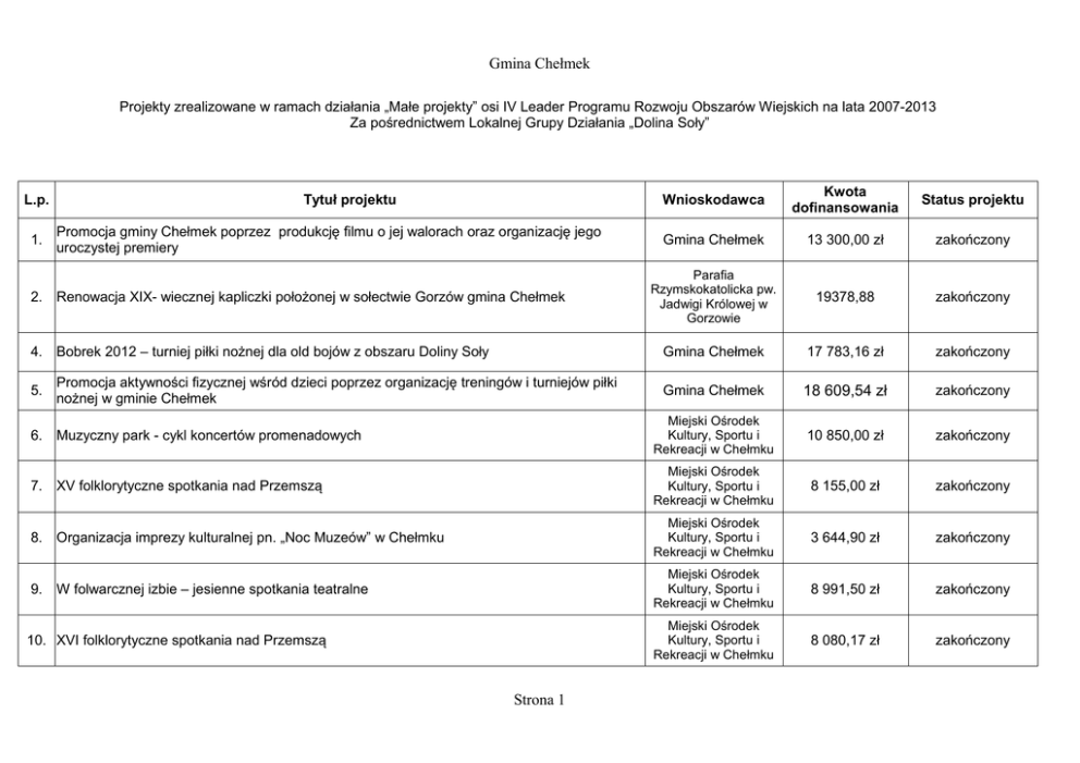 Gmina Chełmek Projekty zrealizowane w ramach działania „Małe projekty” osi IV Leader Programu Rozwoju Obszarów Wiejskich na lata 2007-2013 Za pośrednictwem Lokalnej Grupy Działania „Dolina Soły” Wnioskodawca Kwota dofinansowania Status projektu Gmina Chełmek 13 300,00 zł zakończony Parafia Rzymskokatolicka pw. Jadwigi Królowej w Gorzowie 19378,88 zakończony Gmina Chełmek 17 783,16 zł zakończony Gmina Chełmek 18 609,54 zł zakończony 6. Muzyczny park - cykl koncertów promenadowych Miejski Ośrodek Kultury, Sportu i Rekreacji w Chełmku 10 850,00 zł zakończony 7. XV folklorytyczne spotkania nad Przemszą Miejski Ośrodek Kultury, Sportu i Rekreacji w Chełmku 8 155,00 zł zakończony 8. Organizacja imprezy kulturalnej pn. „Noc Muzeów” w Chełmku Miejski Ośrodek Kultury, Sportu i Rekreacji w Chełmku 3 644,90 zł zakończony 9. W folwarcznej izbie – jesienne spotkania teatralne Miejski Ośrodek Kultury, Sportu i Rekreacji w Chełmku 8 991,50 zł zakończony Miejski Ośrodek Kultury, Sportu i Rekreacji w Chełmku 8 080,17 zł zakończony L.p. 1. Tytuł projektu Promocja gminy Chełmek poprzez produkcję filmu o jej walorach oraz organizację jego uroczystej premiery 2. Renowacja XIX- wiecznej kapliczki położonej w sołectwie Gorzów gmina Chełmek 4. Bobrek 2012 – turniej piłki nożnej dla old bojów z obszaru Doliny Soły 5. Promocja aktywności fizycznej wśród dzieci poprzez organizację treningów i turniejów piłki nożnej w gminie Chełmek 10. XVI folklorytyczne spotkania nad Przemszą Strona 1 Gmina Chełmek 11. Nie znamy nudy – cykl zajęć warsztatowych dla dzieci i młodzieży 12. BATA-lia - konferencja popularno-naukowa poświęcona znaczeniu firmy "Bata" dla rozwoju Chełmka oraz przemysłu obuwniczego w Polsce 13. Muzyka Jedną Wielką Rodziną 14. Chełmek biega 15. Doposażenie istniejącego placu zabaw przy ul. Mickiewicza w Chełmku Gmina Chełmek 24 452,16 zł w trakcie oceny Miejski Ośrodek Kultury, Sportu i Rekreacji w Chełmku 7984,00 w trakcie oceny OSP Chełmek 39198,82 w trakcie oceny Miejski Ośrodek Kultury, Sportu i Rekreacji w Chełmku 5568,00 w trakcie oceny Gmina Chełmek 50 000,00 zł w trakcie oceny 235 996,13 zł Strona 2 Gmina Brzeszcze Projekty zrealizowane w ramach działania „Małe projekty” osi IV Leader Programu Rozwoju Obszarów Wiejskich na lata 2007-2013 za pośrednictwem Lokalnej Grupy Działania „Dolina Soły” L.p. Tytuł projektu Wnioskodawca Kwota Status projektu dofinansowania 1. Integracja i rekreacja nad wodą - by żyło się lepiej - projekt edukacyjno-integracyjny z zakresu przyrody, filmu i praw człowieka dla mieszkańców gminy Brzeszcze Towarzystwo Wędkarskie Sazan 25 000,00 zł zakończony 2. Kącik regionalny u Krystyny - projekt inicjujący powstanie regionalnej izby zachowującej lokalne zasoby kulturowe i historyczne Krystyna BlamekHyrkiel 25 000,00 zł zakończony 3. Prace konserwacyjne przy kapliczce Św. Anny Samotrzeć w Brzeszczach Gmina Brzeszcze 15 716,65 zł zakończony 4. Prace konserwacyjne przy kapliczce - krzyżu tzw. Tyrnówce w Brzeszczach Gmina Brzeszcze 18 093,00 zł zakończony 5. Prace renowacyjne przy pomniku ku czci ofiar podobozu Jawischowitz w Brzeszczach Gmina Brzeszcze 16 749,00 zł zakończony 6. Zdrowo bo sportowo - projekt promujący i aktywizujący zdrowy i aktywny tryb życia wśród mieszkańców gminy Brzeszcze Ośrodek Kultury w Brzeszczach 15 487,02 zł zakończony 7. Ekstremalne Brzeszcze - stop dopalaczom! Mamy własną adrenalinę Ośrodek Kultury w Brzeszczach 19 543,97 zł zakończony 8. Sport zdrową drogą do rozwoju - zajęcia sportowe ogólnorozwojowe dla dzieci w wieku szkolnym Ludowy Klub Sportowy w Przecieszynie 5 703,72 zł zakończony 9. Kulturoskop – edukacja kulturalna, promocja lokalnej twórczości artystycznej oraz organizacja wydarzeń i konkursów kulturalnych Ośrodek Kultury w Brzeszczach 22 118,37 zł zakończony 10. Baba potrafi… czyli mobilizowanie nie tylko przez czytanie - projekt edukacyjnokulturalno-integracyjny dla kobiet z terenu LSR Ośrodek Kultury w Brzeszczach 18 923,00 zł zakończony Strona 3 Gmina Brzeszcze 11. Szczęśliwa rodzina na Wyspie Szkrabów – doposażenie placu zabaw na Osiedlu Słowackiego w Brzeszczach Gmina Brzeszcze 48 592,81 zł umowa 12. Rodzinnie – aktywnie – doposażenie placu zabaw na Osiedlu Szymanowskiego w Brzeszczach Gmina Brzeszcze 49 925,50 zł umowa 13. MAGICZNY OGRÓD – zakup oraz montaż elementów małej architektury takich jak zestaw zabawowy, huśtawki, karuzele, bujaki sprężynowe Ludowy Klub Sportowy w Przecieszynie 17 581,04 zł umowa „Ruch – moja pasja” - projekt promujący i aktywizujący zdrowy i aktywny tryb życia 14. wśród mieszkańców obszaru LSR przy wykorzystaniu nowoczesnych zajęć i wydarzen sportowych Ośrodek Kultury w Brzeszczach 29 734,85 zł w trakcie oceny 15. Modernizacja placu zabaw w Brzeszczach – Borze Gmina Brzeszcze 48 365,22 zł w trakcie oceny 16. Qltowe czytanie... bo wszystko zaczyna się od czytania – projekt edukacyjno-kulturalny dla rodzin z terenu LGD Ośrodek Kultury w Brzeszczach 13 639,28 zł w trakcie oceny 17. PASJONACI – INWAZJA POMYSŁÓW – projekt rekreacyjno-kulturalny dla mieszkańców obszaru LGD Ośrodek Kultury w Brzeszczach 37 691,08 zł w trakcie oceny 18. Spotkać się jest pięknie – projekt edukacyjno-kulturalny skierowany do mieszkańców LGD ze szczególnym uwzględnieniem osób niepełnosprawnych Towarzystwo Wędkarskie Sazan 41 918,40 zł w trakcie oceny 469 782,91 zł Strona 4 Gmina Kęty Projekty zrealizowane w ramach działania „Małe projekty” osi IV Leader Programu Rozwoju Obszarów Wiejskich na lata 2007-2013 za pośrednictwem Lokalnej Grupy Działania „Dolina Soły” L.p. Tytuł projektu Wnioskodawca 1. Dawne i współczesne obiekty sakralne Ziemi Kęckiej Stanisław Cader 2. Ogólnopolski Festiwal – Folklorystyczne Dni Przyjaźni – od Bałtyku po Tatry 3. Kwota Status p