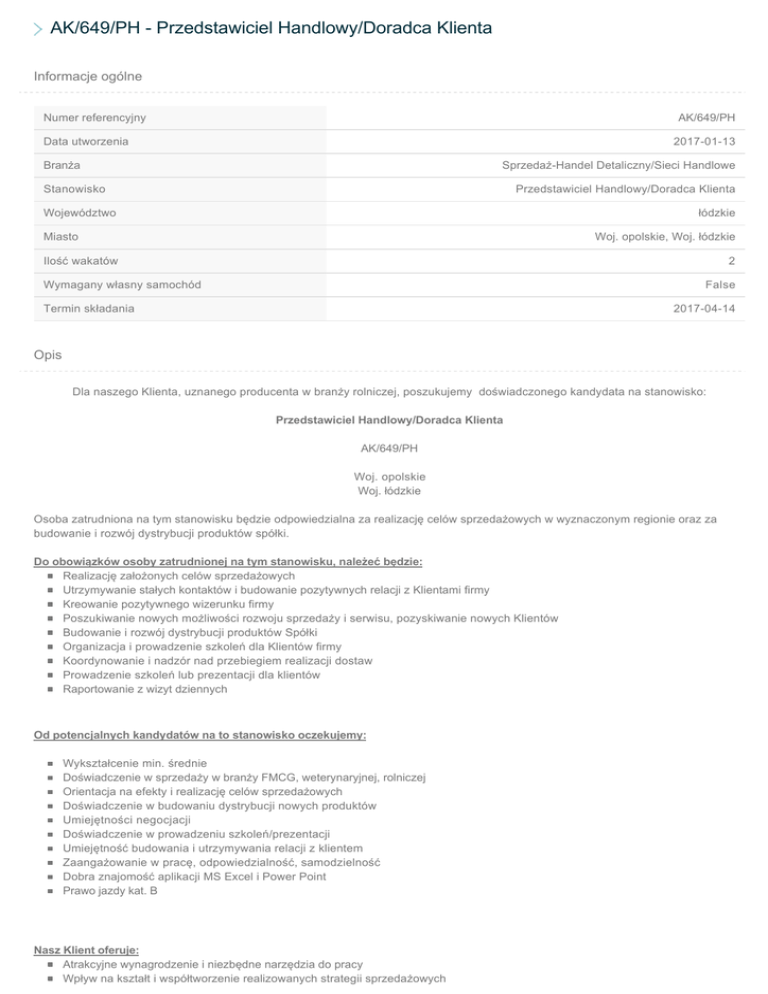 AK/649/PH - Przedstawiciel Handlowy/Doradca Klienta