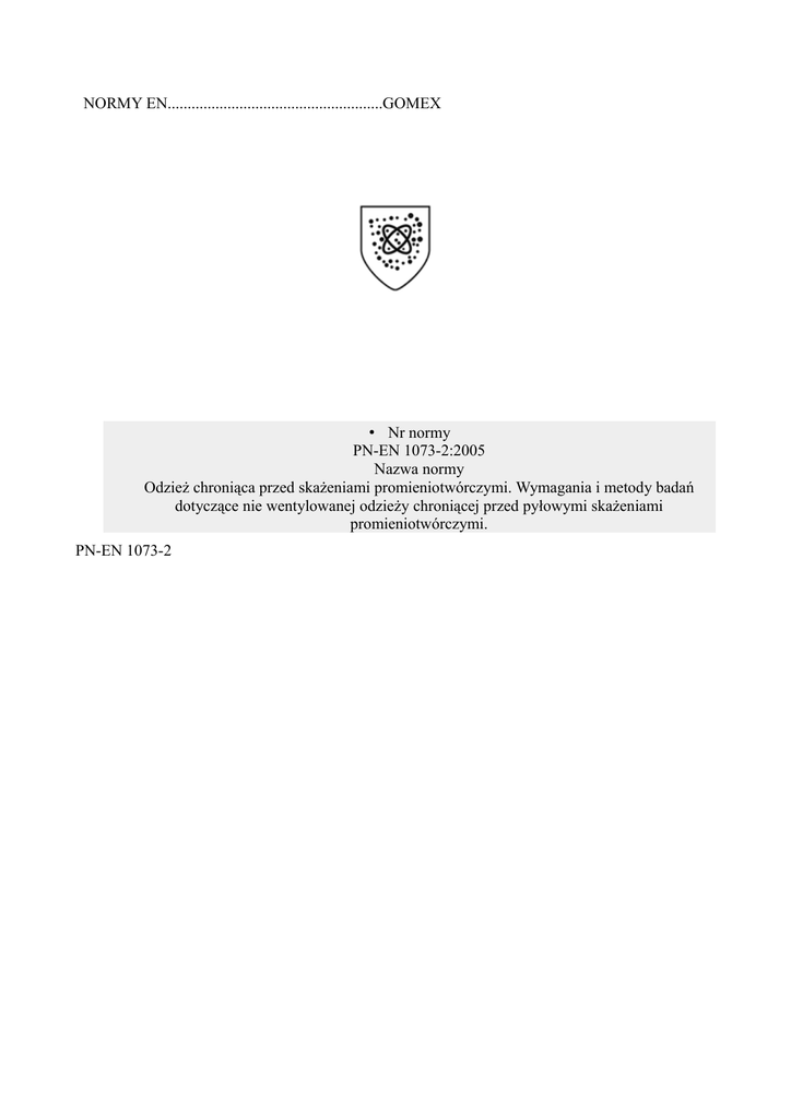 NORMY EN......................................................GOMEX • Nr normy PN-EN 1073-2:2005 Nazwa normy Odzież chroniąca przed skażeniami promieniotwórczymi. Wymagania i metody badań dotyczące nie wentylowanej odzieży chroniącej przed pyłowymi skażeniami promieniotwórczymi. PN-EN 1073-2