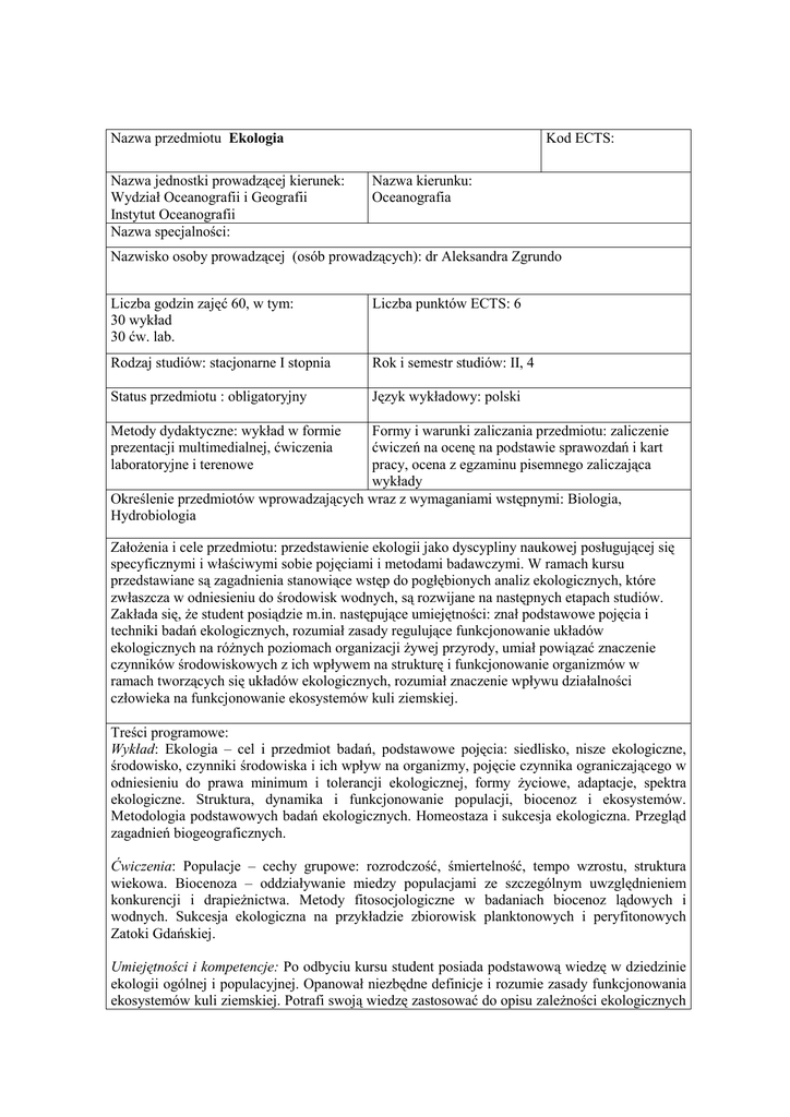 Nazwa przedmiotu Ekologia Nazwa jednostki prowadzącej kierunek: Wydział Oceanografii i Geografii Instytut Oceanografii Nazwa specjalności: Kod ECTS: Nazwa kierunku: Oceanografia Nazwisko osoby prowadzącej (osób prowadzących): dr Aleksandra Zgrundo Liczba godzin zajęć 60, w tym: 30 wykład 30 ćw. lab. Liczba punktów ECTS: 6 Rodzaj studiów: stacjonarne I stopnia Rok i semestr studiów: II, 4 Status przedmiotu : obligatoryjny Język wykładowy: polski Metody dydaktyczne: wykład w formie prezentacji multimedialnej, ćwiczenia laboratoryjne i terenowe Formy i warunki zaliczania przedmiotu: zaliczenie ćwiczeń na ocenę na podstawie sprawozdań i kart pracy, ocena z egzaminu pisemnego zaliczająca wykłady Określenie przedmiotów wprowadzających wraz z wymaganiami wstępnymi: Biologia, Hydrobiologia ZałoŜenia i cele przedmiotu: przedstawienie ekologii jako dyscypliny naukowej posługującej się specyficznymi i właściwymi sobie pojęciami i metodami badawczymi. W ramach kursu przedstawiane są zagadnienia stanowiące wstęp do pogłębionych analiz ekologicznych, które zwłaszcza w odniesieniu do środowisk wodnych, są rozwijane na następnych etapach studiów. Zakłada się, Ŝe student posiądzie m.in. następujące umiejętności: znał podstawowe pojęcia i techniki badań ekologicznych, rozumiał zasady regulujące funkcjonowanie układów ekologicznych na róŜnych poziomach organizacji Ŝywej przyrody, umiał powiązać znaczenie czynników środowiskowych z ich wpływem na strukturę i funkcjonowanie organizmów w ramach tworzących się układów ekologicznych, rozumiał znaczenie wpływu działalności człowieka na funkcjonowanie ekosystemów kuli ziemskiej. Treści programowe: Wykład: Ekologia – cel i przedmiot badań, podstawowe pojęcia: siedlisko, nisze ekologiczne, środowisko, czynniki środowiska i ich wpływ na organizmy, pojęcie czynnika ograniczającego w odniesieniu do prawa minimum i tolerancji ekologicznej, formy Ŝyciowe, adaptacje, spektra ekologiczne. Struktura, dynamika i funkcjonowanie populacji, biocenoz i ekosystemów. Metodologia podstawowych badań ekologicznych. Homeostaza i sukcesja ekologiczna. Przegląd zagadnień biogeograficznych. Ćwiczenia: Populacje – cechy grupowe: rozrodczość, śmiertelność, tempo wzrostu, struktura wiekowa. Biocenoza – oddziaływanie miedzy populacjami ze szczególnym uwzględnieniem konkurencji i drapieŜnictwa. Metody fitosocjologiczne w badaniach biocenoz lądowych i wodnych. Sukcesja ekologiczna na przykładzie zbiorowisk planktonowych i peryfitonowych Zatoki Gdańskiej. Umiejętności i kompetencje: Po odbyciu kursu student posiada podstawową wiedzę w dziedzinie ekologii ogólnej i populacyjnej. Opanował niezbędne definicje i rozumie zasady funkcjonowania ekosystemów kuli ziemskiej. Potrafi swoją wiedzę zastosować do opisu zaleŜności ekologicznych na róŜnych poziomach organizacji przyrody. Wykaz literatury - podstawowej: Begon M., Townsens C.R., Harper J.L., 2006, Ecology – From Individuals to Ecosystems, Blackwell Publishing Ltd. Krebs Ch.J., 1997, Ekologia, Wyd. PWN, Warszawa Mackenzie A., Ball A., Virdee S.R., 2000, Ekologia, Krótkie wykłady, PWN, Warszawa, Odum E.P., 1973, Podstawy ekologii, Wyd. PWRiL, Warszawa Trojan P.,1975, Ekologia ogólna, Wyd. PWN, Warszawa - uzupełniającej: Begon M., Mortimer M., 1989, Ekologia populacji (studium porównawcze zwierząt i roślin), Wyd. PWRiL, Warszawa Falińska K., 1996, Ekologia roślin, (Podstawy teoretyczne, populacja, zbiorowisko, procesy), Wyd. PWN, Warszawa Kajak Z., 1998, Hydrobiologia-Limnologia. Ekosystemy wód śródlądowych. Wyd. PWN, Warszawa Kawecka B., Eloranta P.N., 1994, Zarys ekologii glonów i środowisk śródlądowych. PWN, Warszawa. Kershaw, Kenneth A., 1978, Ilościowa i dynamiczna ekologia roślin, Wyd. PWN, Warszawa Kurnatowska A. (red.), 2001, Ekologia, Wydawnictwo Naukowe PWN, Warszawa, Lampert W., Sommer U., 1996, Ekologia wód śródlądowych, Wyd. PWN, Warszawa Łabno G., 2006, Ekologia. Ilustrowana encyklopedia, Wyd. Europa, Warszawa Pianka E., 1981, Ekologia ewolucyjna, PWN, Warszawa, Strzałko J., Mosso-Pietraszewska T. (red.), 2001, Kompendium wiedzy o ekologii, PWN, Warszawa Stugren B., 1973, Zasady ekologii ogólnej, Wyd. PWN, Warszawa Weiner J., 2005, śycie i ewolucja biosfery, Wydawnictwo Naukowe PWN, Warszawa